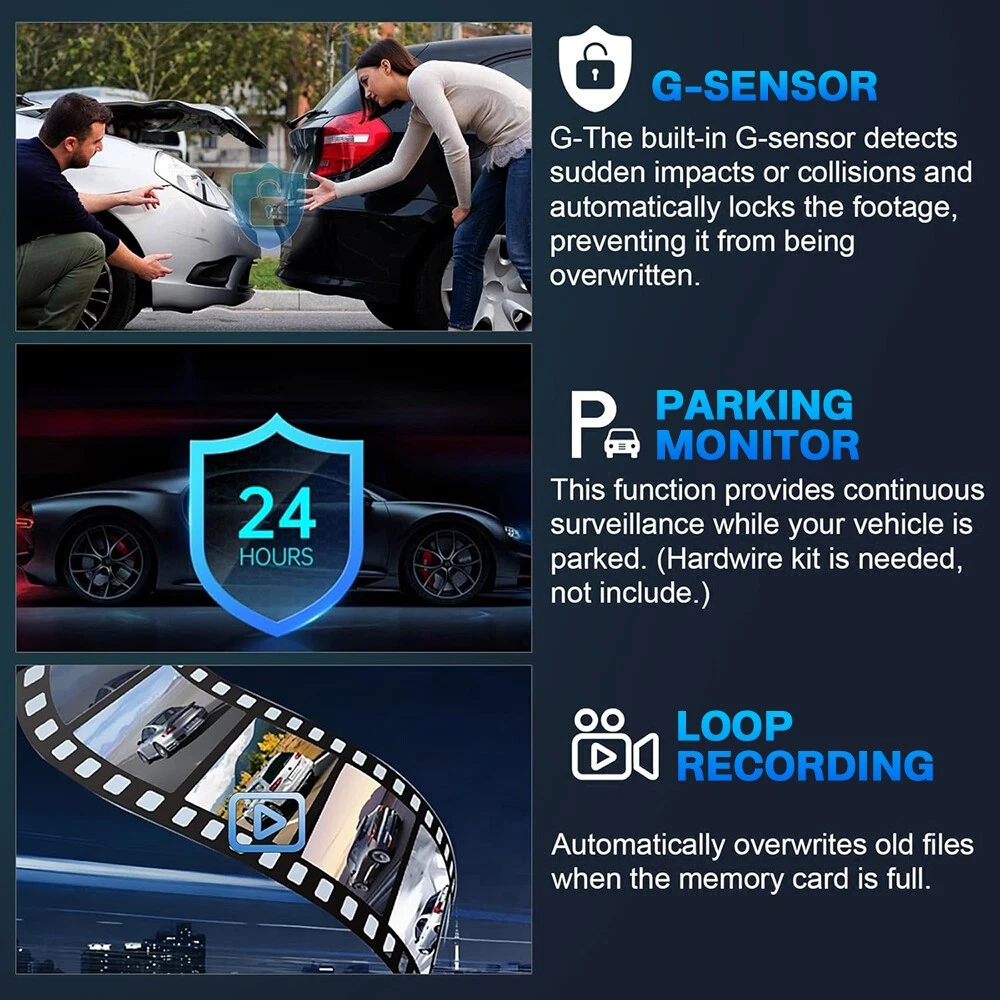 Pshcanyin DESCRIPTION PAYMENT SHIPPING RETURN POLICY CONTACT US 360 Degree View 4 Channel Dash Cam Front and Rear Inside Left Right, Dash Camera 4 Channel Dash Cam+64G Card Features: 360° All Sides Dash Cam 4 Channel: The dash camera does not obstruct your field of view and dash cam front and rear can be rotated and adjusted angles, ensuring 360° full protection. Dash cam simultaneously monitors the front, inside rear of the vehicle, helps you avoid potential liability issues and accidents. 4 View Cameras, 4 screens in one: This dash cam has 4 views of display, front view camera: record the scene of driving forward; rear view camera: record the scene behind the car; 2 in-car cameras: record the driver and the inside of the car Scenes. 4 cameras can record and display on the screen simultaneously. The reversing assist line helps to park better. HD Resolution- 3.16-inch screen, sensitive operation, HD resolution can capture more details, reduce recording blind spots, ensure your safety, and meet the recording needs of every driver. Clear images and great playback experience. Super Night Vision & Wide Dynamic Range: Dash cam with 8 LED infrared and wide dynamic range to prevent overexposure caused by headlights, and auto-adjust the balance in low light or exposure. It detects sudden changes in brightness, and automatically adjusts brightness for clear recording. (Long press the up button to open) G-Sensor Dashcams: Car dash camera built-in sensitivity G-sensor can automatically detects a sudden shake/collision and locks the footage to prevent the video from being overwrote even in loop recording. When an event is detected on the road, it automatically locks and protects the relevant footage, saving it in the "Event" folder for quicker access to locked video files. Loop Recording: Every 1-5 min loop recording(Optional), the oldest videos will be overwritten, when the SD card is full. Adjustable Interior Camera- The left and right lenses support up and down adjustment of 160 ° and front and back adjustment of 180 °, and can be manually adjusted to change the shooting direction. Ensure 360-degree video recording without blind spots. 24 Hours Parking Monitoring: While your car is parked and the engine is off the dual dash cam front and inside auto-start and record a short video once it detects bumps by someone in parking, these videos will be saved & locked, thus providing you with video evidence.(You need to purchase a hardware kit connected to enable 24/7 parking monitoring, Not included.) Specification: Main lens pixel: 2MP Main lens resolution: 1920*1080P Video frame rate: 30fps Main lens Angle: 170° Left and right rear lens resolution: 1280×720P Left and right lens Angle: 110° Left and right lens selection adjustment: up and down 160°, front and back 180° rotation Rear lens Angle: 120° Video format: AVI Screen size: 3.0 inches Screen resolution: 800*480 Features: 4 lens recording, left and right lens Angle adjustment G-Sensor (Gravity sensing) : Yes (automatic lock recording) Loop recording: Supported 24H Parking monitoring: Support (need to purchase a hardware kit to use, the power cord can not be 24H monitoring) Memory Card: 64GB Memory card expansion: Support 8-128G memory card (not included) Recording: Video tape recording (can be turned off) Hotspot WIFI: Non Power input: 8-24V Power output: 5V 2A Battery capacity: 150 mAh Power cable length: about 3.5 meters Astern lens cable length: about 5.5 meters Installation method: Sucker bracket installation Material: ABS Main size: length 160MM* height 50MM* thickness 43MM Package Included: 1 x Dash Cam 1 x Cigarette Port Power Cord 1 x Rear Camera Kit 1 x Mounting bracket 1 x 64G TF Card 1 x Instruction manual 4 Channel Dash Cam WIFI Type Description: 4 Channel Dash Camera: The 4 Channel dash cam has 4 lenses that all capable of recording 1080P video simultaneously.It can capture the front, rear, left and right sides of the vehicle simultaneously.The lenses can adjust the shooting angle so you can capture more details as you like.It can easily cover 360 degrees and ensuring that there is no dead angle around the car. Loop Recording & G-sensor Function: The 360-degree dash camera for cars has standard features like G-sensor and loop recording.When the memory card reaches its maximum storage capacity, the oldest unlocked film will be automatically deleted.Loop recording enables for continuous recording.When there are unexpected collisions or impacts, the integrated G-sensor automatically locks and preserves video footage as proof.The locked file won't be overwritten by loop recording. Super Night Vision: With WDR capabilities, our car dash cam guarantees clear and detailed footage in low-light conditions, making it a reliable companion for nighttime driving.It detects sudden changes in brightness and automatically adjusts brightness for clear recording.(Note: If the night vision is on, the camera image of left and right would be black and white only) 24 Hours Parking Mode: When you park and turn off your vehicle, the 4 channel dashcam will automatically switch to parking mode and enabling 24-hour surveillance recording.The camera for car automatically record video 1 minute, providing 24 hours protection for your car.The 4 channel dash cam should be connected to the hardwire kit at all times or an external battery. Easy Installation & 360° Coverage: The camera is very easy to install and use with the help of the reference images in our user manual.Our 4-channel dash cam features four high-definition lenses that provide complete coverage with a 170° front view, 140° rear view and dual 140° side views that ensuring the recording cam is no dead angle and capturing the situation of your car inside and outside. Specifications: Name: Four Record Driving Recorder Material: ABS Size: 17.3x5.7x4.5cm (6.81x2.24x1.88inch) Display Screen: 3.0 inch Pixel: 1920 x 1080P Main Lens Angle: 170° Left & Right Lens Angle: 140° Rear Lens Angle: 140°