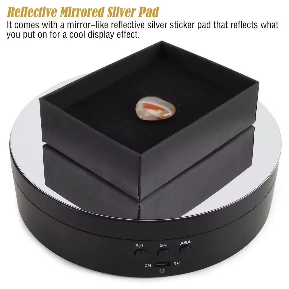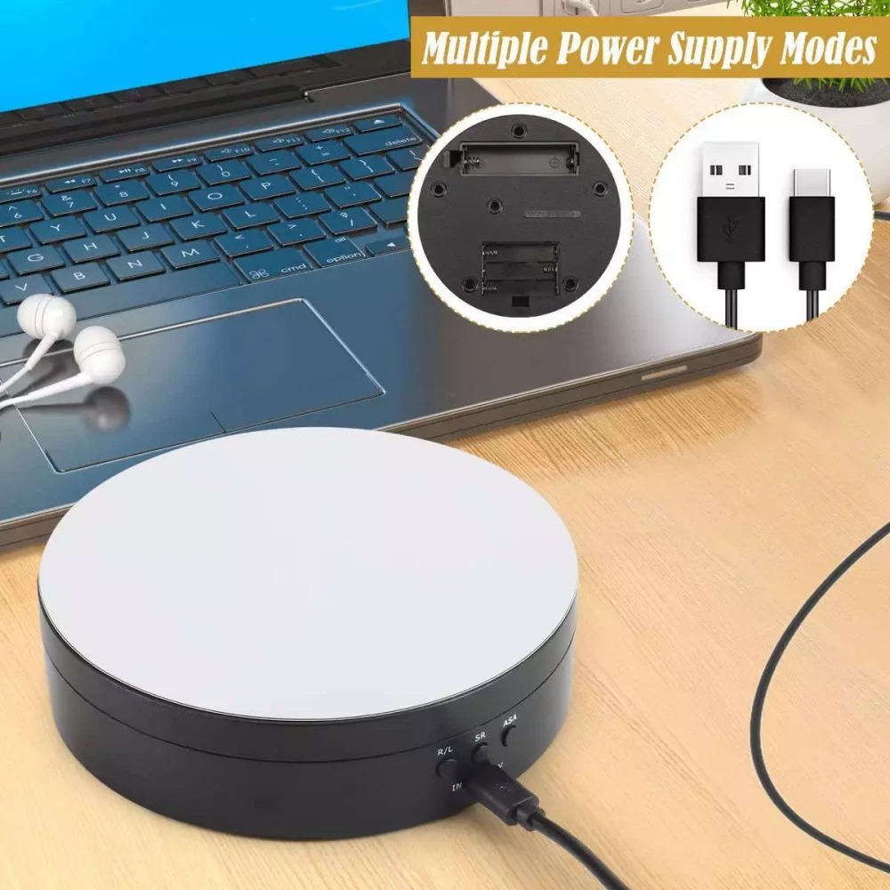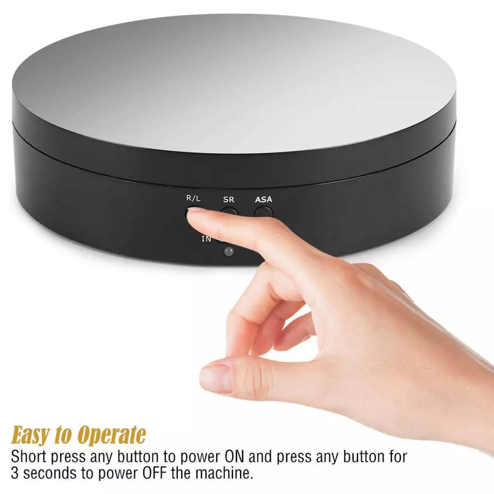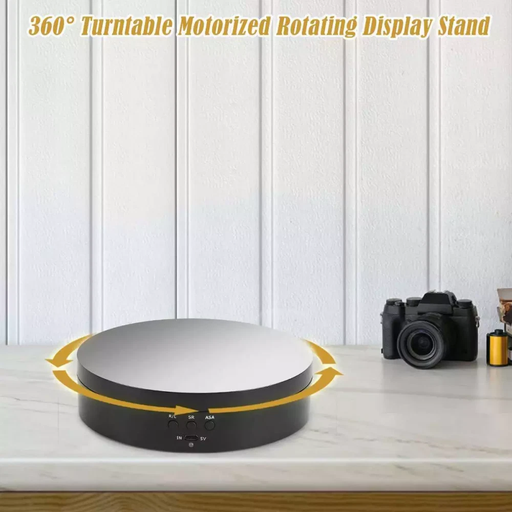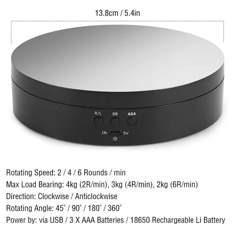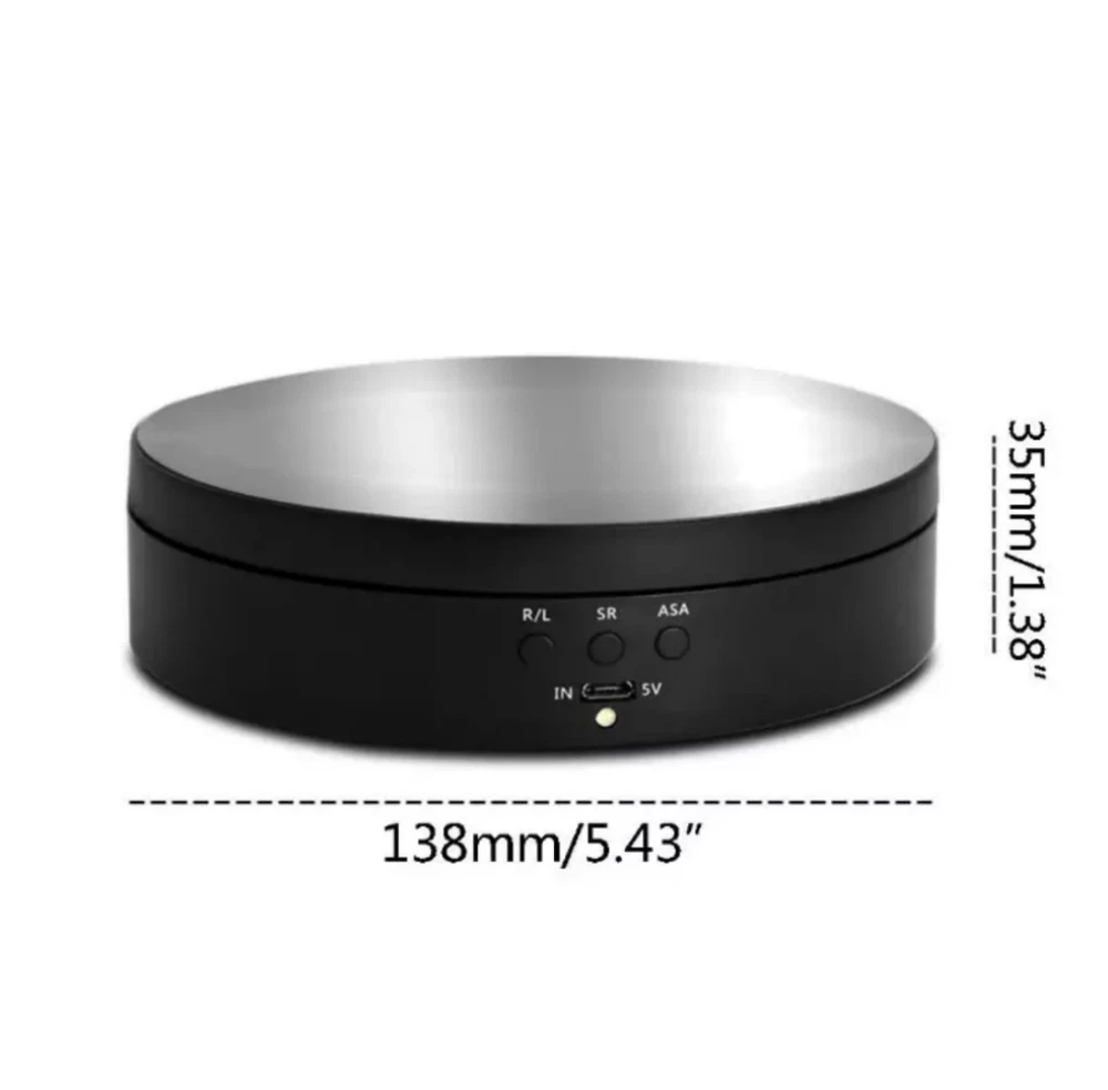 To our esteemed customers Hello! If you buy the package in our store any after-sales problems please do not worry, we will certainly solve the problem for you, please feel free to contact us by mail, we will communicate with you within 24 hours to confirm the program you provide, 100% satisfaction to solve your problem! Thank you for every purchase in our store, wish you a happy ~! 360° Electric Motorized Rotating Display Stand Jewelry Photography Show Holder 💎【Turntable Rotating Display Stand】-- A rotating display stand for professional photographers with excellent design to make product photos and video shooting more perfect. Max load 6.6lb, Package including rotating display stand USB cable (batteries not included). 💎【Wide Use】-- The motorized rotating display stand perfect for display watch, digital product, shampoo, glass, bag , Jewelry and Collectibles. Turntable perfectly handles a wide range of usage needs. 💎【Flexible Adjustment】-- Rotating display stand 3 gears manual speed adjustment, 10/15/30 seconds /lap, and 4 angles display--45°, 90°, 180°, 360°, you can adjust speed and angle to various demands. 💎【Turntable Size】-- Turntable diameter 5.4in / 13.71cm * height 1.4in / 3.5cm, lightweight 0.3kg. 💎【Quiet and Smooth】-- Rotating display stand motorized runs quietly and won't affect your video shooting.Which is nice should you ever decide to use turntable to display a product at an event. 💎【Small But Powerful】-- Motorized rotating display stand black 5.4inch, This turntable small in size but with a maximum load capacity of 6.6LB. 💎【Easy To Use】-- Rotating display stand Easy to operate one button start, switching ON/OFF Button; turntable handy and Easy to Operate stably and safely. Specifications: Color:Black Material: ABS Speed: 3 Rotational Speed Loading Capacity: 3kg Display Angle: 45°/90°/180°/360° Power Supply: 5V USB Port Power OFF: Long press any keys for 3 seconds Power Supply Mode: USB Power / Storage Power / External Battery 1865 Lithium Battery or 3 AAA Battery (not included) Diameter: 5.4"" / 13.7cm Height: 1.4"" / 3.5cm 0~6.6 Pounds Loading Weight Clockwise and anti-clockwise (Press R/L can change the rotate direction) Features 360 Degree Steady Rotation: Our turntable drives the top rotation in omnidirectional to catch most eyesight on a table, counter, shelf, rack, shopwindow. 1.6RPM, Available rotation in clockwise direction or CCW direction, just press the button to change rotation direction. Use very convenience, functions multiple. Flexible Adjustment: Our rotating display stand third gear manual speed adjustment, 10/15/30 seconds / lap, and 4 angles display--45°, 90°, 180°, 360°, you can adjust according to various demands, just press the switcher. So easy to get your expecting effect. Small But Powerful: Up to 6.6 pounds centric loading capacity, excellent structure lets it rotate very steadily, Small in size but with a maximum load capacity of 6.6LB. Quiet and Smooth: This rotating display stand motorized runs quietly and won't affect your video shooting. Modern design, easy to use, multi-function, excellent effect, durable in use, ideal for product display in exhibition or shop. Product Operation Instructions: Turn ON or OFF: Press and hold the SR key for 3 seconds to turn it on or off. Clockwise and anti clockwise: Press R/L can change the rotate The third speed regulation is 2-4-6 revolutions per minute respectively, the maximum load-bearing capacity is 4 kg-3 kg-2 kg according to different rotating speeds. Forward and reverse rotation function: Set the round-trip rotation function according to the rotation angle. The round-trip rotation angles can be set to 45-90-180-360 degrees respectively. There are four power supply modes to choose from: USB direct insertion AC power supply, USB charging treasure power supply, three ordinary 7th batteries power supply, rechargeable lithium battery power supply. Package includes: 1 x 360° Electric Motorized Rotating Display Stand Jewelry Photography Show Holder (Select Color From Menu)"