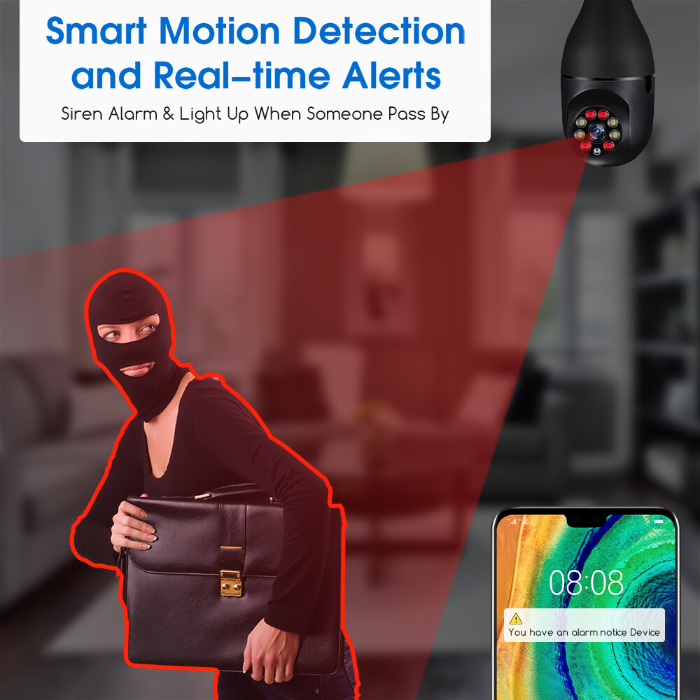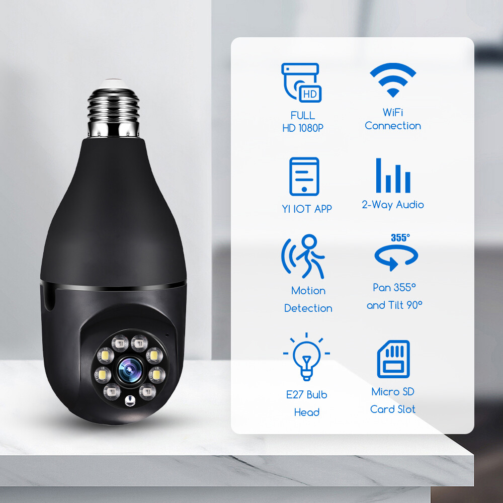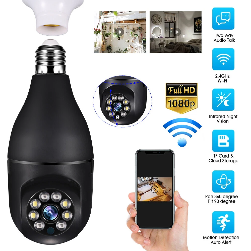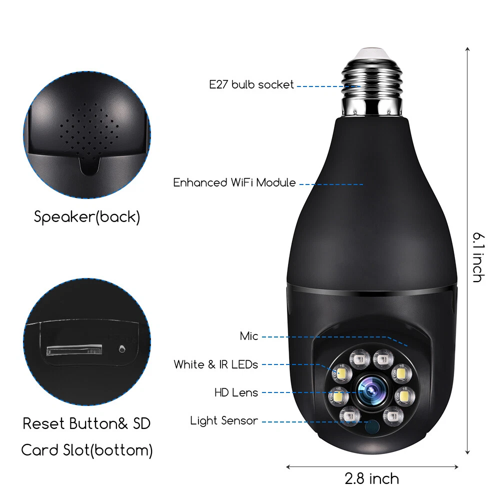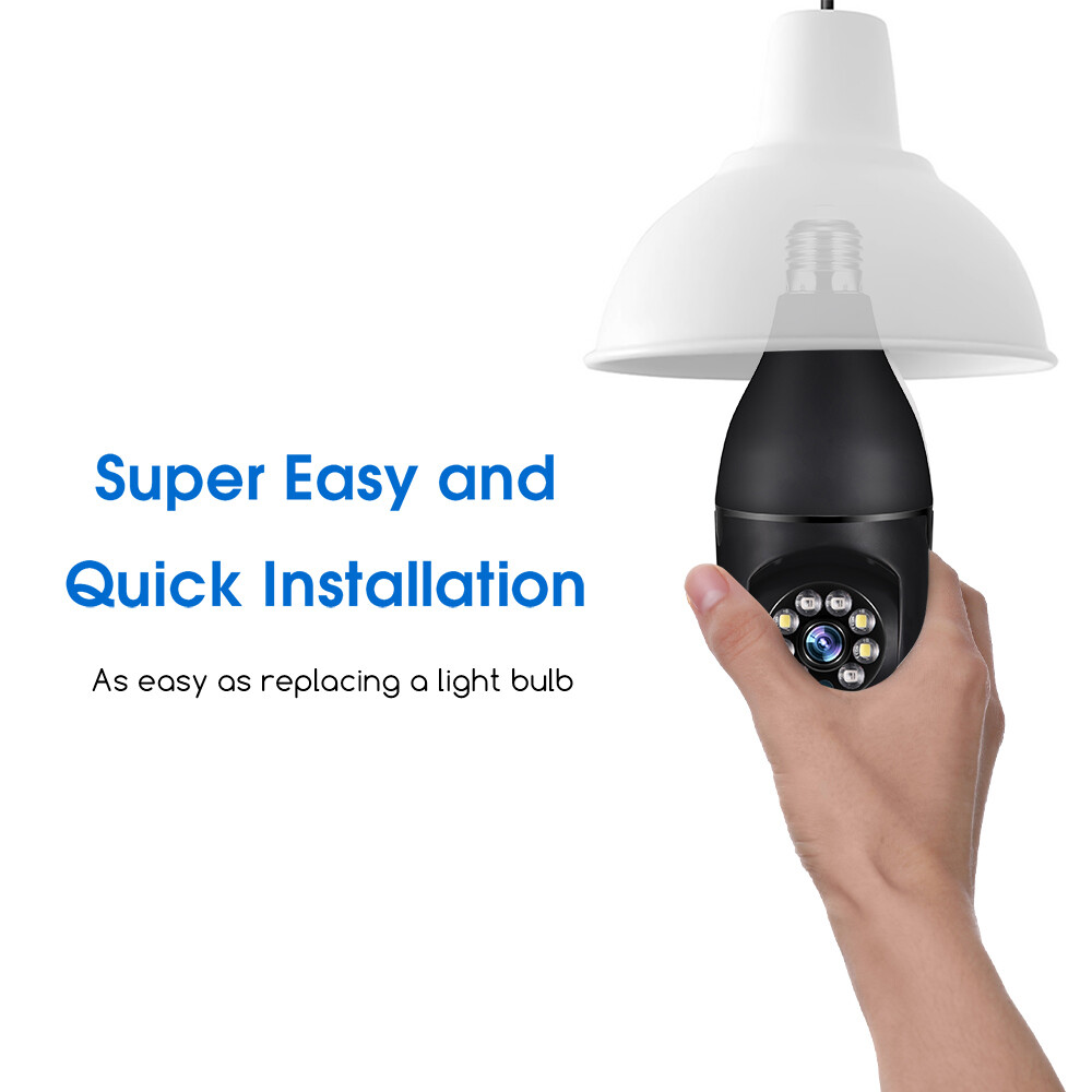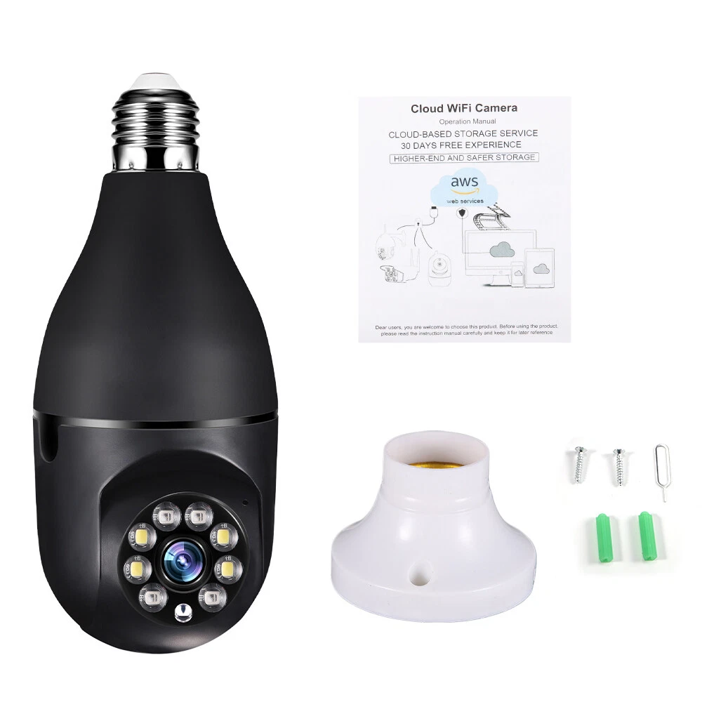 Specifaction: Connectivity Technology:Wireless Connectivity Protocol:Wi-Fi Controller Type:Android/IOS Video Capture Resolution:1080p Pixel: 2 million Size: 9cm x 8cm x 16.5cm Night mode: infrared night vision + LED full color Processor: industrial embedded controller Intercom mode: two-way voice intercom Alarm: automatic tracking of movement detection Video recording mode: continuous video recording, anomaly detection video recording Video storage: TF Card cloud storage service(NOT Inluded) Memory card version: TF card support (16-128g) Adapter: power E27 lamp cap adapter Rotation angle: 360 ° left and right, 90 ° up and down Package list: 1 * Camera, 1 * E27 Socket, 1 * Mounting screw, 1 * User manual Specifaction: Connectivity Technology:Wireless Connectivity Protocol:Wi-Fi Controller Type:Android/IOS Video Capture Resolution:1080p Pixel: 2 million Size: 9cm x 8cm x 16.5cm Night mode: infrared night vision + LED full color Processor: industrial embedded controller Intercom mode: two-way voice intercom Alarm: automatic tracking of movement detection Video recording mode: continuous video recording, anomaly detection video recording Video storage: TF Card cloud storage service(NOT Inluded) Memory card version: TF card support (16-128g) Adapter: power E27 lamp cap adapter Rotation angle: 360 ° left and right, 90 ° up and down Features: 【Remote Viewing & Night Vision】Our camera can control the viewing angle through APP,you can access remotely view anywhere and any time through your iPhone/Android phone/Ipad,Even in complete darkness, you can view clear images. 【Wireless & Easy Installation】This camera can be installed using a normal E27 bulb base(110V~240V),NO MORE EXTRA INSTALLATION STEPS.then you just need to connect the camera system to the router,open the app to setup the camera within minutes. 【1080P & Pan Tilt】This Pan Tilt WiFi camera can provide you with a clear vision (Full HD 1080P resolution) at any time,You can use the APP to control the camera viewing angle to achieve 360 viewing without blind spots. 【Motion Detection & Real-time Alerts】this PTZ dome surveillance camera adopts a highly sensitive motion sensor,Once the camera detects the movement of the object after connecting it to the Internet, it will record the moving picture and notify you through the APP. 【Two-Way Audio & High Quality Service】Built-in microphone and speaker, the bulb security camera can have a conversation between you and your visitor,If you have any question, please contact us.We provide lifetime technical support and services. Package list: 1 * Camera, 1 * E27 Socket, 1 * Mounting screw, 1 * User manual Tips: 1.Please make sure the device is connected to the power and your phone is connected with Wifi. 2.The product does not have a memory card, please prepare by yourself if you need it, or choose the link with a memory card when purchasing. On Dec 5, 2024 at 18:42:13 PST, seller added the following information: