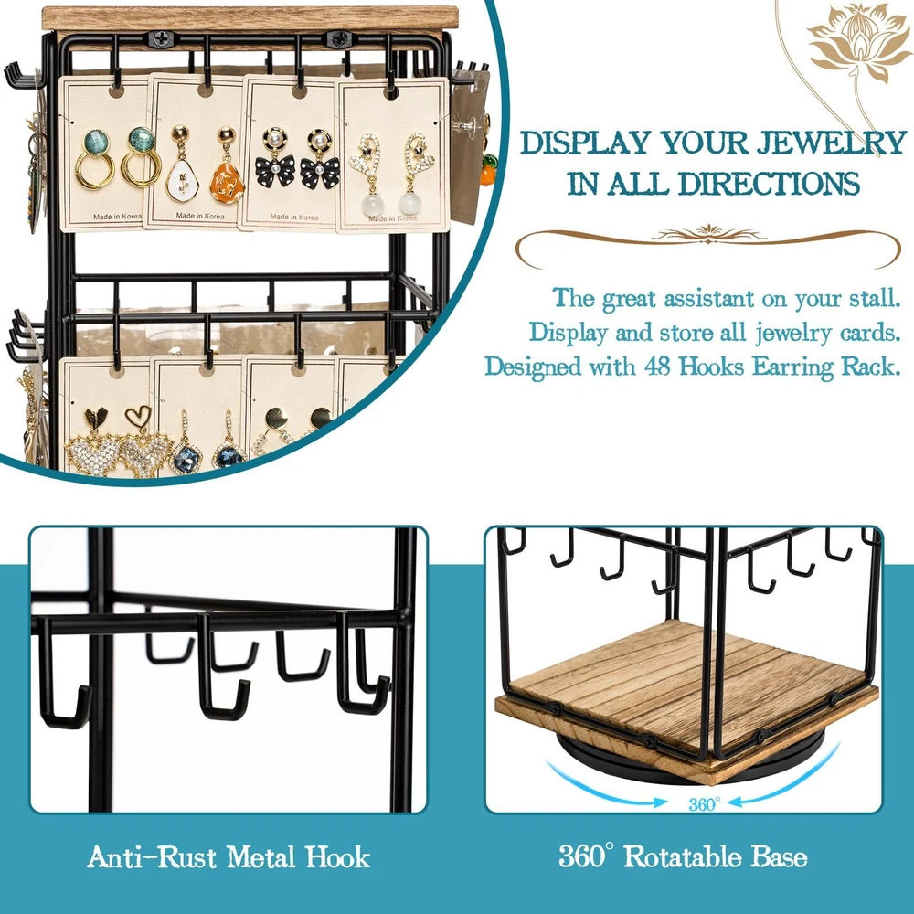 Rotating Wooden Jewelry Display: This earring holder organizer sits on a rotating stand, which display your jewelry in all directions. It can display various types of earrings and necklaces or keychains in four sides, increasing earring display opportunities. Attractive and Sturdy: Our rotate jewelry display racks are made of solid wood and strong metal, durable and sturdy to ensure long term use. This earring display stands are perfect for showcasing your beautiful earrings and attracting your customers' attention. Easy to Install: This spinning earring display stand tower is so easy to put this turning earring storage organizer together, all you need to do is just screw the 4 metal parts between the 2 wood parts, then you are done with your installation and can get a high-end, beautiful rotating jewelry stand to properly display your earring cards or jewelry. Perfect Size: Earring display rack measures 7.28"L x 7.28"W x 15.74"H that doesn’t take up a lot of space and perfectly fit any counter, earring display jewelry display for vendors 48 hooks offer maximum storage capacity for hanging all of your jewelry collection easily and beautifully. Where to Use: This wood jewelry display stand is practical and convenient, which commonly used in retail stores, trade shows, or exhibitions, earring display, jewelry display for vendors, and you also can be applied it for selling, showing.