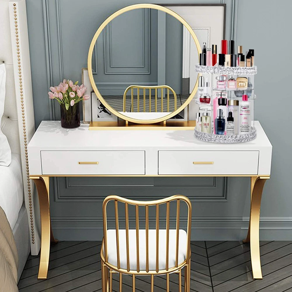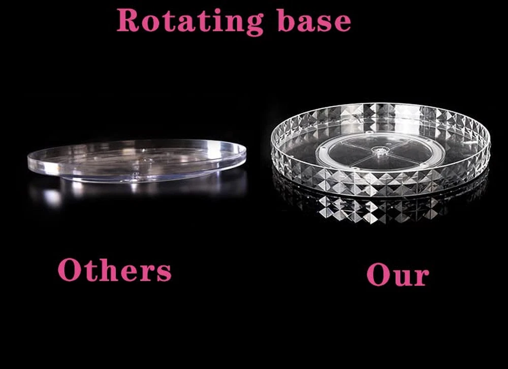 💎【360° Rotating Makeup Organizer】This makeup organizer box has a steady rotating base allows it 360° rotates silently and smoothly, enables you to easily take your cosmetics from it in seconds. Great makeup organizer for vanity. 💎【Large Capacity & 8 Adjustable Layers】The makeup storage organizer is divided into 10 storage spaces by partitions, can hold at least 50PCS skincare products, cosmetics and makeup tools. It has 8 adjustable layers on the main body which allows you to adjust the partitions to fit different size of your skincare products. Help to save more rooms. 💎【Sturdy & Durable】V-HANVER large makeup organizer was made of high quality acrylic, which provides a clearly transparent outlook. Its thicker design makes this acrylic makeup organizer strong enough to hold heavy skincare products and extends its using lifetime. Durable to use. 💎【Stylish & Elegant Diamond Pattern】 Chic diamond pattern on the top and bottom trays, makes this large makeup organizer have a elegant outlook. The cosmetic organizer helps to storage your makeup and make your living place tidy and elegant. 💎【Easy to Install & Clean】The 360 rotating makeup organizer is easy to be assembled and disassembled according to the User Manual. Its detachableand washable design allows you to clean the make up organizer at any time. 3 colors for your options. Product Description Details of Clear Makeup Organizer Adjustable Layers 4 removable trays & 8 layers to adjust to the height of rotating makeup organizer to fit your cosmetics. Good for bedroom, bathroom, and living room. Easy to Assemble & Clean This makeup organizer for vanity was divided into separate parts, which is easy to assemble & disassemble. Clear design, easy to clean. Best Gift Option Makeup storage organizer is essential for daily life. V-hanver makeup organizer is a perfect gift for girl friend, family and other friends on Christmas, Valentine's Day, Birthdays etc. Installation of 360 Rotating Makeup Organizer