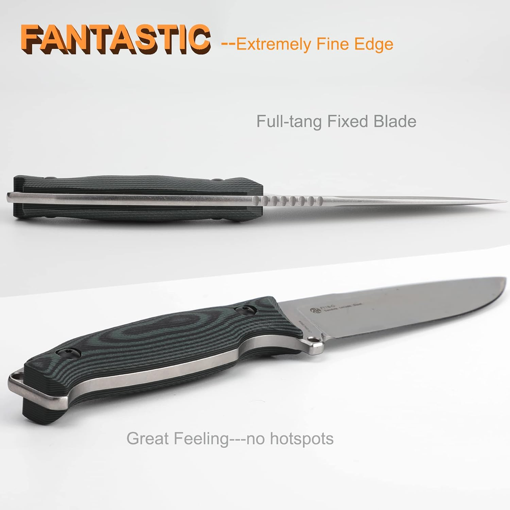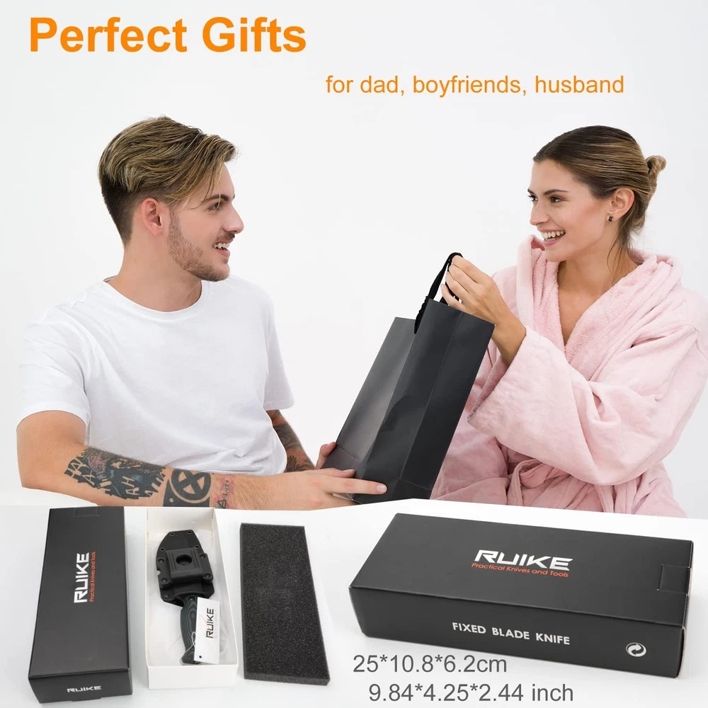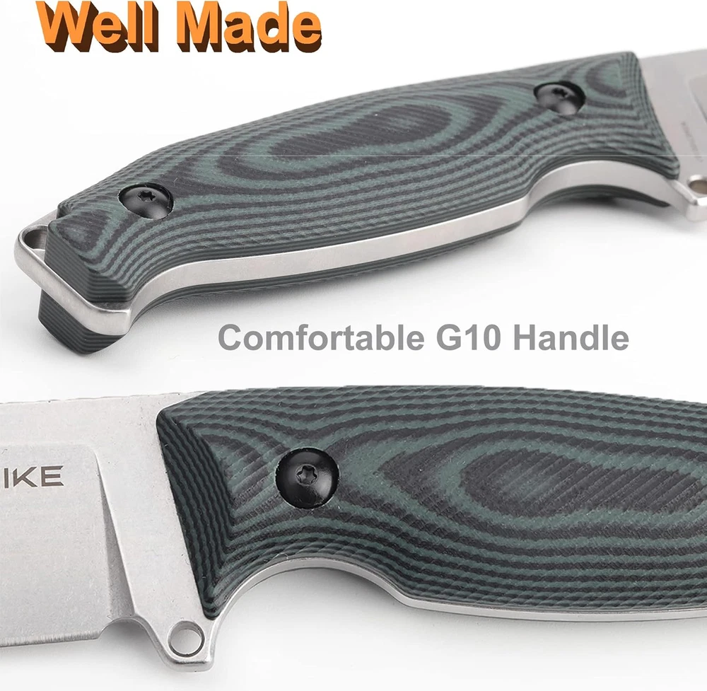 Wonderful 360-degree adjustable sheath (it is okay for wearing horizontal scout style), no worry the fixed knife handle jabbing me Admirably ergonomic G10 handle and non-slip full-tang large fixed-blade knife, 0.18" thickness, 8.78*1.44*0.79 inch length, 194g/6.84oz; Very razer sharp and drop point tip, suitable for a big or small variety of jobs from bushcraft to EDC cooking, camping, hiking, walking, fishing Great solid Sandvik 14C28N stainless steel that takes an extremely fine edge with great corrosion resistance Giant fixed blade knives, but a lightweight, well-finished knife, your valid companion, perfect gifts for men women dad father, boyfriends Wonderful utility 6 in 1 small keychain multi tool gear to come together with Ruike F118 camping fixed blade knife, also here have a safety belt holster. Product Description The fixed knife fits very securely into it's sheath; Quite well with it's locking and rotating belt clip no hotspots It feels great in hand, with a nice balance and grippy g-10 scales with welcome rounded edges to keep the knife feeling like it belongs in your hand Very Sharp and saving power truly great knife, suitable for a variety of jobs, from bushcraft camping to edc work cooking. Sandvik 14C28N steel Sandvik 14C28N steel has a high hardness index; a great solid Sandvik 14C28N stainless steel that takes an extremely fine edge with great corrosion resistance a beautiful and well finished knife It performs admirably here as a full-tang fixed blade Perfect Gifts for father dad mens boyfriends Overall Length: 223*36.7*20 / 8.78*1.44*0.79 Blade Length: 110 mm / 4.33" Blade Thickness: 4.5mm/ 0.17" Blade Material: 14C28N stainless steel (58~60 HRC) Handle Material: G10 Opening: fast Flipper (ball bearing) Finish: Stonewash 4.5 mm thick back also makes it suitable for medium-heavy jobs, such as chopping and batoning, with almost the same result as larger knives, but with less weight to everyday carry. Content: 1* camping fixed blade knife; 1* 6 in 1 multi-tool keychain