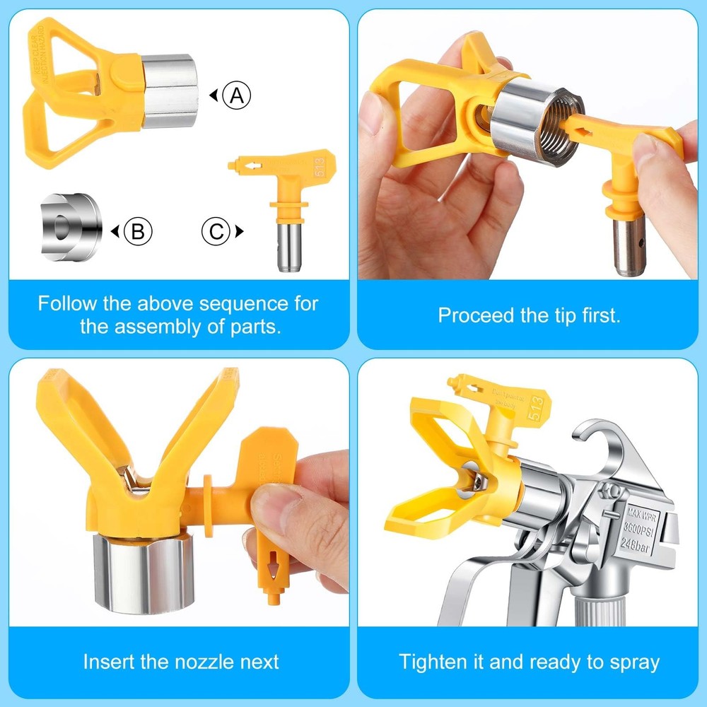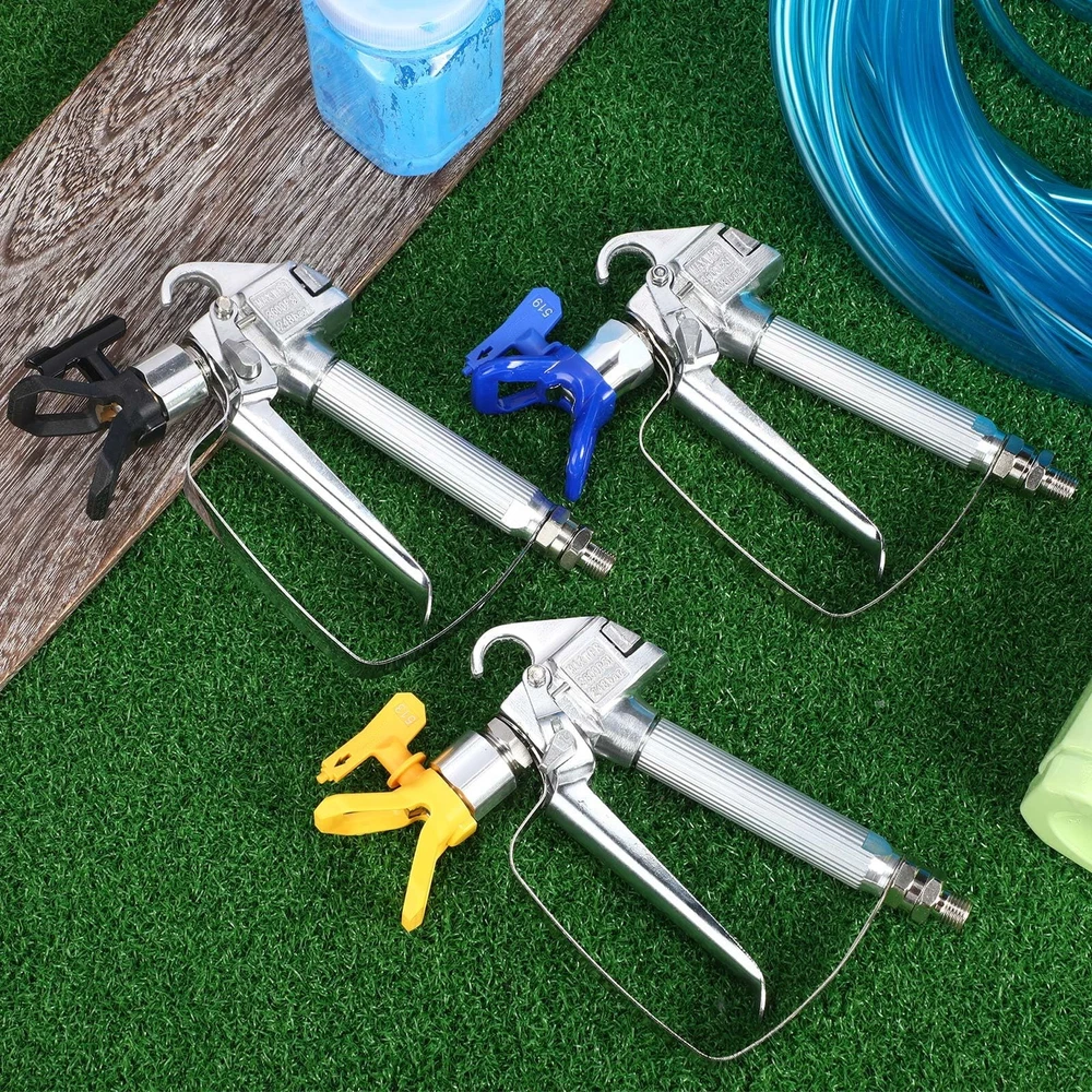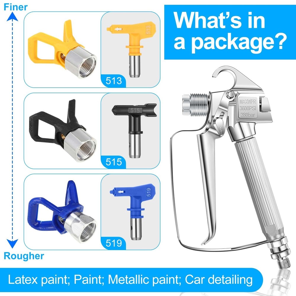 Features: Easy Maintenance: The simple and straightforward design of the airless paint sprayer gun allows for easy maintenance and cleaning, ensuring optimal performance and prolonged use. Optimized for Smooth and Even Coating Application: The precision engineered nozzles and airless design of these spray guns ensure smooth and even coating application. Whether you're painting a vehicle, furniture, or any other surface, you can expect professional grade results with these user friendly spray guns. Specifications: Material: gun body is stainless steel, gun base and nozzle are plastic Color: yellow (513), black (515), blue (519) Size: approx. 22 x 15 x 5 cm (8.66 x 5.91 x 1.97 inches) Package includes: 3 x Airless paint sprayer guns with 513/515/519 nozzles Notes: Manual measurement, please allow slight errors on size. The color may exist a slight difference due to different screen displays. Versatile Nozzle Options: our offering includes a comprehensive set of 3 airless spray guns, each designed with a different color for easy identification; The set comprises a yellow nozzle (513), a black nozzle (515), and a blue nozzle (519), providing you with the versatility to tackle various painting and coating tasks Smooth Spray Performance: the gun features a 1/4 inch inlet fitting, a swivel joint, and a forged gun head, 100 mesh gun filter inside, ensuring a smooth and controlled spray application for professional quality results Reliable Construction: the airless paint sprayer gun is built to last, with a stainless steel gun body and plastic gun base and nozzle, ensuring long lasting performance and reliability High pressure: the airless spray gun with 3600 PSI maximum pressure can easily cope with various working environments, the lightweight design of the airless paint sprayer gun provides comfortable and easy handling, reducing fatigue during extended painting sessions Efficient Coating: this paint sprayer can easily handle a variety of materials, including raw materials, stains, and varnishes, making it a versatile tool for various painting and coating applications
