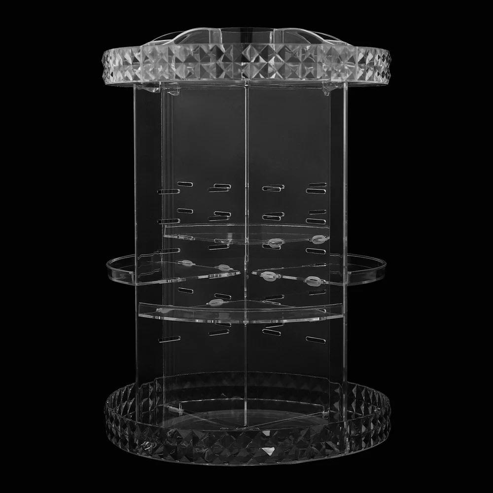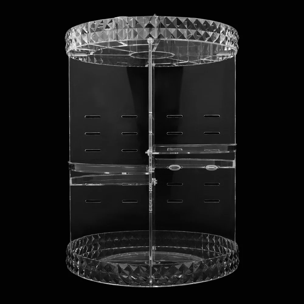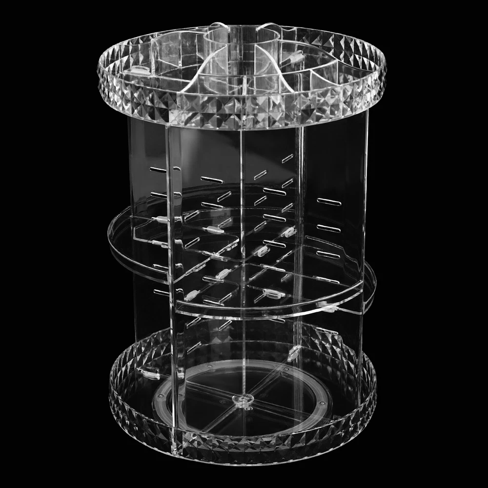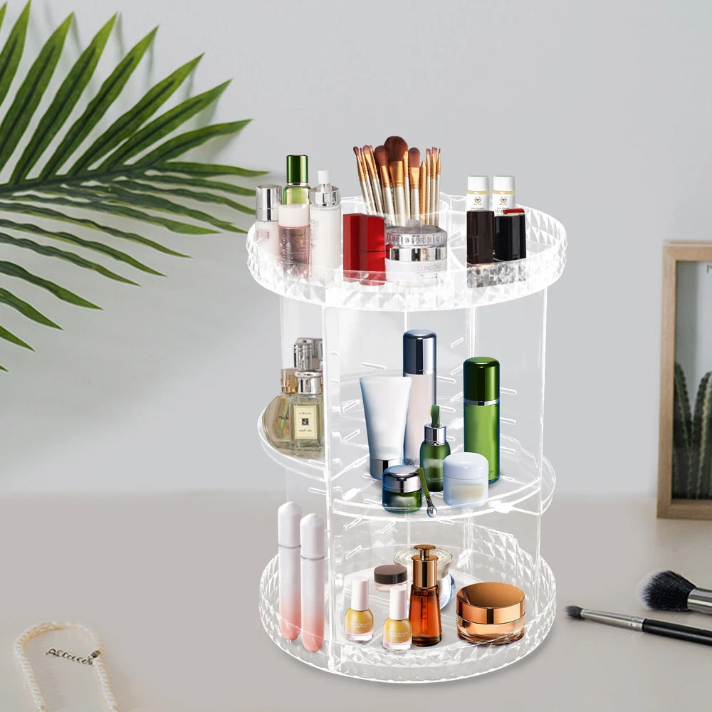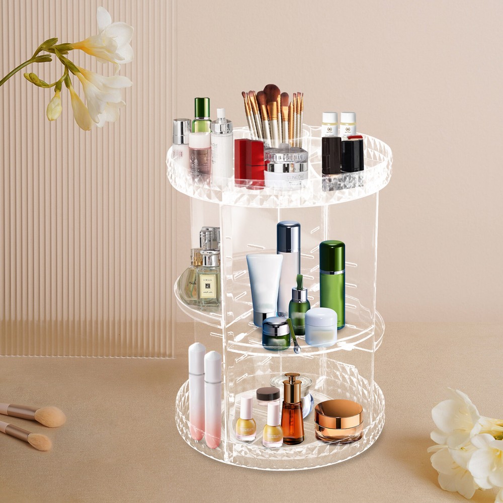 1. This rotating makeup organizer is a game-changer! The 360-degree spin makes it super easy to find everything, and the clear diamond texture looks so elegant. Love that the height adjusts to fit different products—perfect for my skincare, brushes, and palettes. It’s sturdy, silent, and keeps my vanity clutter-free. Fits anywhere—bedroom, bathroom, even my kitchen counter! Highly recommend for staying organized in style.