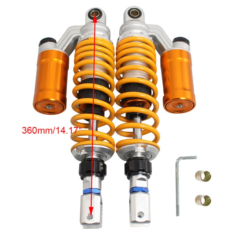 Store Categories Store Categories Car Parts & Accessories Bumper Spoiler Light Motorcycle Parts Handlebars, Grips & Controls Spoiler Fairing Windshield Dashboard Screen Protector Lights Gas Tank Side Faring Mud Guards & Rear Huggers Air Filters Antenna Mirror Shift Knob Grill Parcel Shelf Strap Fuel Cap Retaining Strap Key Case Pillar Posts Other 360mm 14.17" Rear Shock Absorber Air Gas Spring Suspension Motorcycle Scooter Description Description: Color: Yellow Material: Solid Steel+Aluminium Alloy Installation Type: Clevis/Straight Fork Length of Eye to Clevis Eye Core: 360mm/14.17" Eye Diameter: 12mm, 10mm Spring Thickness: 7mm Working Stroke: 60mm Maximum Load: 200kgs (440 lbs) Fitment Universal fit for most motorcycle Please check the size to ensure the fitment before buying! Package Included: 1x Motorcycle Rear Shock Absorber