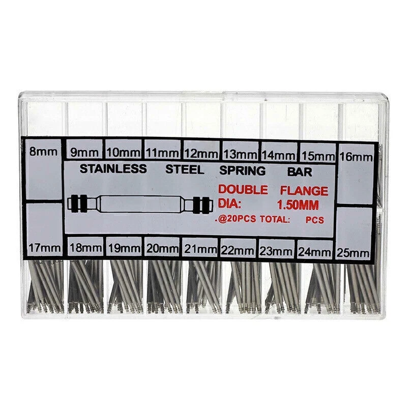 Product Description If you have any questions, please contact customer service first, do not open disputes easily, thank you! Description: Color: Silver Material: Stainless Steel Size : 8mm to 25mm, each size 20Pcs Quantity: 360Pcs Features: 1. Brand New and Good Quality. 2. Compact double ended. 3. Include all sizes you need. 4. These quality spring bars are an extremely handy accessory to your tool kit. Package Includes: A Box of Watch Band Spring Bars Set Kit (360PCS). Notes: The real color of the item may be slightly different from the pictures shown on website caused by many factors such as brightness of your monitor and light brightness. About Us We accept all payments authorized by eBay. About Us We accept all payments authorized by eBay. powered by