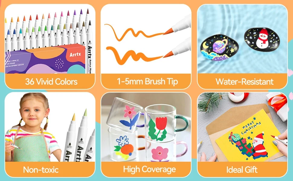 Arrtx 36D Color Acrylic Paint Pens Set 36 Vibrant Colors Acrylic Paint Pens - This set contains one color from 30A (35), contains 10 colors from 30B (00/03/17/18/28/38/53/56/61/98), extra increasing 25 new colors added. This marker set provides more new color shades for creativity. Please note: When you open the package for the first time, the order of placing the acrylic markers is the same as the order of the color card stickers, just stick them in order. Quick Dry and Waterproof - The highly pigmented paint is high covering, water-resistant, and abrasion proof allowing the application to any surface. Arrtx acrylic paint pens are water-based ink. These paint markers flow without flooding or jamming, it's permanent when dry. Note: Please tighten the cap and put pens horizontally if you don't use them. Work Well on Diverse Surface-Arrtx acrylic markers set provides water-based smooth ink and excellent coverage for a variety of surfaces, works for paper, cardstock, metal, rock painting, wood, plastic, canvas, fabric, stone, Easter eggs, easter decoration, metal, Christmas ornament, Halloween pumpkin painting, calligraphy, scrapbook, brush lettering, Christmas card, birthday gifts, greeting card, or any DIY crafts projects and more. Let's express imagination! Easy to Apply, No Pressing Down,No Shaking - With new design, these pens are very easy to apply and no need to shake and press for tips while using, you only need to open the cap to use pen.Round pen body made it comfortable to grip. Safe and Non-toxic - Arrtx drawing markers set adopts water-based environmental protection pigment ink, which is non-toxic, tasteless, waterproof, and high temperature resistant. With high-quality certificated ink makes these painting pens safe and suitable for both kids and adults for all kinds of DIY paintings. Ideal Gift - Arrtx markers are packaged in a unique two-tier design box to keep your pen clean and well organized. Non-Toxic & Safe, good gift for kids, students, artists, and adults at Christmas, Halloween, Easter Day, Thanksgiving, mothers day, and any other occasions.