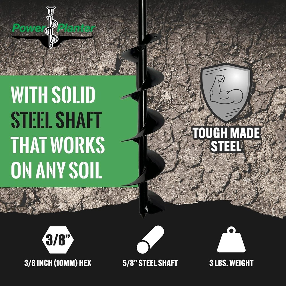 Extended Length Garden Auger Drill Bit, 3" x 24" with 3/8" Non-Slip Hex Drive, Auger Drill Bit for Planting Bulbs and Potted Plants, Garden Digging Tool for Dirt, Clay, Soil and Sand POWERFUL AUGER DRILL BIT: Our solid steel auger drill bit has a 10-gauge spiral flighting that chews through tough dirt and grass when planting bulbs, vegetables, bedding plants, and 3″-4 potted plants. Its practical design has been shown to speed up your planting/digging time by 500 percent. A garden digging tool for planting smarter, not harder! MULTIFACETED TOOL: Our specially-designed auger drill bit is perfect for various home project applications. Use this powerful drill attachment with (at least 18V) hand drill not just for gardening but also for mixing paint and mortar. Our augers with solid steel shafts and extra-thick flighting are alternatives to post hole diggers, bulb planters, or shovels for digging holes. PERFECT FOR ALL TYPES OF SOIL: Our patent-pending ground auger bit is effective for drilling into the dirt, clay, rocky soil, and sand. The auger bit extension works efficiently and requires significantly less physical force to operate. Our augers will help you complete your task more efficiently, whatever soil or ground you are working on. READY TO USE: Our auger's 3/8-inch non-slip hex drive can fit most cordless or electric drills. Simply tighten the drill chuck to secure the auger, and you're ready to dig. Its extended shaft will help save your back when digging holes. This contractor grade HD auger also includes an abrasion resistant tip, extending life of the unit by 3-4X. These augers are designed only for use with drills, not handheld and impact drivers. : Our company is a third-generation family-owned auger manufacturer based in Illinois. We produce a variety of different sizes, models, and auger accessories. We stand by the quality of our augers and are committed to prioritizing the needs of our customers, such as property owners, DIYers, Gardeners, and outdoorsy people.