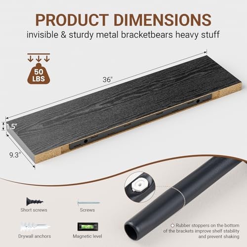 Return Policy Fast Delivery Trusted seller Floating Shelves for Wall 36 Inches Long,9.3" Deep Black Floating Shelf Set of 2,Wall Mounted Shelves for Bathroom Bedroom Living Room Kitchen Office,Shelf for Books Storage,Home Decor Product Description 【Modern Rustic Look】Our 36 inch floating shelves for wall are made from durable engineered wood,which blends well with modern and rustic farmhouse wall decor alike.The black floating shelves is available in colors & sizes,perfect for storing books,plants,collectibles,etc.. 【Longer Design】Our pretty 36 inch wall shelves are 36"W x 9.3"D x 1.5"H.Our black shelves for wall is longer than traditional designs and can hold more items.The 36 inch floating shelf optimize wall space,helping organize essentials without taking up floor space in your home. 【Sturdy & Reliable Material】The 36 Floating shelf for wall use metal brackets and screws to be firmly fixed to the wall without sagging.Our floating shelves 36 inch are made of high quality MDF material,can hold up to 50 lbs to safely place your items. 【Multi-used Applicability】Invisible long floating shelves for wall for living room,bedroom,study,bathroom & kitchen decor.It can be used as wall shelves for bedroom,wall shelves for living room,floating shelves for kitchen,floating shelves bathroom,coffee bar shelves,etc.. 【Easy to Install】Our long wall shelf can be easily installed in minutes with the installation manual.Convenient to wipe and easy to maintain.This deep floating shelves for wall is also an ideal gift for family and friends. Shipping Returns Payment Shipping Shipping is FREE to all addresses other than APO/PO boxes in the lower 48 states. All our stock ships from US-based warehouses. Shipped via USPS or UPS (depending on location and package weight) Unless stated otherwise, all orders will ship within 24-72 hours of your payment being processed. Check our feedback to see the great reviews of FAST shipping we offer. Returns Seller does not accept returns Payment We currently accept payment via eBay managed payments only. Once payment is cleared, we will dispatch your shipment within 1-3 business days. Please refer to the "Shipping" tab for more information regarding shipping speed to your destination.
