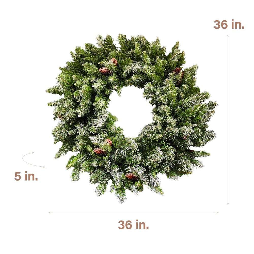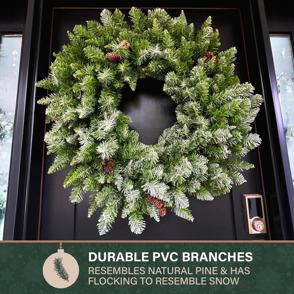 Deck the Halls: Welcome guests with this delightful 36-inch snow flocked artificial wreath on your front door, above your fireplace, or anywhere else indoors or covered outdoors Designer Finishes: Beautifully crafted with frosted pine branches and trimmed with pinecones to provide years of enjoyment Timeless Elegance: A long lasting alternative to a traditional live door wreath High Quality Materials: This realistic wreath is designed using high quality artificial materials that are flame retardant, nonallergenic, and crafted to last season after season No Assembly: Festive wreath is preassembled so all you need to do is remove from box, fluff, and hang and requires no maintenance from year to year