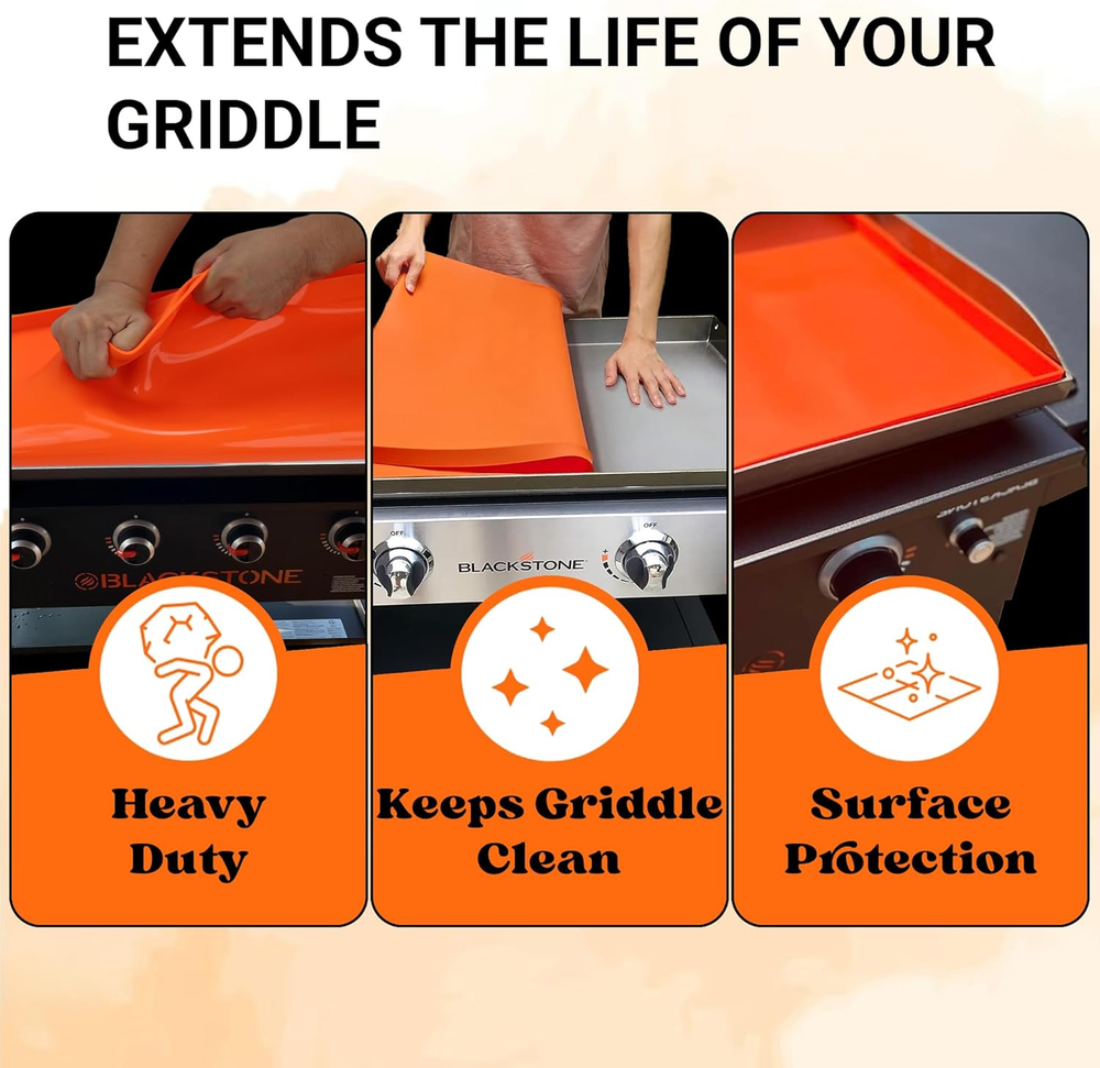 【PERFECT FIT】 The silicone griddle mat is custom-fit to cover the 36 inch Blackstone griddle and form a seal, so no mice, insects, or dirt can get in, so your griddle stays clean between cooks. 【PREVENTS RUST】 Rust requires 3 elements to form: Water, Iron and Oxygen. Without one of these, rust cannot develop. This is why the silicone griddle cover is crucial accessory for your Griddle. 【COMPLETE PROTECTION】 The silicone griddle mat creates a protective seal against moisture to prevent rust, keeping your Blackstone clean and seasoning intact. 【PREMIUM FOOD GRADE SILICONE】 The silicone griddle mat cover is crafted from 100% food-grade silicone, this durable material is designed for long-lasting use. Its thickened design offers flexibility, foldability for easy storage, and reusability for repeated use. 【GRIDDLE BUDDY COVER】 Unlike other blackstone griddle mat that leave gaps in the corners. Our silicone griddle mat ensures a full coverage protection, protecting the griddle mat from dust, debris and leaves. 【EASY TO CLEAN】 The non-stick, waterproof, oil-proof, and stain-resistant surface of this silicone grill mat makes cleaning a breeze. Say goodbye to lengthy cleanup sessions and enjoy more time grilling. Product Description Premium Silicone Griddle Mat For Blackstone Griddle Excellent Quality We aim to keep you satisfied with top quality. Made from food-grade, BPA-free silicone that’s safe, strong, and built to perform. 5 Star Attention If you have any questions. You'll get an answer personally, from a professional. We want to do our best to keep your experience the best as possible. Passion Project To Business We started with one goal, to create outdoor cooking gear we truly love using. Every product is crafted with care, built to last, and made to enjoy. American Based Business OZG is a small, US-Based Business that truly appreciates every customer. We hope to make a difference and add more quality products to our selection. The Perfect Cover, that keeps your Griddle Clean! This great solution for Blackstone griddle owners is designed to cover your griddle from Dirt & Rust. The OZG silicone griddle mat offers unmatched protection! Our silicone griddle mat protects your griddle from elements, pests, and wear. Made from thick, durable, heat-resistant silicone, it prevents rust, scratches, and debris, extending your griddle's lifespan. Protect your investment with the world’s most effective griddle protector! Don’t Let The Weather Ruin Your Griddle – Protect it Year Round Browse Sizes Add to Cart Add to Cart Add to Cart Add to Cart Customer Reviews 4.7 out of 5 stars 259 4.7 out of 5 stars 259 4.7 out of 5 stars 259 4.7 out of 5 stars 259 Price $34.99 $ 34 . 99 $31.99 $ 31 . 99 $26.99 $ 26 . 99 $23.99 $ 23 . 99 Brand OZG OZG OZG OZG Material Silicone Silicone Silicone Silicone Dimension 35.83 x 21. 65 x 1.02 Inches 28.35 x 17.91 x 0.99 Inches 22.01 x 15.98 x 0.98 Inches 16.97 x 15.00 x 0.51 Inches Wall Thickness 0.15 Inch 0.15 Inch 0.15 Inch 0.15 Inch BPA FREE Yes Yes Yes Yes Dishwasher Safe Yes Yes Yes Yes Temperature Resistance -40° F to 400° F -40° F to 400° F -40° F to 400° F -40° F to 400° F Is the OZG Griddle Mat suitable for all Blackstone griddles? Yes, indeed! The OZG Griddle Mat is custom-tailored to fit Blackstone griddles, ensuring a snug and secure fit. "Fits like a glove" Do you cook on top of this mat? No, the OZG Silicone Griddle Mat is not intended for direct cooking. It's designed to be placed on the griddle in between cooking sessions to protect the griddle surface, ultimately prolonging its lifespan. Can the OZG Griddle Mat withstand high temperatures? Yes, the OZG Griddle Mat is heat-resistant up to 400°F. But it's not recommended to be heated to extreme temperatures. However, it is safe to place the mat on the cooking surface while it's still warm. Does the OZG Griddle Mat protect against environmental elements? Absolutely! The mat provides superior protection against humidity, leaves, sand, insects, and rodents, Keeping your griddle surface clean and well-maintained. How do I clean the OZG Silicone Griddle Mat? Cleaning is a breeze! Simply wipe the mat with a damp cloth or rinse it with mild soap and water. It's also dishwasher safe for added convenience. Just make sure the mat is dry before placing it back on the griddle surface. VIDEO: Silicone Griddle Mat for Blackstone Griddle The video showcases the product in use. The video guides you through product setup. The video compares multiple products. The video shows the product being unpacked. hero-video Merchant Video