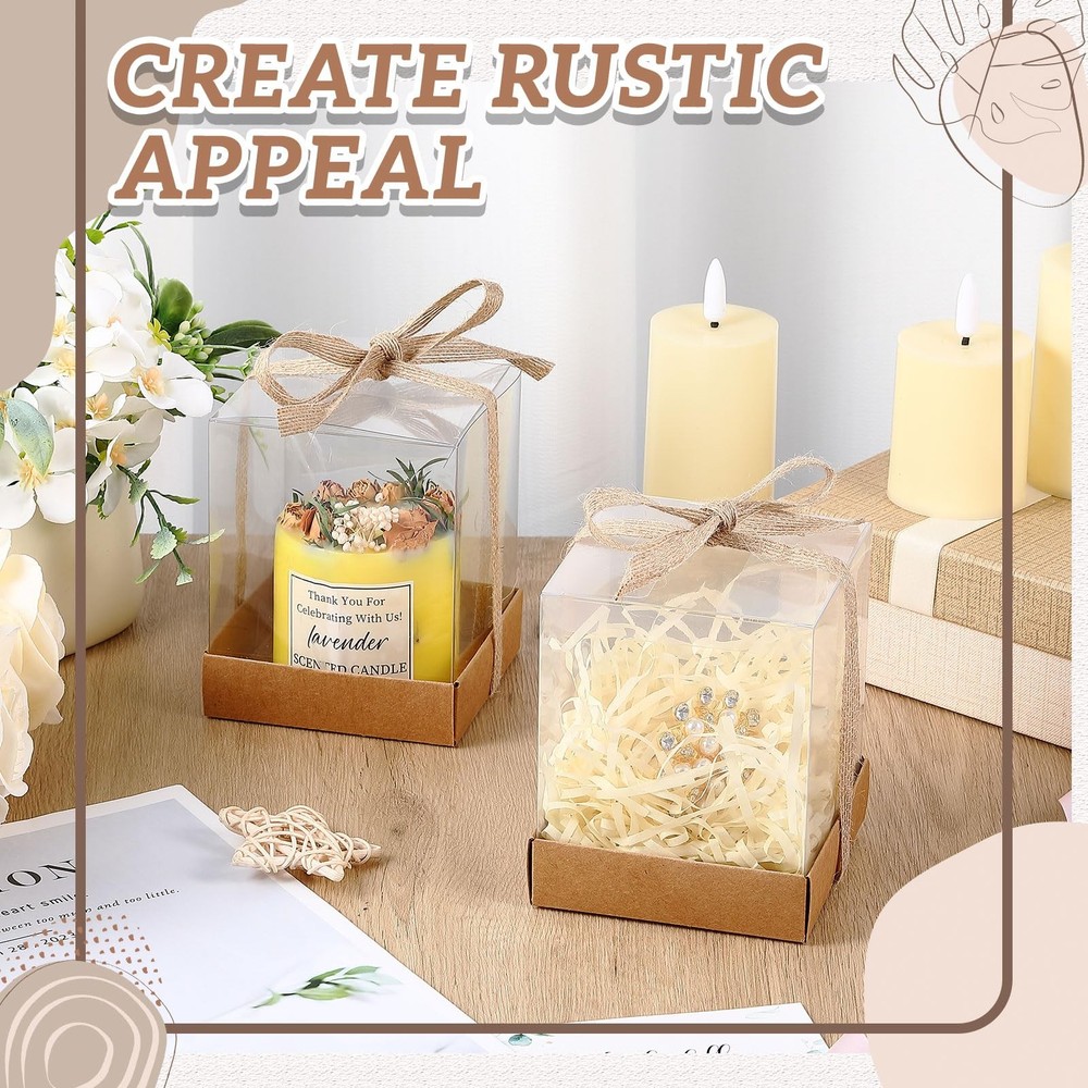Features: Giving out candle box favors to your guests not only elevates the aesthetic of your areas with ease but also contributes to the creation of a festive ambiance. Present these candle ornaments to your acquaintances, neighbors, family or workmates. Beyond illustrating your thoughtfulness, such gifts could also serve as a fantastic mean of bolstering your relationship. Specifications: Material: paper and plastic Color: mainly Transparent and brown Size: approx. 3.54 x 3.54 x 4.33 inches/ 9 x 9 x 11 cm Package includes: 36 x Transparent candle holders Notes: Manual measurement, please allow slight errors on size. The color may exist a slight difference due to different screen displays. Convenient Packaging: Experience convenience like never before with our package that includes a gift box with 36 transparent lids, 36 jute ropes, a combination set that allows you to conveniently put together most of your gift wrapping needs in one place. Express your special sentiment through a gift that truly stands out and is exceptional in its thoughtfulness Transparent Window design: Our creative packaging comes with a transparent lid atop, offering a distinctive way of showcasing your candles. It provides a peek to your guest, displaying the design and color of the candle even before the box is opened Elegant Color and Size: Each of our candle boxes predominantly features a cowhide color that harmonizes with multiple events or occasions. The box also offers a transparent window to display your gift, with ample space, approximately 3.54 x 3.54 x 4.33 inches/ 9 x 9 x 11 cm, ideal for accommodating gifts for various parties Natural Style: Each's beautiful design is rich in natural and rustic vibes. This can elegantly serve as a centerpiece decoration for your guests' wedding tables or party decor. It's bound to complement your decor aesthetics while making your occasion stand out Versatile Uses: These wooden candle stands are not just ideal for weddings, but are equally fitting for adults parties in setting. They can be applied for baby showers, engagement parties, holiday gatherings, housewarming gifts for numerous guests, or simply as rustic party table decor or for other occasions where you wish to create a warm and inviting ambiance