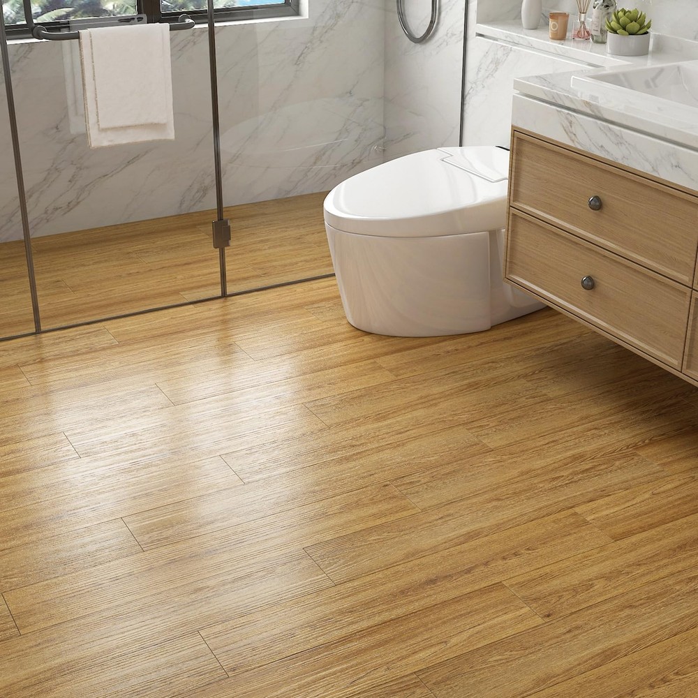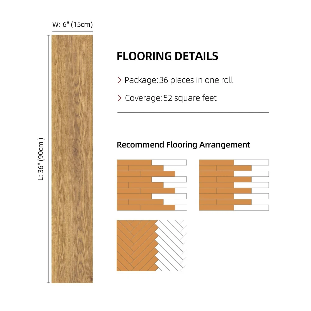 PEEL AND STICK WOOD FLOORING VINYL WOOD FLOORING WATERPROOF 👍 Would You Want To Quickly Transform or Decorate Your Home? 👍 ▸ Peel and stick floor tiles is extra thick and durable. ▸ Wood flooring vinyl is matte and slightly textured. Wood grain design is suitable for bathroom, kitchen, basement, bedroom, laundry, living room, etc. 📝 SPECIFICATION 📝 Finish: Matte Feature: Peel and Stick, Self-adhesive, Waterproof, Oil-proof, Removable, Sticky, Thick, Durable, Repositioned, Easy to Clean, Easy to Use, Bubble-free. Application: Suitable for decorating and transforming kitchen, bathroom, floor, countertop, coffee table, vanity, cabinet, built-ins, walls, dresser, drawer, wrapping paper, DIY project, and more. INSTALL STEPS 1. Firstly, clean the surface to make sure it is smooth flat and dry. Measure the area, leave an extra length before cutting the flooring tile. 2. Secondly, Peel off the backing little by little while using a soft cloth to smooth the tiles as you go. 3. Finally, use a hairdryer to "stretch" the edges and seal them under the countertop overhang. 😀 WARM TIPS 😀 ▸To avoid color difference please buy enough boxes at a time to ensure they come from the same batch. ▸Product pictures may have slight differences in color from the actual product as monitors vary. ▸Please ensure that the covered surface is smooth and clean. Textured surface will affect the adhesion of the peel and stick floor tile. ▸Please contact us through Amazon if you are unsatisfied with the vinyl flooring peel and stick for any reason, and we will solve it in the first time. 🎁 -【Size】:The size of each peel and stick floor tile is 6"x36". 36 sheets cover 52 sq.ft. 1 piece of wood vinyl flooring covers 1.45 sq.ft, Strong coverage and a variety of styles to choose from. 🎁 -【Features】:Peel and stick flooring is made of PVC with slightly texture. It is waterproof, oil-proof, removable. Easy wipe to remove stains and protect the floor from splashes and oil. 🎁 -【Easy to Use】:Laminate flooring are nice for new users and super easy to operate! Just peel the back film and stick it to the surface you want. no grout, no glue, and removable. Easy to cut with sharp utility knife or scissors. 🎁 -【Application】:Peel and stick floor tile waterproof can be arranged in a stack bond, subway, or herringbone and more pattern. Bathroom floor tile is great for bathroom, kitchen, basement, bedroom, laundry room, living room, garage, RV, fireplace, camper, and more. 🎁 -【Customer Service】:We are fully committed to 100% customers satisfaction, so if there is any problem with this peel and stick floor tile, please feel free to contact us and we will reply as soon as possible.