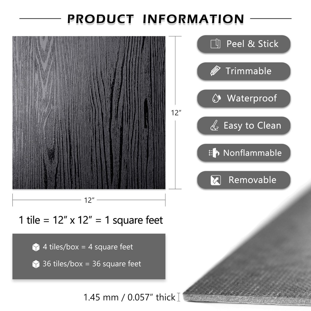 [SIZE] Length: 12 inch; Width: 12 inch [THICKNESS] 0.057" Thick Wood Floor Tiles [MATERIAL] Vinyl Flooring [STYLE] Wood Flooring [ADVANTAGES] 1.Peel and Stick Floor Tile Wood Look: peel and stick floor tile, peel and stick flooring, self adhesive floor tiles, stick on tile floor, sticky floor tiles, sticky tiles for floor, self stick floor tiles, peel & stick floor tiles, no extra glue needed. 2.Peel and Stick Floor Tile Wood Look: removable floor tiles for renters, great temporary flooring for renters. 3.Peel and Stick Floor Tile Wood Look: vinyl plank flooring, peel and stick vinyl flooring, vinyl floor tiles, laminate flooring planks, sheet vinyl flooring, vinyl tiles peel and stick floor, linoleum flooring, pvc floor tiles, peel and stick floor tile wood, wood tiles for floor. 4.Peel and Stick Floor Tile Wood Look: Waterproof flooring, flooring peel and stick waterproof, peel and stick waterproof floor tile, waterproof peel and stick floor tile, stain resistant, moisture-proof, anti-slip, easy to clean. 5.Peel and Stick Floor Tile Wood Look: This peel and stick tile floor can be used as bathroom floor tile, shower floor tile, kitchen floor tile, bathroom flooring, kitchen flooring, it also can stick on bedroom floor tiles, living room floor tiles, this sticky floor tiles are suitable for dinning room, laundry, nursery, dollhouse, playroom, cubicle, farmhouse, garage, basement, attic, kitchenette, gym, dorm, classroom, apartment, office and rv flooring. [PRO TIPS] 1. Measure the size of the floor surface before purchase, buy enough rolls at a time to avoid color difference. 2. Clean the surface before pasting. The adhesion will be the best if the surface is clean, smooth, dry and flat. 3. We recommend to avoid leaving too much water on the floor tiles while cleaning within two days after installation, which helps to maintain great adhesion for a long time. ➤ SIZE & MATERIAL: Each wood floor tile measures 12"x12" and 0.057" thick. 36 tiles per box, totally can cover 36 square feet. The sticky floor tiles are made of superior vinyl, wear resistant and nonflammable, safe for your family. ➤ EASY TO INSTALL: Self adhesive vinyl floor tiles, just peel and stick floor tiles to your room, readjust if you need, cut with utility knife or scissors to fit small space, no grout or special tools needed. ➤ EASY TO CLEAN: This peel and stick floor tile wood is waterproof and washable, oil proof and stain resistant, easy to clean with a wet mop. ➤ REMOVABLE: Just remove this vinyl plank flooring if you want. It's perfect removable floor tiles and temporary flooring for renters! ➤ MULTI-USE: Stick on floor tiles to any dry, clean and flat floor, such as for bathroom flooring, kitchen flooring, rv flooring, bedroom, living room, laundry room, dining room, basement, entryway, foyers, gym, garage, office, apartment, classroom, etc. ➤ 24/7 SERVICES: Any questions about peel and stick wood flooring planks, please feel free to contact us or "Ask a Question". Get the wood tiles for floor, and start to enjoy your DIY time!