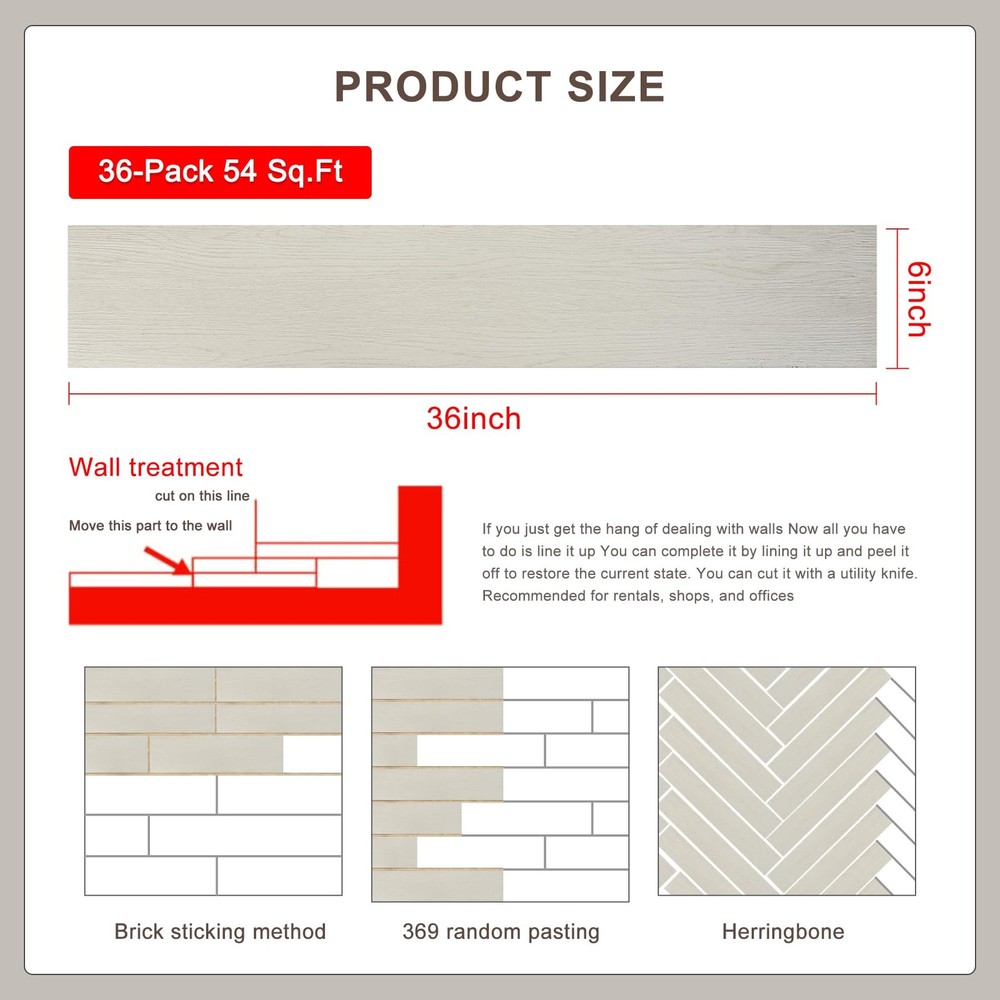 Peel and Stick Floor Tile,36-Pack 54 Sq.Ft, ,Natural Wood Look Vinyl Plank Flooring,Self Adhesive Durable and Waterproof,for Transfer Bedroom, Kitchen, RV, Bathroom and Living Room (M15, 36 PCS) 【Product specification】 brand Peel and Stick Floor Tile single block size: 36 inches long x 6 inches wide, including quantity: 36 pieces, the whole set of coverage area: 54 square feet, material: vinyl resin, style: natural wood appearance, features: heat resistance, fire proof, 100% waterproof, scratch resistance, high strength, non-slip surface design, no sticky residue. 【Natural wood appearance, easy installation】 brand Peel and Stick Floor Tile adopt real natural wood appearance and texture, which can meet the individual needs of different decorative styles and add eternal features to your home.Installation is also very convenient, just peel and paste it on the floor for installation, without power tools, experience, glue and accessories. Daily cleaning only needs to be cleaned with a wet mop. 【Excellent performance,Not sticky residue left】 brand Peel and Stick Floor Tile are made of high-quality vinyl resin materials,which can achieve 100% waterproof effect and have high-strength fire and wear resistance characteristics, even if burning cigarettes fall on them, it will not cause damage. At the same time, it adopts non-slip design, which is safer to use and more convenient to clean.The glue is made of higher quality WPU pressure-sensitive adhesive, wh ich has strong adhesion, no upturned corners, no sticky residue and no damage to the floor. It is an ideal choice for home decoration. 【Wide application in various scenes】brand Peel and Stick Floor Tile can be applied to any dust-free, flat, clean and dry surface,including marble surface, wooden floor and concrete floor. Very suitable for kitchens, bathrooms, corridors, living rooms, RVs, entrance passages, bedrooms, offices and other places.Enjoy the wonderful experience brought by brand Peel and Stick Floor Tile! 【After-sales service】This product has a one-year warranty. Before the product is delivered, our company has carried out a full inspection. If the products you receive are damaged, broken, stained and other problems, it may be caused by the transportation process. Please contact our company immediately. The company will use the best after-sales service, replace it for free or refund it in full as soon as possible to solve the problems you encounter.