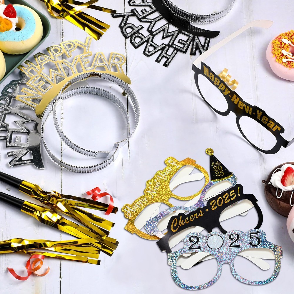 Features: Ideal gift: You can give these funny New Year eve party supplies to your family, friends, and neighbors, which are ideal New Year eve accessories to add festive atmosphere and energy to your New Year Eve party. Lightweight and reusable: 2023 New Years party favors, lightweight without adding too much pressure and easy to carry out. You can store them for next use without taking up too much space. Specifications: Material: paper, plastic Color: black, sliver and gold Size: as shown in the picture Package includes: 12 x Happy New Years eyeglasses 12 x Happy New Years headbands 12 x Musical blowouts Notes: Manual measurement, please allow slight errors on size. The color may exist a slight difference due to different screen displays. New Year Party Pack: you will get 36 pieces of happy New Year Eve party supplies, including 12 pieces of New Year glasses with 6 designs, 12 pieces of party paper headbands in 3 colors, and 12 pieces of squawker whistles, enough to meet your New Years decoration needs, bringing you a memorable party time Happy New Year Design: these 2025 new years eve party supplies favors are mainly in black, silver and gold colors, featuring 2025 and happy new year words, classic and elegant, adorable and eye catching, delicate New Year Eve accessories for role playing and taking photos Quality Materials: happy New Year Eve party headbands and glasses are made of quality cardboard paper, stable and wearproof, not easy to deform, comfortable and light to wear; While the noise maker is made of gold fringed plastic with black plastic mouthpieces, making funny noise at your upcoming New Year Eve party Suitable Size: 2025 Happy New Year party eyeglasses measure about 5.9 x 5.3 inches/ 15 x 13.5 cm, and happy New Years headband is about 4.3 x 7.1 inches/ 11 x 18 cm, suitable size for most kids and adults Wide Occasions: these New Year tiara and glasses are funny photo props for many occasions, such as New Year eve party, gatherings, celebration, Christmas, birthdays, weddings, offices, etc., adding a strong festival atmosphere to your party