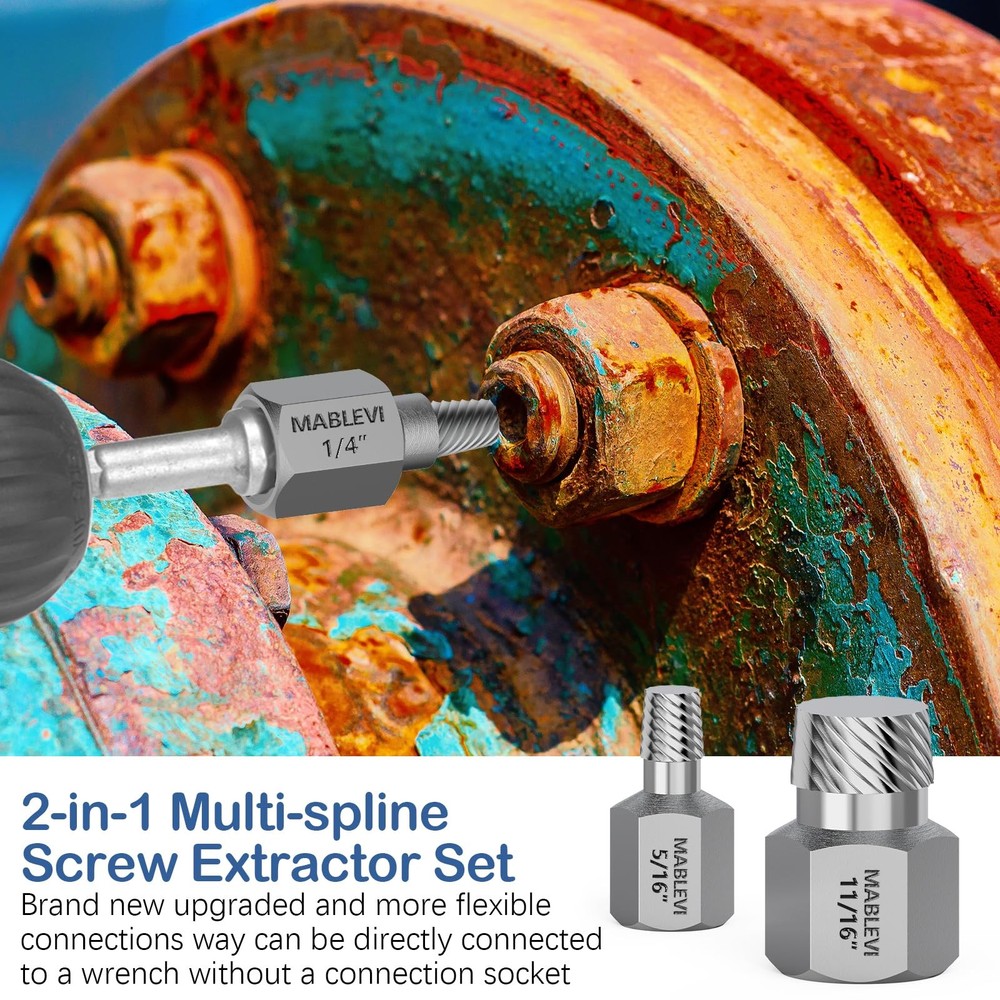 Why choose 36pcs Screw & Bolt Extractor Set? The extractor tool kit is suitable for removing most damaged, frozen, rusted fasteners including bolts, nuts, and screws, saving your time, effort, and frustration when dealing with stubborn or damaged fasteners. The inner reverse spiral groove of easy out bolt extractor set is designed to provide maximum grip, the more turns, the tighter the collet. The outside edges of the stripped screw extractor set are designed to "cut" into the damaged bolt's head to allow it to rotate and ultimately extract it. The latest version of the 2-in-1 functional screw extractor kit can be directly connected with a wrench, which is more convenient and quicker. Specifications: The screw bolt extractor remover contains 16 pcs nut remover, 13 pcs multi-spline screw extractors, 6 pcs spiral screw extractors, and a center punch bar, which meets almost all your needs. 🔧Versatile Combination: 36 Pieces screw & bolt extractor set with a center punch bar, including 16 pcs nut remover, 13 pcs multi-spline screw extractors, and 6 pcs spiral screw extractors. 🔧Bolt Extractor Set: Each extractor is made of high-hardness chrome-molybdenum steel for superior durability and longer life. It will easily extract damaged bolts, nuts, and screws even if they are stripped, rusted, or frozen. 🔧Damaged Screw Extractor Set: Spiral flutes are designed to embed themselves deeper into the metal as you turn the tool, so as the fastener resistance increases, the extractor's grip increases. 🔧Easy Out Bolt Remover Kit: Suitable for both power tools and hand tools. The double-head screw extractor set can be connected directly with a wrench, without the need for a connecting sleeve. Solve the problem of difficulty in removing damaged bolts in tight spaces. 🔧Reliable Extractor Brand: Heavy duty blow molded case for easy access and portability, perform maintenance like a pro anytime anywhere. will repair and replace any defect, without charge, and without waiting.