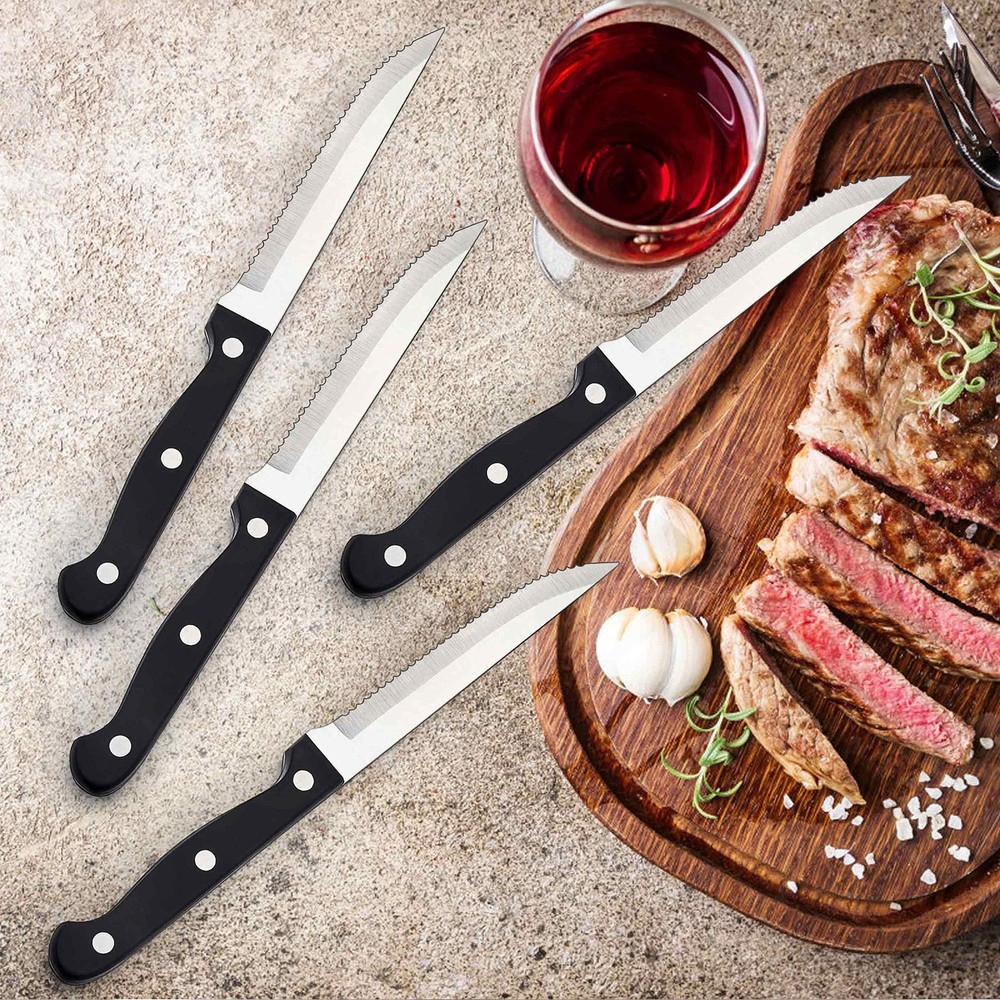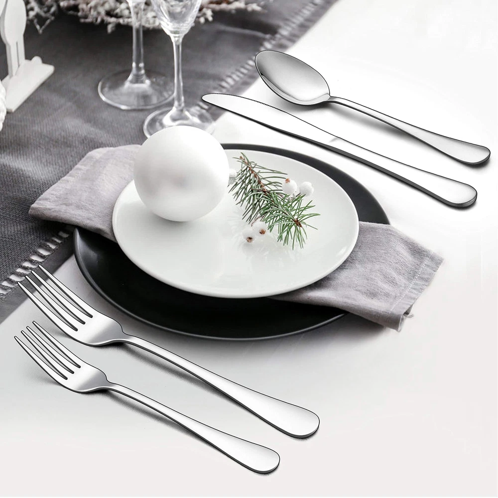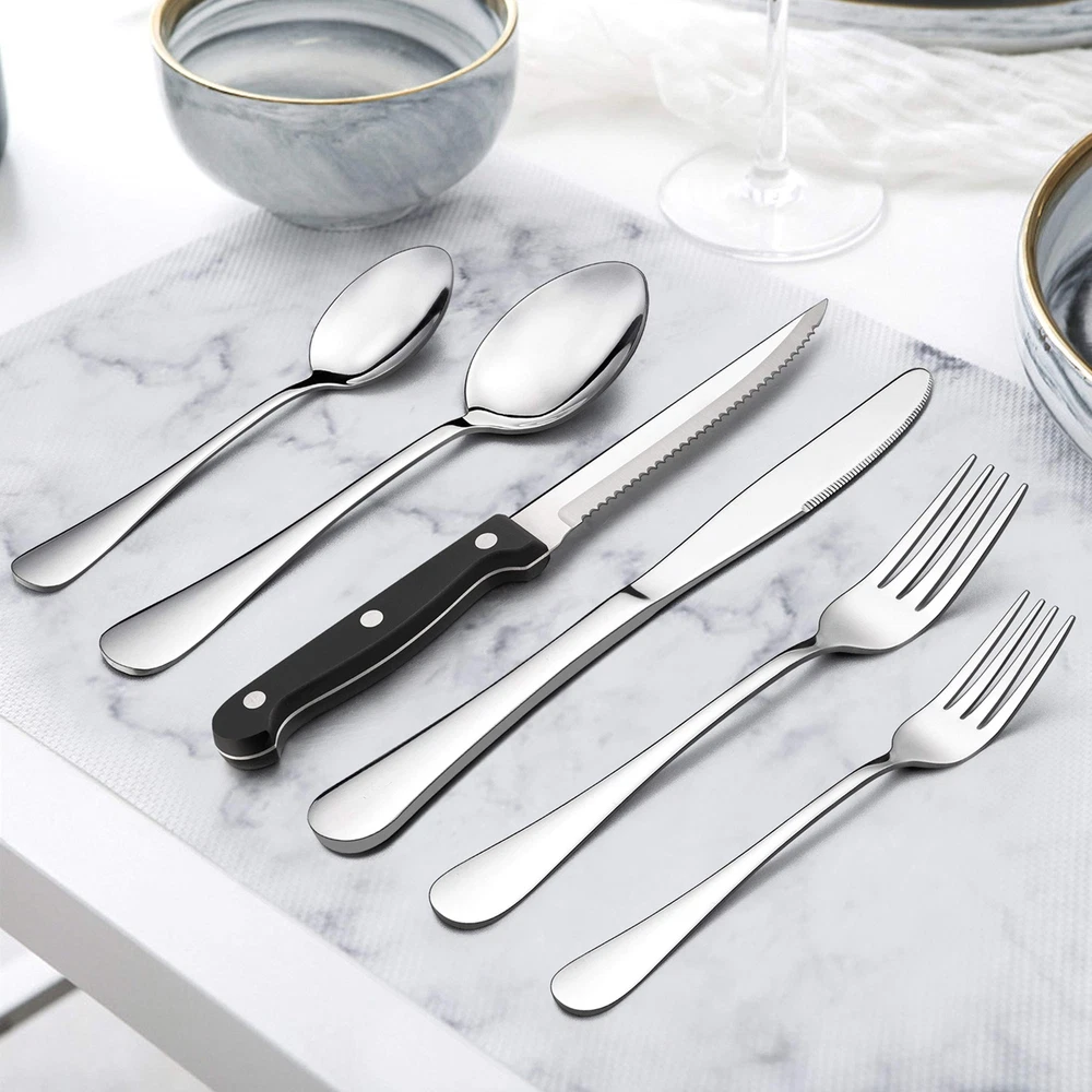 Set for 6, the flatware set consist of 6 of each dinner spoons, dinner knives, dinner forks, dessert forks, teaspoons, plus 6 steak knives, ideal for family daily use, restaurant, party, wedding, entertaining and more Attach 6 Steak knives, serrated blade is sharp enough to allow a smooth slice on all meat, ergonomically triple-rivete handle designed perfectly fit your hands, suitable for kitchen, dinner party, bbq, camping, thanksgiving Stainless steel silverware, 36pc flatware set with steak knives are made out of quality stainless steel which ensures durability, sturdy structure, rust resistant, prevents you from having to make additional investments Modern silverware, modern and classy appearance, without any redundant decoration, mirror finished keep the set shiny all the time and look as good as new, elegant flatware match well with your tableware and will provide you a fine dining experience Nice workmanship, this metal silverware has nice weight, not too light or too heavy, provide you a firm grip and well balance on hand, smooth edges without rough spots ensure your safety, sleek surface easy to clean as well dishwasher safe to save your time