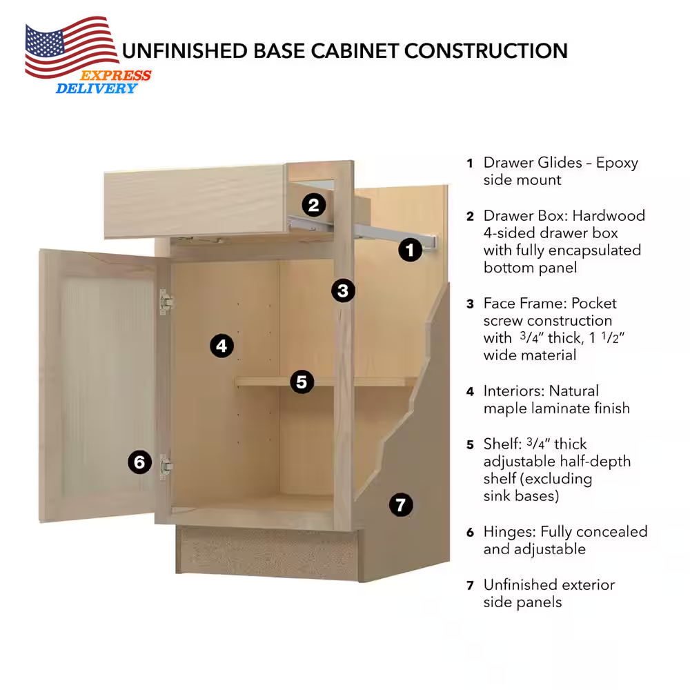 Store New Arrivals Add to Favorite View Feedback Contact 36 In W X 24 In D X 34.5 In H Corner Sink Base Kitchen Cabinet W/Recessed Panel Description Box Material Furniture Board Cabinet Construction Framed Cabinet Door Height (in) 29.37 Cabinet Door Width (in) 14.81 Cabinet Face Width (in) 18 Cabinet Finish Unfinished Cabinet Material Other Material Cabinet Shade Light Cabinet Type Corner Diagonal Color Family Brown Color/Finish Unfinished Corner Cabinet Type Standard Door Handing Reversible Door Material Beech Finished End None HUD Approved No Kitchen Cabinet Features Paintable,Stainable Number of Drawers No Drawers Number of Shelves No Shelves Overlay Type Partial Returnable 90-Day Style Traditional Manufacturer Warranty One Year Limited Warranty Assembled Depth (in) 24 in Assembled Height (in) 34.5 in Assembled Width (in) 36 in Interior Cabinet Depth (in) 22.62 in Shelf Thickness (in) 0 in Affordable assembled kitchen cabinets-ready to ship in 1-day Corner sink base cabinet-ready to assemble and easy to install Unfinished cabinet – paint and customize for a unique look The Ready-to assemble Unfinished Beech Kitchen Cabinet offers sturdy beech doors and composite box construction for long-lasting use. Recessed-panel doors and attractive unfinished beech can help add a professional, completed look to your kitchen decor. Customize your look with paint or stain. This cabinet is part of a pre-assembled kitchen cabinetry line, however, this cabinet requires assembly. ABOUT US We offer the best prices around on high quality products. Our E-store includes media such as books, movies, music and games while offering electronics, toys, sporting apparel, clothing, tools, general home, garden items and more. SHIPPING We are always working hard to ensure your package arrives as soon as possible. Please understand that some factors like weather, high postal traffic, and the performance of shipping companies are outside of our control. We offer free shipping to the lower 48 states and ship within 2 business days of payment, usually sooner. We do not accept P.O. Boxes. Please provide a physical address. For shipping outside of the continental USA, we only use eBay's Global Shipping Program.The item is shipped to KY and then sent to the rest of the world. International customers are responsible for all duties and taxes. Continue to check out in order to calculate costs for shipping the item to your country. Messages regarding eBay's Global Shipping Program MUST be directed at eBay EXCLUSIVELY. RETURNS We offer a 30-Day Return Policy on items which you are not completely satisfied with. You have the option for a full-refund or an exchange of the item. No returns are available on items shipped outside of the USA. PAYMENT We accept PayPal. CONTACT US This page content is yet to come Please ad us to your favorite seller and visit again later Thank You CUSTOMER SATISFACTION We try our very best to make sure every customer is completely satisfied. If there's a problem, message us! We're happy to help. WE ACCEPT Copyright © 2021 AutoDS. | All Rights Reserved