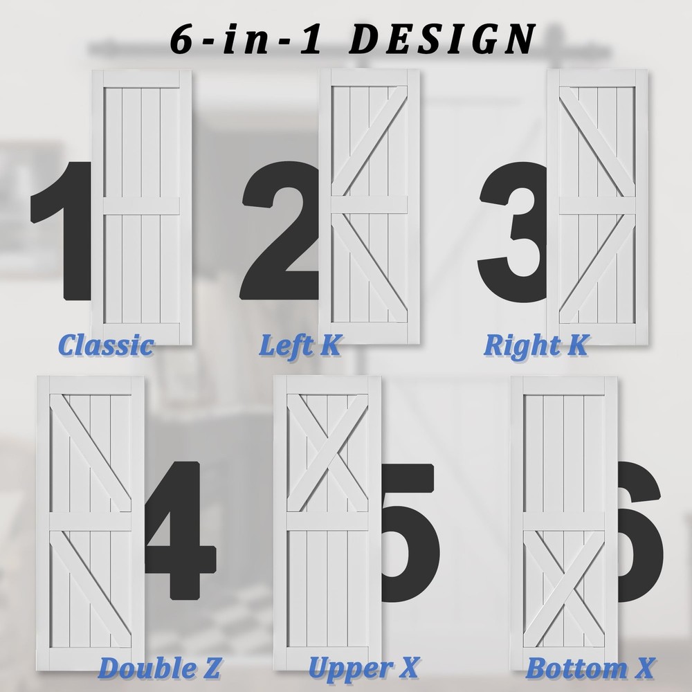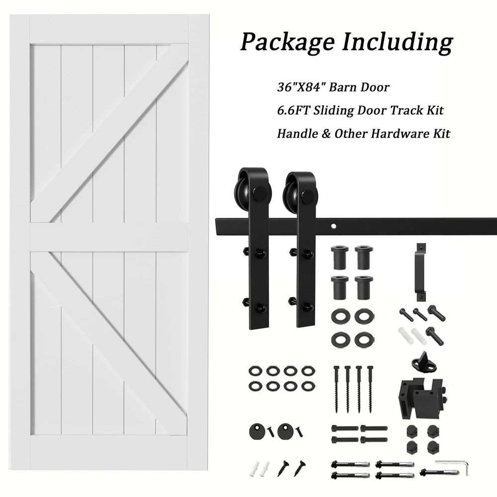 Sliding Barn Door with Hardware Track Kit, DIY Assembly, K-Frame, White Widely Use: The barn door is a perfect match with your interior room, storage room. Whether you're renovating your home or building from scratch, the White Barn Door with Hardware Kit is the perfect choice for adding a touch of sophistication and durability to any room. NO Need for a Craftsman: The package include Barn Door Slab, Sliding Hardware Kit, Handle, Floor Guide, and Installation Tools, Detailed Instruction. We also provide professional online installation guide, if you encounter any problems when you receive or use the product, please feel free to contact. (THE DOOR IS NEED TO ASSEMBLE) Easy Install: We provide step-by-step graphic & text installation parsing manual, you can also get professional installation guide from our online service. 【Water-Resistant & Scratch Resistant】 Pre-finished white paint water-resistant barn door surface is considered for durability, longevity, and ease of cleaning. High-quality solid sliding barn door surface with a flat and thin MDF can also strengthen the protection of the barn door surface, especially for families with pets. 【Easy to Install】 All wood panels are mitered for a snug fit, it is easy to assembly. Barn door is pre-drilled. A simple assembly is required, just install the rail on the wall and hang on the door, then you could have a perfect sliding barn door. 【Ideal for Various Scenarios】 Perfect for a kitchen, bedrooms, storeroom, dining room area or an elegant transition between spaces, barn doors enhance and unify your space with light and beauty, durability and beauty for long years of enjoyment. 【Package List】1x Barn Door, 1x Track Kit, 1x Handle, 1x Latch Lock, 1x Floor Guide, and Installation Manual. (Each door comes with separated planks and easy to put together) 【Guaranteed Service 24/7 Stand By】 Packaging comes with detailed barn doors and hardware included installation manual, which can be intuitively installed by yourselves. If there's any problem, please let us know, our professional Customer Service Team will actively answer them for you.