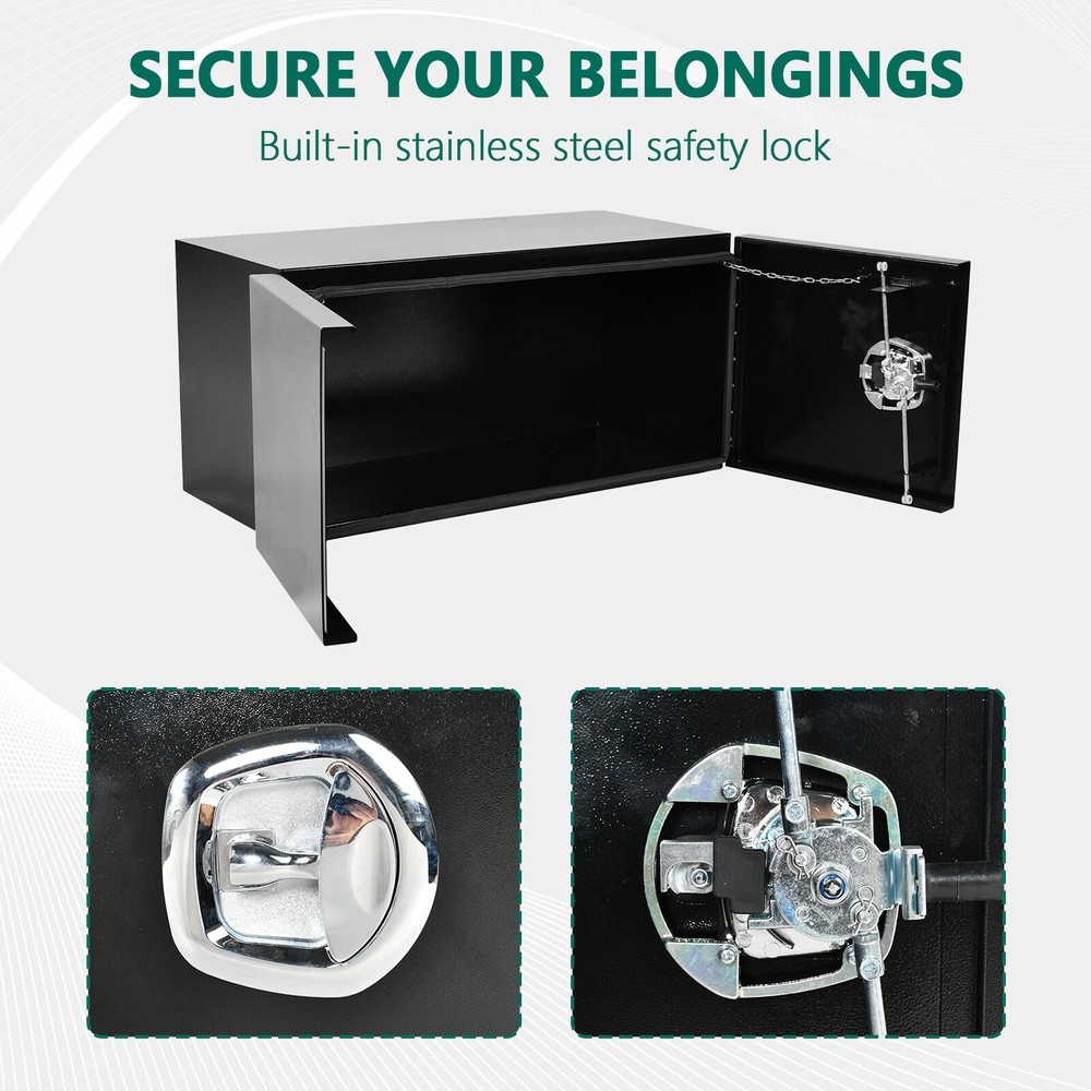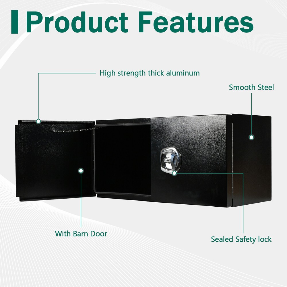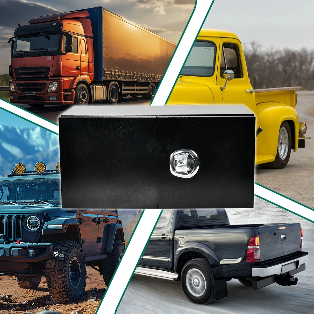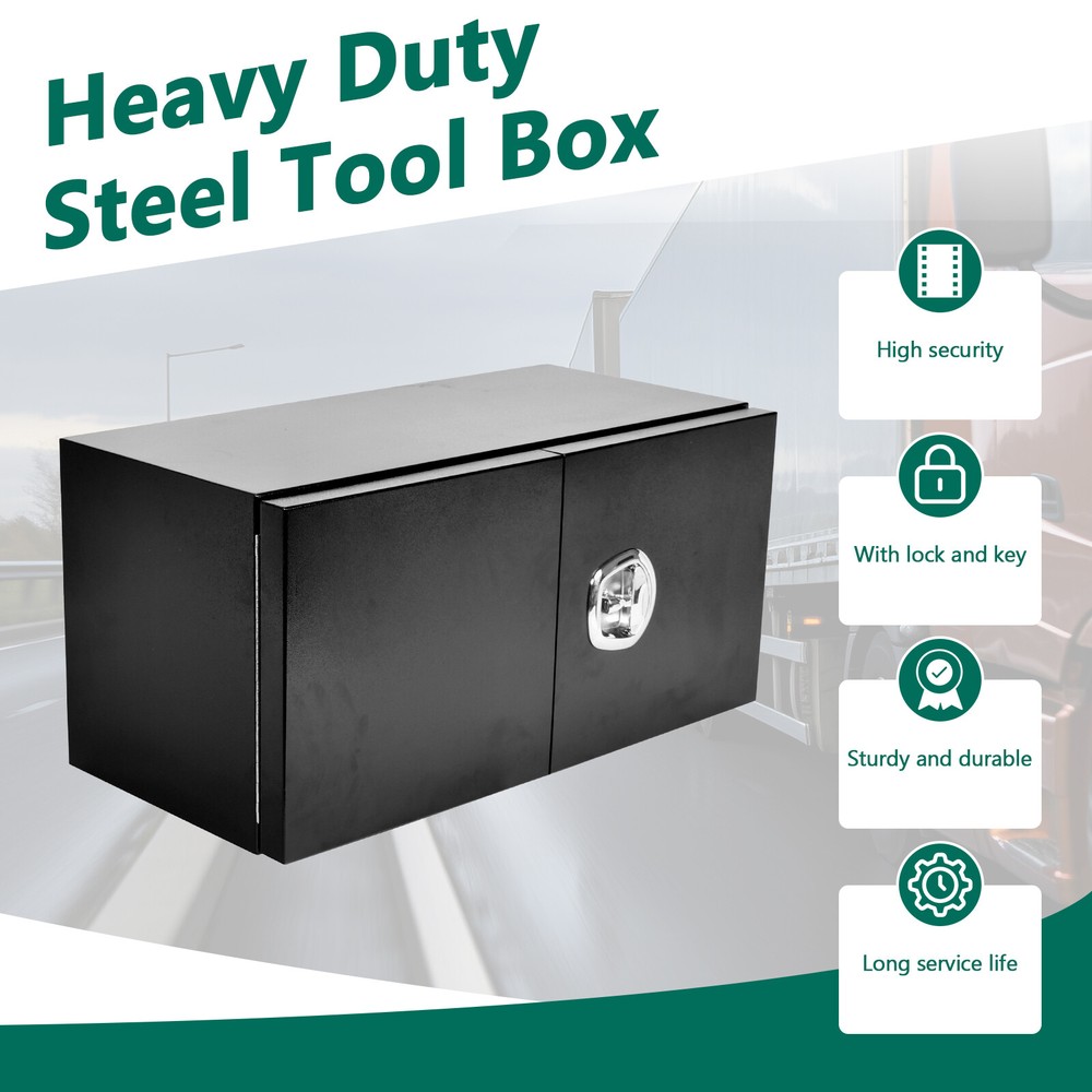 gtin13: Does not apply Materials: Steel Color: Black Overall Dimensions: 36"(L) x 18"(W) x 18"(H) Brand: fastracingo Position: Underbody Manufacturer Part Number: Does Not Apply UPC: Does not apply Thickness: 1.5mm Placement on Vehicle: Lower Fitment: For Trucks, RV, ATV, Garage storage, Trailer, Job site, Flatbed Type: Truck Tool Box