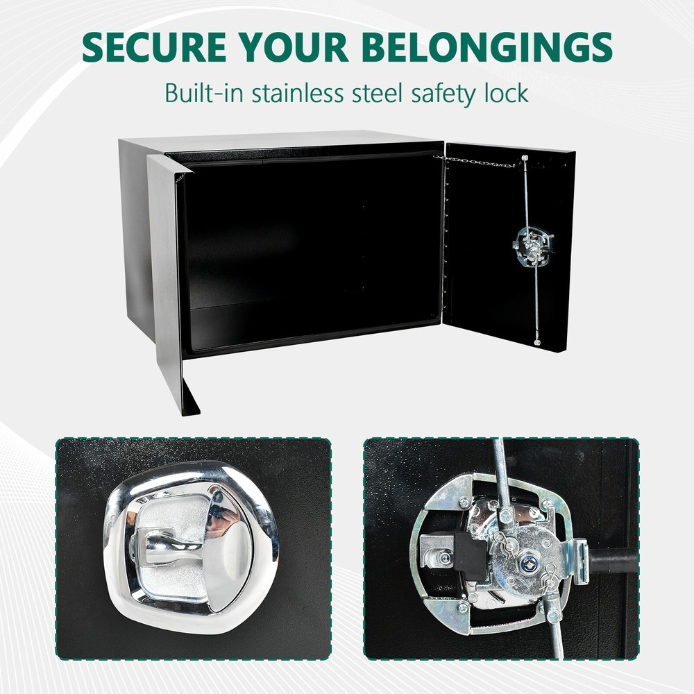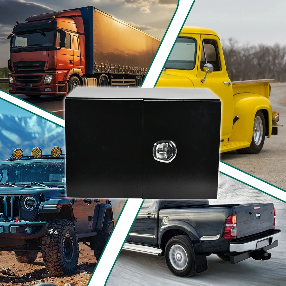 1. This steel truck bed toolbox is a game-changer for keeping gear organized and secure! The sturdy textured steel construction holds up against wear, while the weather-resistant seal keeps everything dry. Love the barn door design—easy access to tools, chains, or camping supplies without taking up much space. The lock adds peace of mind, and it fits perfectly under the truck bed. Super practical for work or road trips!