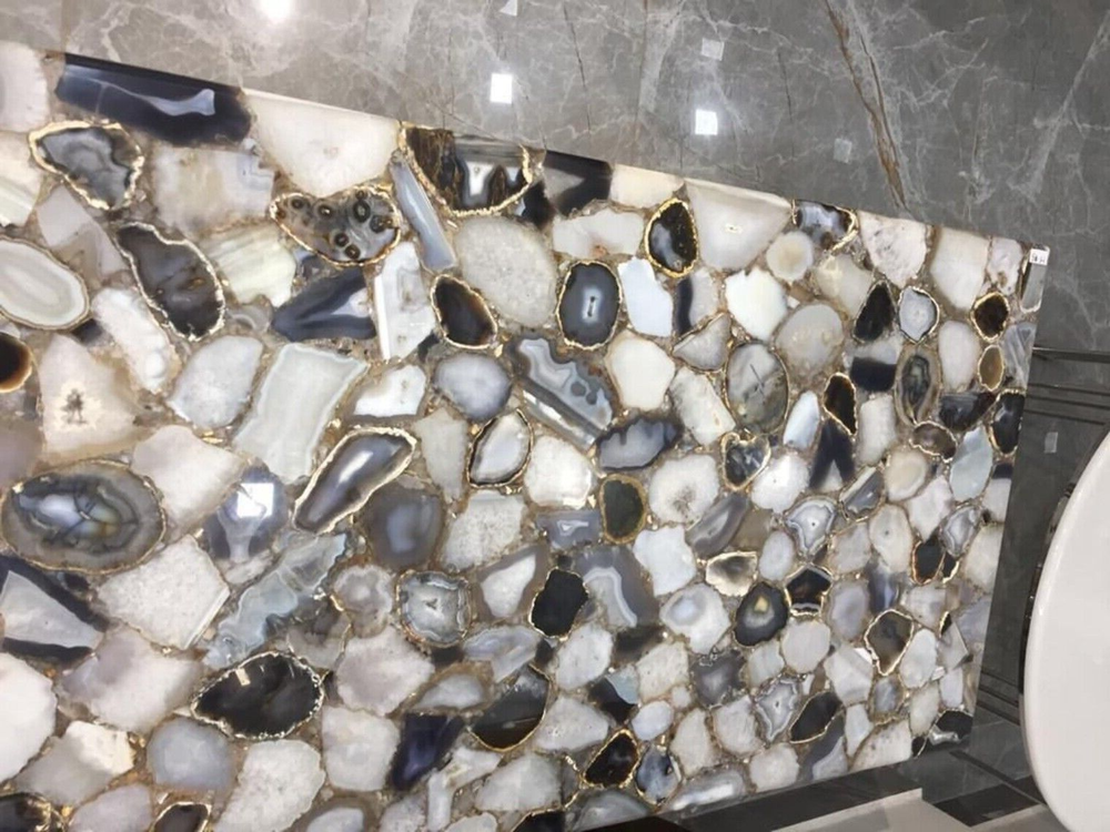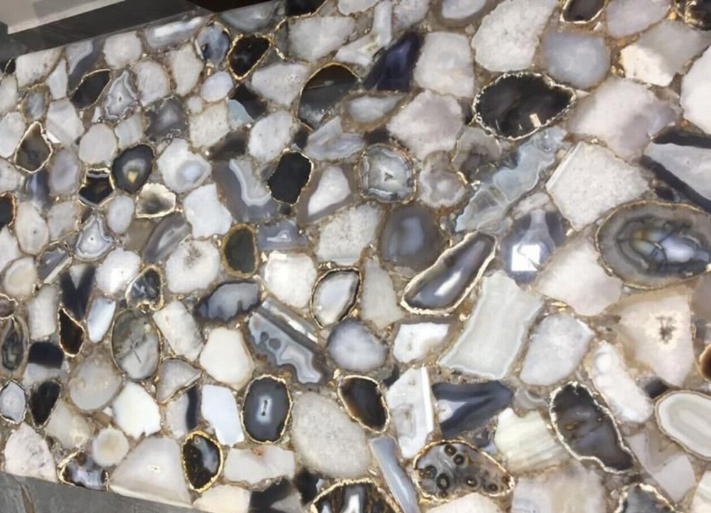 Welcome To Stone-Craft- Creations Shop Description Very unique Art by Indian Artist ,Coffee/Side Table top Used Material: Natural Agate Stones Arts Size: 48"x36" Inches Color: As Photo Shape: Rectangle Pattern: Handmade Room: Bedroom, Dining Room, Hallway, Home Office/Study, Kid’s Bedroom, Kitchen, Laundry/Utility Room, Living Room,Patio, Playroom Packaging: Wood & Foam Export Packing Shipping: Air Can Be customize ,Please Message us your desired Size 1. It can be used as a Dining Table, Guest table, coffee table, center table top in show room as well as a gift for your loved ones. 2. The table top is made in Agra India & fully handmade. 3. The top will be delivered by FedEx or DHL free of cost door to door. 4. If there is any local tax,custom duties or Vat will be paid by the buyer at the destination. 5. The parcel is dispatch with proper packing & fully insured covering all kind of risk. 6. To maintain the table top is simple soap & water & dry cotton cloth. 7. If You Are Looking Something Customize, Let Us Know We Will Make For You As Per Your Design, Size & Shape. 8.Table top does not includes any wooden, marble stand or base if you like to buy marble or wooden base or stand that will be charged extra. Marble Agate Table Tops We are Manufacturer & Exporter of marble agate table tops. These marble agate table tops have different shapes like Round Table top, Octagonal Table Tops, Rectangle / Dining table tops, Square Table tops, Chess Table tops, Taj Mahal Table tops, Custom Designs Table tops also make marble Table top Base and Stand. Then we can be used as dining tables, coffee tables, Center tables, conference tables, chess boards, reading tables, bar tables , Garden table, side and corner tables or any other use as per the indoor and outdoor decor. They can also be placed outdoors in the garden, as marble is stain free, offers great resistance to the forces of nature, and can withstand heavy temperatures. We also meet customized requirement and offer our marble table tops at industry leading prices. About Agate Stone- Agate is a rock consisting primarily of cryptocrystalline silica, chiefly chalcedony, alternating with microgranular quartz. It is characterized by its fineness of grain and variety of color. Although agates may be found in various kinds of host rock, they are classically associated with volcanic rocks and can be common in certain metamorphic rocks. Ancient use of agate stone Agate is one of the most common materials used in the art of hardstone carving, and has been recovered at a number of ancient sites, indicating its widespread use in the ancient world; for example, archaeological recovery at the Knossos site on Crete illustrates its role in Bronze Age Minoan culture Types Of Agate 1. Fortification Agate This is the most common and distinctive type of agate. In these agates, bands crystallized into concentric layers that more or less follow the shape of the cavity. The banding resembles an aerial view of a fort 2. Water-Line Agate (also called water-level or onyx) During its formation, silica-rich solution either entered the cavity slowly laying one band at a time, excess water drained out leaving a small amount of silica to settle out into separate bands, or the vesicle filled under low pressure. In any case, the silica crystallization in water-level agates is controlled by gravity in one orientation, forming a stack up of parallel bands. 3. Shadow Agate Some agates exhibit a shadow effect in which there is what appears to be movement across the agate layers when the specimen is rocked back and forth (or your orientation to the specimen moves). This optical effect only occurs when there are alternating translucent and opaque bands. It is caused when light goes into the agate, but is not reflected out. 4. Tube Agate Tube Agate During the formation of some agates, parallel projections of tiny hair-thin mineral rods grow first within the silica gel, around which later the chalcedony agate micro-crystals form. In some cases the inclusions remain, but sometimes they weather away leaving hollow tubes that subsequently fill in with silica. 5. Eye Agates This mysterious agate characteristic is believed to be formed when most of the silica gel drains from the cavity, leaving only a droplet that “beads up” on the inside wall of the cavity. This droplet crystallizes into solid chalcedony “eyes”. In some cases, crystal growth will continue from this droplet in a manner similar to the formation of stalactites in caves. Later, the pocket fills in with the usual deposition of chalcedony microcrystals. 6. Plume Agate These agates initially had formations on their outside layer that formed prior to the deposition of chalcedony bands. They are filament growths of mineral inclusions that resemble ferns or feathers. 7. Geode Agate Geode Agate In some cases the supply of silica-rich water runs out before the entire cavity fills in. When there is a hollow center within a crystalline outer fill, the specimen is considered a geode. Not all geodes have agate banding, but many do. Also, the inner layers can form into several different types of silica mineral crystals and may even have other types of mineral crystals. 8. Moss Agate Moss Agate Moss agates have clusters of mineral inclusions that resemble plants, trees, or landscapes. Most moss agate inclusions are comprised of iron or manganese oxide. In some cases, the inclusions inhibit chalcedony banding allowing the mineral clusters free reign to grow within the silica gel. 9. Seam Agate Seam agates for in cracks within host rock, rather than in rounder pockets. The bands form in parallel rows that follow and fill in the crack or seam.
