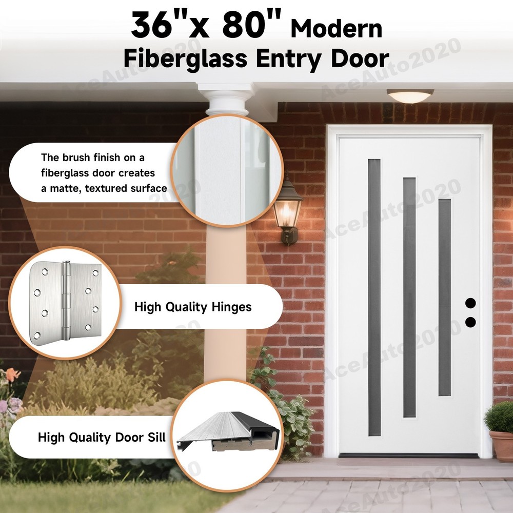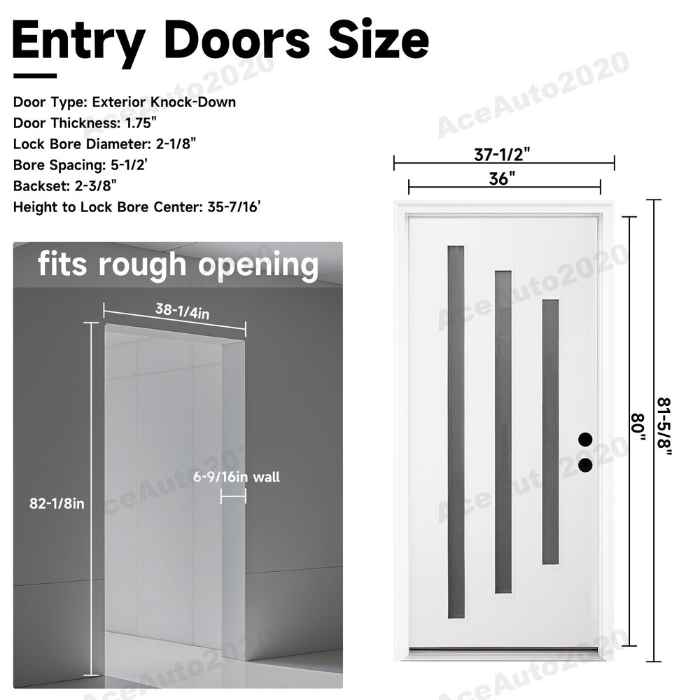 We have left-hand opening and right-hand opening doors.if you need another one,please contect us. Product Information Item Code K015-36BWLT Product Type Combo Item Product Name 36x80 Inch Contemporary 3-Lite Frosted Glass Fiberglass Entry Door - Left Hand Inswing, Vinyl Frame, Knock-Down Design, Brickmould Included, 6-9/16" White Jamb, Brush Finished Surface Place of Origin China Main Color White Finished Main Material Fiberglass Filler Fiberglass Product Style American Design,Classic,European,Luxury,Modern Use Case Garden & Outdoor Product Features High-Quality White Finished Fiberglass Door: The KHSHOW fiberglass door features a sleek white brush-finished surface, complemented by high-definition panel embossments. This versatile door can be easily painted to match any residential decor, offering customization options for various applications. Durable, Low-Maintenance Design: Constructed with LVL (Laminated Veneer Lumber) stiles, this door is designed for longevity and superior strength. The water-resistant and dent-resistant slab and frame are built to withstand high traffic and daily wear, making it ideal for both residential and commercial environments. Energy-Efficient Low-E Glass: Equipped with Low-Emissivity (Low-E) glass, this door provides excellent thermal insulation, energy efficiency, and UV protection. The glass effectively blocks over 80% of far-infrared radiation, reducing heat transfer and improving indoor comfort. It also offers sound insulation and anti-condensation properties, leading to lower energy consumption and enhanced building performance. --------------------------------------------------------------------------------------------------- Do Read before You Buy : Refund& Return -Returns are accepted within a certain period. Any problems, please feel free to contact us by eBay message first, let's figure problems out together, your email will be replied within 1 business day. -We provide a free return service, but return shipping costs will be on you in the following circumstances. 1. Changed your mind or do not need/want the item or other personal reasons. 2.Items may slightly differ from photos in terms of color and lighting differences & on different monitor’s display. 3. Manual measurement has been used, there may be some reasonable error range. 4. Choosing the wrong size , type or color causes unfitting problem. Or didn't read specifications and descriptions, causes real item is different with own imagination or expectation. 5. The buyer did not know how to install or use the item 6.Find a better price elsewhere. -Returns for free/free replacement/free parts only happen in the case of product issues/arriving broken/wrong item or missing parts. -For quality issues ,defective photos must be attached to messages/when returning. Shipment Warning : if we ship out the item and the buyer wants to cancel the order or change the address, buyer need to pay possible shipping cost. Please cancel the order or change the address before we ship out. After sales Service -we are responsible for accessories missing. Please contact us first, and attach a photo of what you've received. -we are responsible for all losses caused by product quality issues. Resend or Refund, please also attach defective photos. Feedback We do appreciate having such an opportunity to solve the problem before leaving feedback. Cause negative feedback solves NO problem, but we DO ! Hope you have a good time shopping in our store! We are honored !