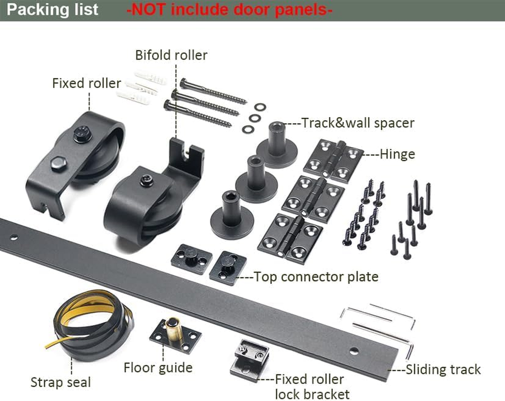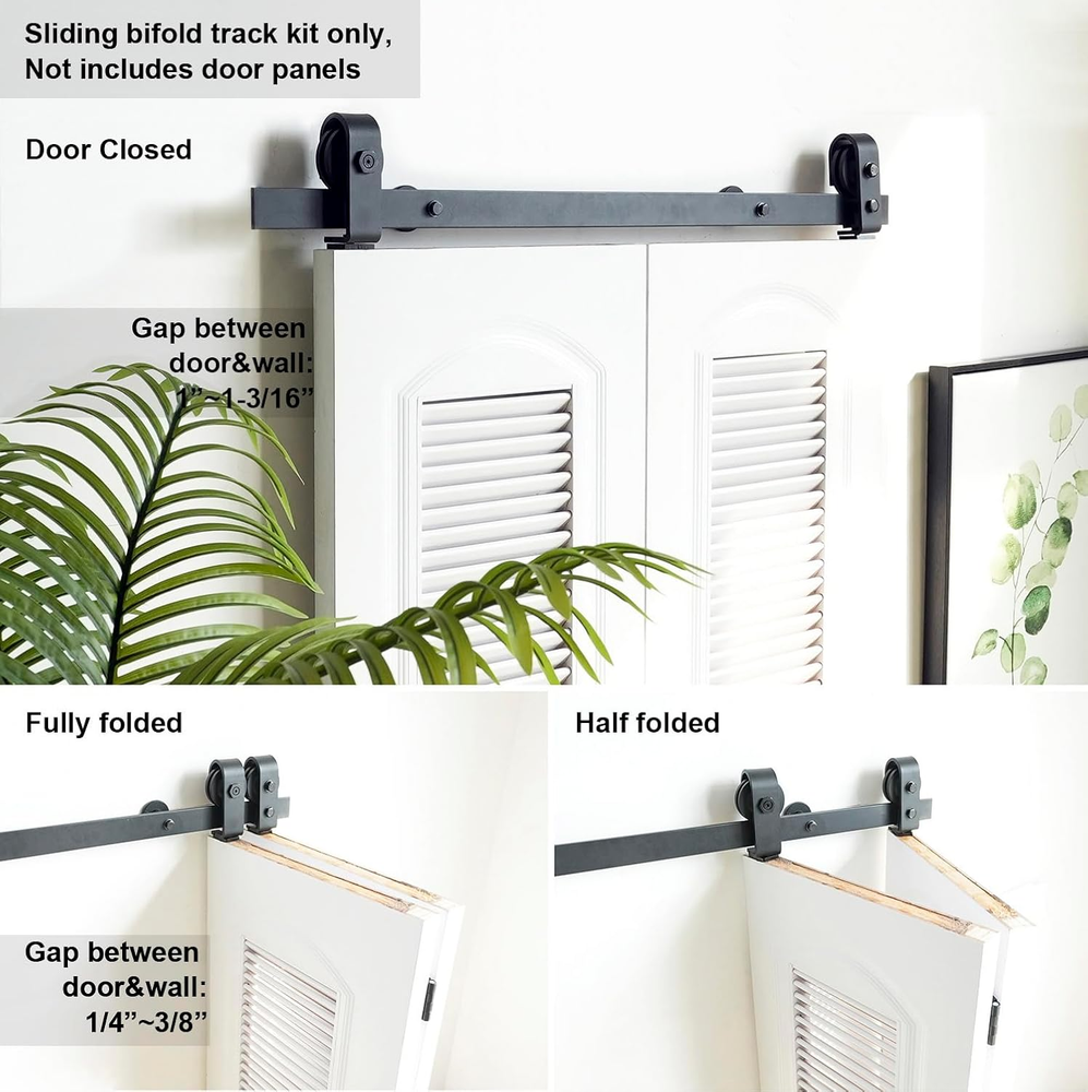 Hardware only,not including door panel Track length 37-3/8",Fit max door width 33-1/2"(16-3/4" per door);Fit door thickness: 1-3/8"~1-5/8";(DOORS NOT INCLUDED) Full set hardware including:37-3/8" track X1,StopX2,Track&wall connector X2,Floor guideX1,HingeX3,RollerX2 The height from top of the door to the top of the roller is 5-5/16" The gap between door and wall:Door closed:1"~1 3/16";Door opened:1/4"~3/8" Product Description DIYHD Bi-Folding Sliding Barn Door Hardware,Bifold Hardware and Door Sold Seperately This item is bifold hardware only,Door panel sold seperately(ASIN:B0CDKPLF2G) Track length Fit door width 37-3/8" track ≤ 33-1/2"(16-3/4" per door) 43 1/4" track ≤ 39-1/4"(19-5/8" per door) Technical Details Material Metal,POM Surface Rustic Black Fit door thickness 1-3/8"~1-3/4" Top door~top roller height 5-5/16" Top Mount Roller Kit Nylon wheels-Slide smoothly and quiet Fixed roller's location is adjustable Space saving Widely use Easy for installation Full set hardware Fixed roller with spacer X1 + Sliding roller X1 Roller&door connector X3 Track X1+Track&wall connector X 1 Set Floor guide X1 Hinge X3 Roller Floor guides Sliding track Gallary for reference,Door Panel Not Included Closed Half open Folded