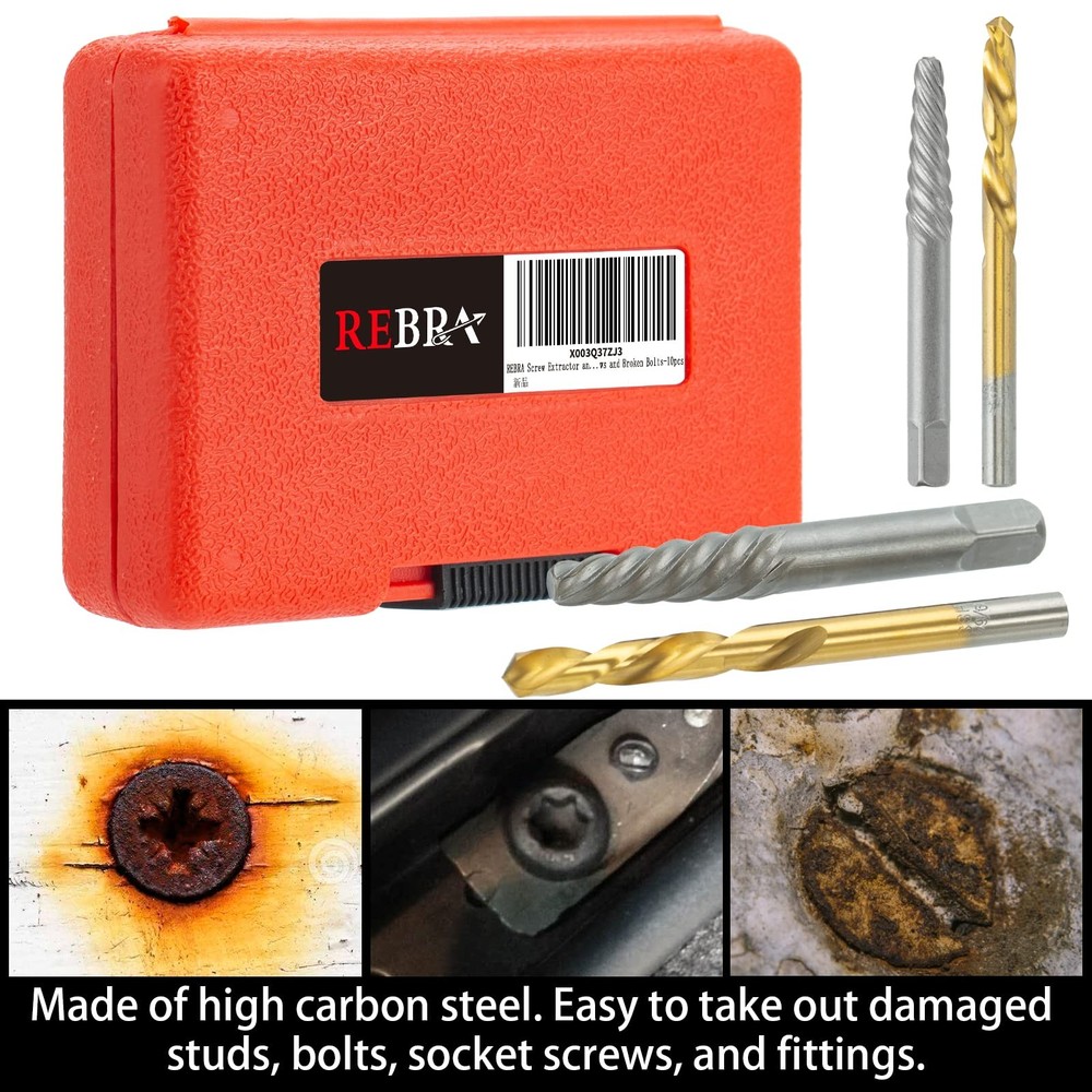 Screw Extractor and Left-Hand Drill Bit Set, Easy Out Broken Bolt Remover Reverse Cobalt HSS Steel Drill Kit, Ez Out Stripped, Rounded-Off, Damaged Bolts, Screws&Studs Removal Tool 10-Pieces 【SAVE TIME AND EFFORT】: Extraction bits easily remove broken screws, studs, bolts and other fittings effectively. Stripped bolt remover and extractor works on seized bolts, broken fasteners, and commonly called an easy out 【MULTI-PURPOSE】: Bolt extractors that remove broken screws, whether working on wood or metal, are ideal for construction, automotive, home DIY projects, or industrial use. These extractors are excellent for working in a production environment and using screw head bolts 【#6542 LEFT-HAND DRILL BIT SET】:Left-hand drill bits are made from cobalt-fortified high-speed steel for increased durability and service life. The 135° angle design of the head makes it easier to touch the fasteners and ensures precise countersinking and hole smooth clean 【MULTIPLE SIZES】: 5pcs #6542 HSS left-hand drill bits and 5pcs #37 alloy steel bolt extractors. Left-hand bits / reversed drillbits - 1/8", 5/32", 3/16", 1/4", 19/64" and Matching Alloy Extractors (stud outs) - 1#, 2#, 3#, 4#, 5# in a portable storage case that provides excellent protection and against lost screw extractors 【PREMIUM SERVICE】:We are committed to providing every customer with the best products and best service. If you have any product questions, you only need to contact us through the Amazon platform. We have a professional team to solve it for you!