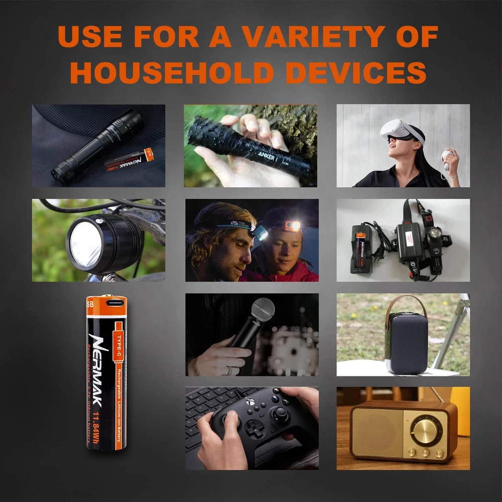 【Size Parameters】3.7V 3200mAh lithium batteries, size: 18mm(0.7 inch) diameter x 70mm(2.7 inch), (Note: they are longer than the flat-top batteries, please check the battery size before purchasing) 【Superior Performance】:Built-in USB-C port, support C-C output, you can charge your cell and other devices in case of , ordinary USB cable can be easily charged No need for additional battery charger (PD fast charging is not supported) 【Widely Uses】:NERMK 3.7V rechargeable batteries are suitable for flashlights, headlamps, toys, remote controls, microphones, radios, bike lights, bluetooth speakers, and other household devices. 【Safe and Efficient】: 3.7V battery has built-in safety protection against overcharging, over-discharging, over-current and short-circuit, with 1500+ charging cycles for longer service life, making it an ideal battery for high-frequency equipment. 【Warm Note】: 1* 3.7 Volt lithium ion battery,12 months , If you have any question for our product, us: click the "Ask a question" on our storefront or in "YOUR ORDER" options click the "seller"