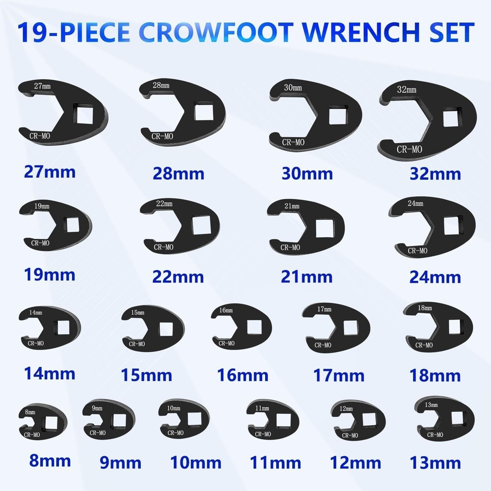 [FUNCTION]: Crows foot wrench set includes 19 size metric Crowfoot flare nut wrenches for 3/8" and 1/2" drive ratchet, extension or torque, 19 size claw adapter to extend the range of common wrenches, Allows you to reach awkward angles and hard-to-reach areas that a regular socket or wrench cannot. [PACKAGE CONTENT]: Crowfoot wrench set includes (19) crowfoot wrenches – 3/8-inch drive 8mm, 9mm, 10mm, 11mm, 12mm, 13mm, 14mm, 15mm, 16mm, 17mm, 18mm, 19mm; 1/2-inch drive 21mm, 22mm, 24mm,27mm,28mm,30mm,32mm; Packed inside (1) storage case for your convenience. [EXTENDED RANGE]: crowfoot adapter extends the reach of a standard wrench to inaccessible fasteners in tight spaces that you would not normally have access to. Once in place, your existing ratchet, extender or torque wrench will attach to the crowfoot drive hole to drive the fasteners. They are both 100% compatible with your existing metric 3/8” and 1/2” drive tools, so they can meet all your needs. [HIGH QUALITY]: Made of industrial grade, heat treated, drop forged chrome molybdenum steel to ensure nut wrench set durability, maximum torque and longevity against rust and corrosion; there are return tabs at the jaws, so You get better leverage and more grip, and they slide easily over your fasteners, [SERVE]:ZKTOOL is designed to meet the needs of various automotive tools. ZKTOOL tools are tried and tested and can be used for a large number of automotive body projects. ZKTOOL offers a wide range of tools and supplies, from special tools and accessories to general care and maintenance, to retrofit any vehicle. Warranty package returns are available for our tools, while our technicians are online 24 hours a day to support you.
