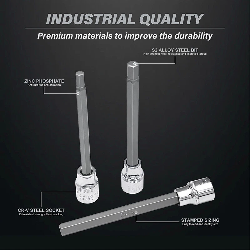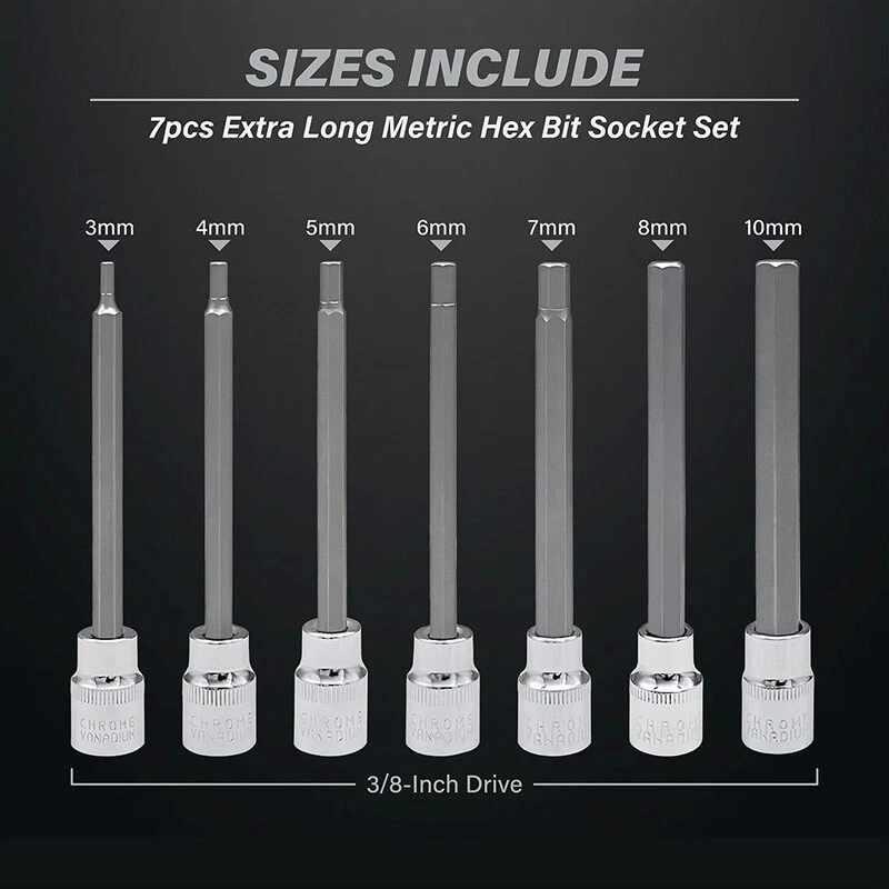Extra Long Hex Bit Socket Set 7 Piece H3-H10 CR-V and S2 Material 3/8" Drive 110mm Length Set Contains 7 Size: H3,H4,H5,H6,H7,H8,H10,making it useful for a wide range of applications including computer or auto work that have hex fasteners. Hex bits are made from premium S2 steel and chrome vanadium for extra strength that can free stubborn screws. 110mm extra long bit is designed to fit in hard to reach areas and the chamfered ends enables a secure fit onto your wrench for a non-slip grip. All hex bits and sockets are engraved for easy identification while storing neatly in a snap close case for portability. Polished chrome finish allows for easy clean up and great resistance to rust. Package Include: 7Pcs Hex Bit Sockets Notes: 1. Please allow 0.5cm/0.20in error due to manual measurement. 2. Due to the difference between different monitors, the picture may not reflect the actual color of the item, hope you can understand. On 17-May-2025 at 19:36:21 BST, seller added the following information: