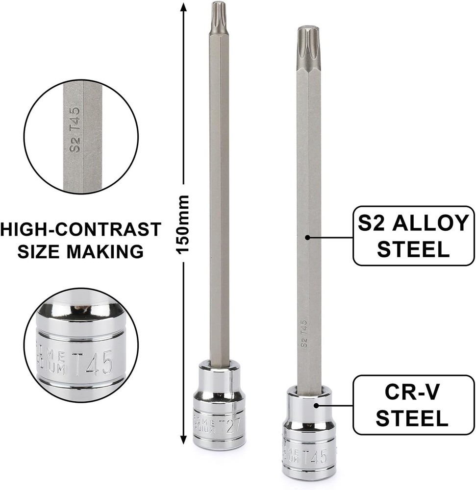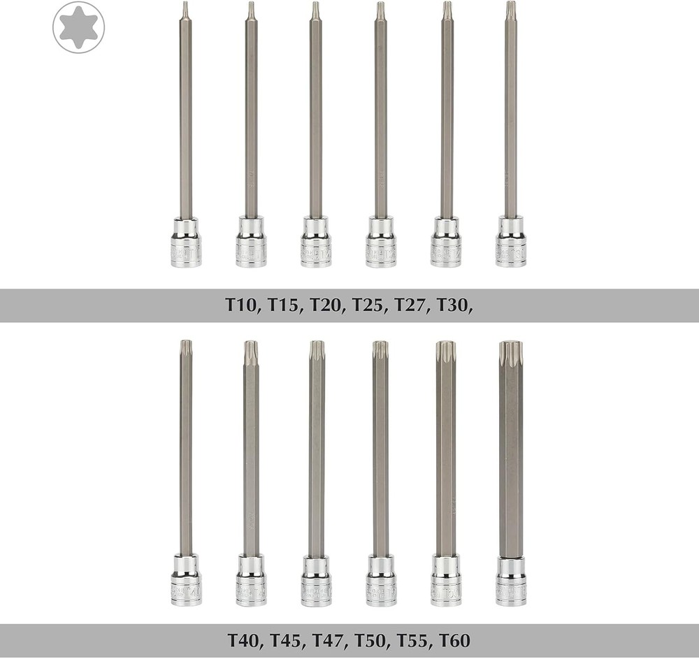 EMENTOL 12PCS 3/8" Drive Extra Long Torx Bit Socket Set, (T10 - T60) Product Details Brand: EMENTOL Item Length: 5.9 Inches Material: Chrome Vanadium Steel, S2 Steel Drive System: Star, Torx Number of Pieces: 12 Manufacturer: EMENTOL Part Number: ET571 Item Weight: 2.79 pounds Country of Origin: China Item model number: ET571 Size: 12PCS (T10 - T60) Power Source: / Compatible Fastener Range: 0.375 inches Included Components: Extra Long Torx Star Bit Socket Set Batteries Required?: No Brand: EMENTOL Item Length: 5.9 Inches Material: Chrome Vanadium Steel, S2 Steel Drive System: Star, Torx Number of Pieces: 12 The socket base is made of heat treated Chrome-Vanadium Steel, and the bit is made of S2 Alloy Steel. Which for professional and durability. Set Includes: T10, T15, T20, T25, T27, T30, T40, T45, T47, T50, T55, T60 The Extra-long design allows bit to reach deep into tight space. High contrast and specific size marking for identification. It helps you select the size easier. It comes with a sturdy and convenient storage case. Keep each piece in the proper position. All EMENTOL products meet or exceed ANSI performance standards.