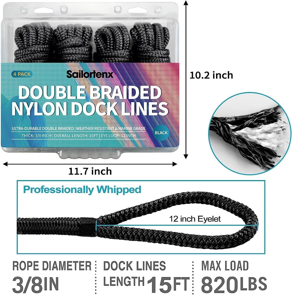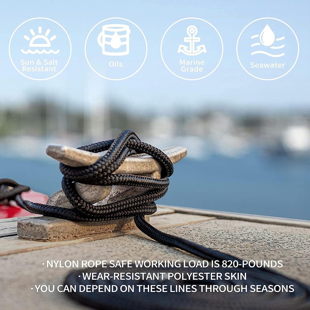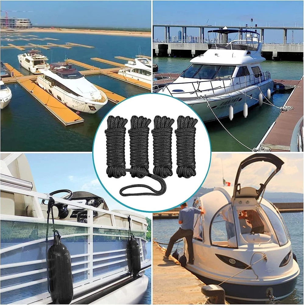 These double-braided nylon fender lines are a game-changer for boat owners! The 3/8" thickness and 15ft length provide perfect versatility, while the sturdy 12" eyelets make attachment effortless. I love that they resist kinking and rotation even under heavy use – they've held up perfectly through multiple seasons. The 4-pack is such a great value, and the black color maintains a clean look. Super impressed with the quality and durability – these outperform more expensive brands I've tried. Shipping was incredibly fast too! Highly recommend for anyone needing reliable fender lines.