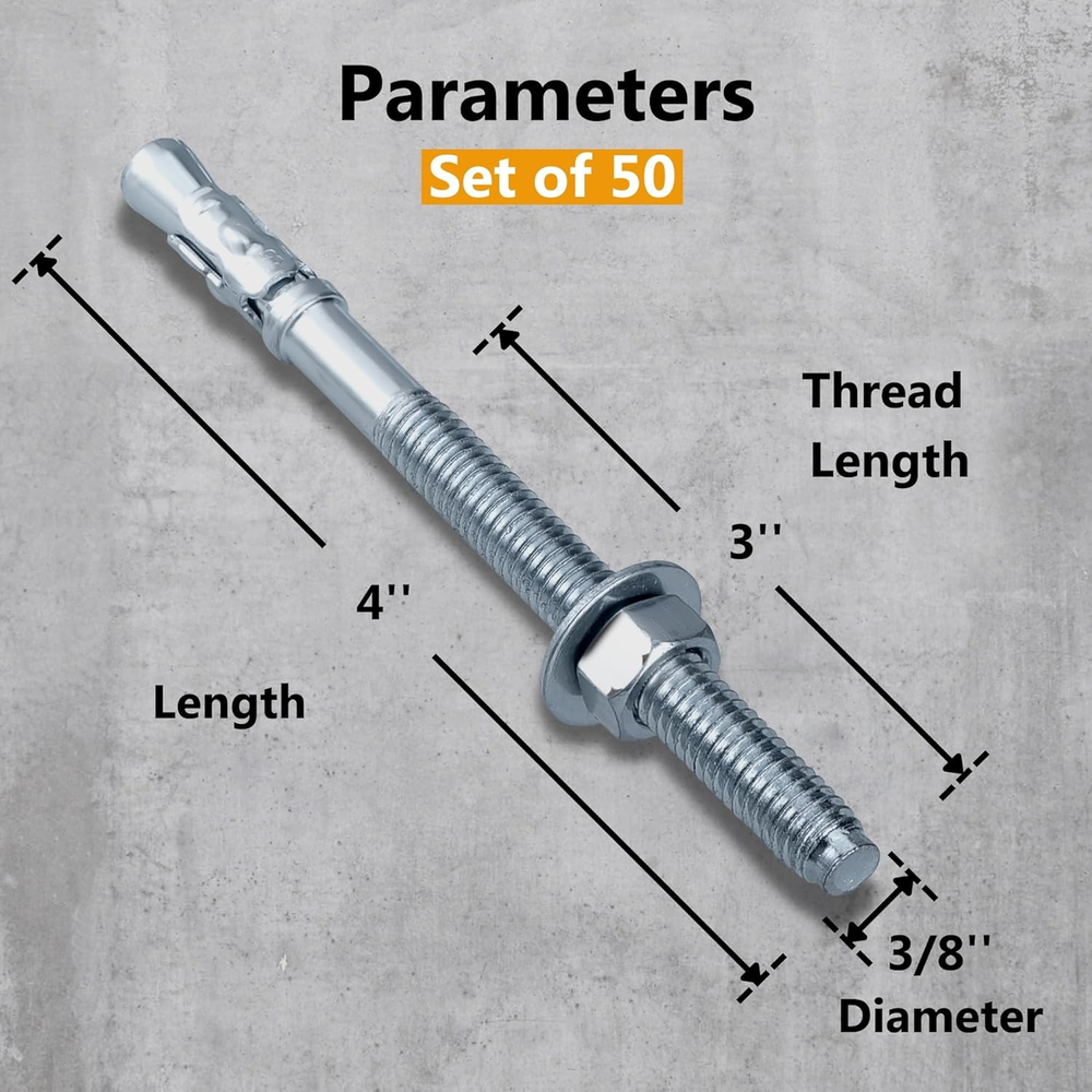 These wedge anchors are a game-changer for concrete projects! The zinc plating ensures durability against rust, and the 3/8 x 4-inch size provides a strong, reliable hold. Perfect for securing heavy-duty fixtures, beams, or machinery—no wobbling or loosening. The pack of 50 is great for pros or DIYers tackling multiple jobs. Super sturdy and easy to install, they’ve become my go-to for any concrete anchoring needs. Highly recommend!