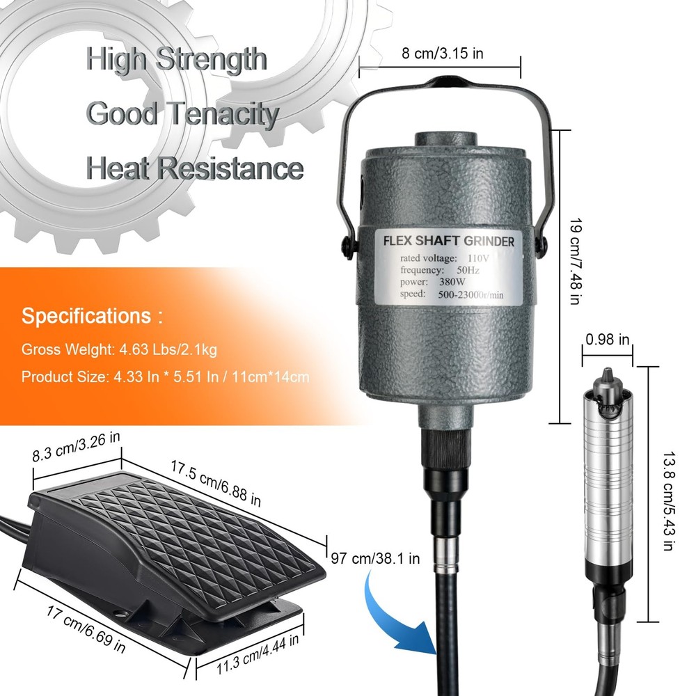 Flex Shaft Motors Safe and Smooth Controlled by Foot Pedal Used for Grinding, Carving, Drilling,Polishing, Engraving, Cleaning, 380W flex shaft motors comes complete with chuck style handpiece, electronic, foot control, extra pair of motor brushes, and a one year warrantly against manufacturing defects. 220/240V. Made in china. Features: 380W, ball-bearing, 20000rpm motor An electronic foot control with plastic housing for hands -free speed control A key-type chunk hand piece(holds shanks up to 6.5mm in diameter). Chuck range: 0.4-6.5mm. Package List Chuck Key x 1 Carbon Brush x 2 Grinding Head x 6 Sanding Bands x 10 Plastic Foot Padal x 1 Wool Plishing Wheel x 8 Grinding Stone x 1 Steel Wrench x 1 Double Mesh Disc x 3 Polishing Paste x 1 Resin Cutting Disc Set x 1 Sanding Disc Set x 1 Sanding Tape Connect Rod x 3 Flex Shaft Grinder x 1 【High-Speed Precision Motor】Delivers up to 30,000 RPM with a 380W motor for smooth, consistent power. Ideal for intricate detailing, fine polishing, or heavy-duty grinding. Built-in vents prevent overheating, ensuring stable and long-lasting performance. 【Flexible Shaft Convenience】Work with both hands freely! The overhead motor and long flexible shaft give you full control to maneuver in tight spaces, perfect for delicate work on jewelry, miniatures, and detailed carvings. 【All-in-One 83 Kit】Comes fully equipped with 83 accessories for cutting, drilling, sanding, and polishing—plus a rotating bur holder and safety goggles. Save time and stay organized while protecting your eyes from flying debris. 【Hands-Free Foot Pedal】Control speed with your foot for smoother work flow. The upgraded ABS pedal features stepless speed adjustment and a locking screw for setting constant speed—perfect for longer projects. 【Professional Multi-Use Tool】A true all-rounder for DIYers and pros. Whether you're working with metal, wood, stone, or jewelry, this tool handles polishing, engraving, grinding, and more—bringing precision to every project.
