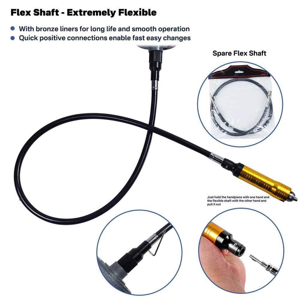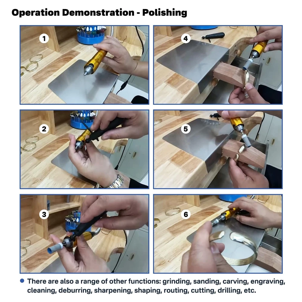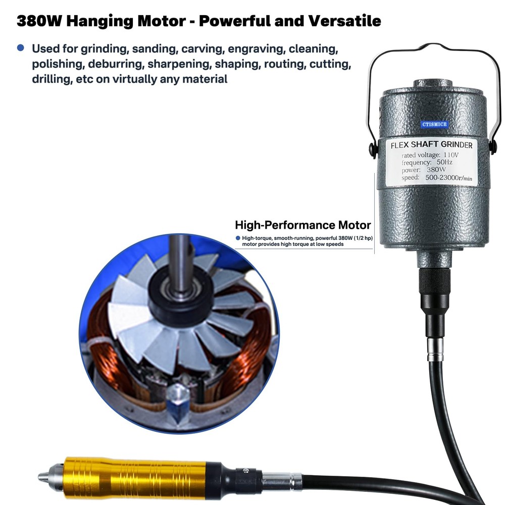 tools are widely used in the jewelry, woodworking, metalworking and automotive industries for their versatility and high precision. These rotary tools can be used for a variety of tasks, including cutting, sanding, grinding, polishing, drilling, etc. rotary tools and flexible shaft machines are manufactured to industrial standards and are renowned for their quality and reliability. A complete flexible shaft machine has a motor that rotates a flexible shaft connected to a precision handpiece, plus – it needs a speed control adjustable by foot. Flex Shaft Grinder Specifications: Rated voltage: 110 V Frequency: 50 Hz Power: 380 W Speed: 500-23000 r/min 3-Jaw Chuck: 1/4'' (6mm) Chunk Range: 0.012-0.26'' (0.3-6.5mm ) Accessories Included: Cutting: Diameter: 15/16" (23.8mm) Cutting Wheels x 36 Shank: 1/8'' (3.2mm) Rotary Tool Mandrel x 1 Sanding Diameter: 1 1/4" (31.8mm) Sanding Discs x 3 Sanding Band x 10 Sandpaper x 36 Mandrel x 1 Cleaning & Polishing Carbon Steel Brush x 2 Dressing Stone x 1 Diameter 1'' (25.4mm) Felt Polishing Wheel x 1 Diameter 1/2'' (15.7mm) Felt Polishing Wheel x 6 Felt Polishing Cone x1 Shank: 1/8'' (3.2mm) Mandrel x 1 Grinding & Sharpening Aluminum Oxide Grinding Stone x 2 Silicon Carbide Grinding Stone x 2 Chainsaw Sharpening Grinding Stone x 2 Why Choose ? 1. Flex shaft rotary tools offer higher power and precision. 2. tool provides greater control and flexibility when working with small and delicate parts. 3. tools are more versatile, with a wider range of compatible accessories and accessories. 4. tools are known for their durability and reliability, making them a popular choice among professionals 380W All-Copper Motor: The powerful 380W motor provides the electric flexible shaft grinder with a wide speed range of 500-23000 rpm, making it the ideal rotary tool for those detailed projects that require precision and power 3 in1 39 in Flexible Shaft: The 39-inch flexible shaft is composed of a plastic shell (protective sheath), an inner flex shaft cable (inner core) and a high-precision three-jaw chuck, which is flexible, safe and stable. (Note: with 1 replacement flex shaft) Upgraded Foot Switch: The variable speed foot controller is made of upgraded ABS material with high strength and toughness that is safer than ordinary materials, and can achieve infinite speed changes, feeling like you are in control of everything. The power cord is extended to 70 in, and the cord for connecting to the motor is extended to 50 in 105pcs Multipurpose Accessories: This flexible shaft grinder comes with many attachments for grinding, cutting, cleaning, polishing, sanding, deburring, grout removal, etc. Cutting wheels, sanding discs, sanding bands, carbon steel brushes, wire brushes, polishing wheels, polishing cones, grinding stone sets, etc. Can meet your different needs Wide Range of Applications: Used for finishing, grinding and adding texture to different materials such as metal, wood, stone, jewelry and more. It's ideal for professionals, craft enthusiasts and DIY enthusiasts at the workbench, workshop and studio