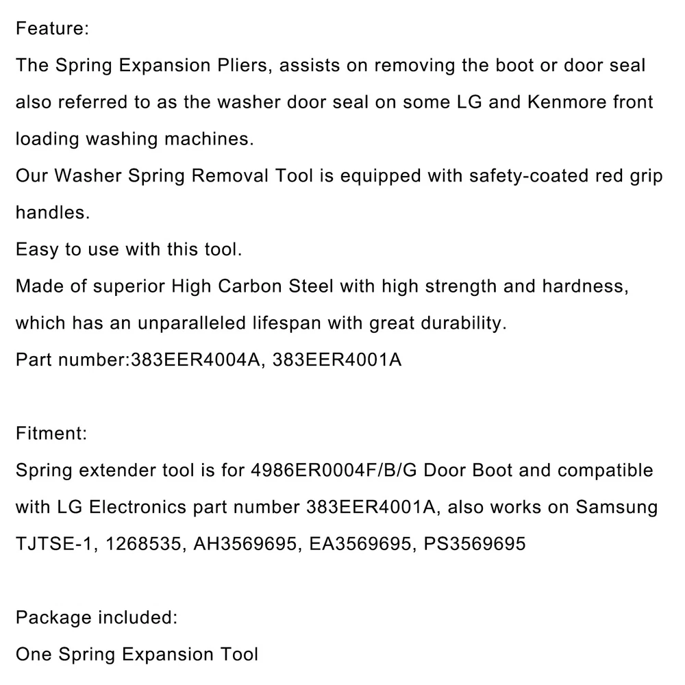 Product Description Feature: The Spring Expansion Pliers, assists on removing the boot or door seal also referred to as the washer door seal on some LG and Kenmore front loading washing machines. Our Washer Spring Removal Tool is equipped with safety-coated red grip handles. Easy to use with this tool. Made of superior High Carbon Steel with high strength and hardness, which has an unparalleled lifespan with great durability. Part number:383EER4004A, 383EER4001A Fitment: Spring extender tool is for 4986ER0004F/B/G Door Boot and compatible with LG Electronics part number 383EER4001A, also works on Samsung TJTSE-1, 1268535, AH3569695, EA3569695, PS3569695 Package included: One Spring Expansion Tool About Us Shipping Terms Returns Contact Us About Item All items sold by us are being described to the best of our abilities, as accurate as possible, and with utmost conscientiousness on our part. However, to avoid any potential oversights, I respectfully request your assistance in helping us to make this a mutually satisfactory transaction by THOROUGHLY reviewing item description and photos, and asking all questions PRIOR TO BIDDING. Customer Satisfactory 1.We back our commitment with superb service, 100% full money back and a customer satisfaction guarantee. 2.I am here and ready to assist you with any questions or concerns you might have before or after the purchase. 3.My goal is to make sure you are a happy customer and pleasant shopping with us. Feedback If you are satisfied with the purchase and our total service, your comment is very important in our business success. Please take a minute to leave us a positive feedback with an overall Detailed Selling Rating (DSR) of 5. Our eBay account setup auto feedback, so eBay system gives you automatically Positive feedback back after your positive feedback left. IF YOU PLAN TO GIVE US A NEUTRAL/NEGATIVE FEEDBACK OR OPEN EBAY/PAYPAL CASE, PLEASE WRITE TO US IMMEDIATELY SO THAT WE CAN DO OUR BEST TO RESOLVE YOUR PROBLEM. United States Buyers Same business day free shipping within United States All orders will be shipped through USPS First Class, UPS and Fedex depends on the weight of the items. Shipping Time Usually ,Parcel will be delivered 2-5 working day include Handling time. Sometimes shiping time may has a little delay, such as Bad wether,Holidays We stand behind everything that we sell and will do everything possible to assure you are satisfied. When you receive your purchase if you are not 100% satisfied, please sent me ebay message and we will do our best to make you happy. If you still want to return your purchase, simply ship the item(s) back to us and we will refund your original purchase price and the original shipping charge. Buyers are responsible for the postal cost of returning the items. We must be notified of the intent to return your item within 30 days of receiving the item. Items returned must be in the same condition that they were received. How to return 1,Please ask us for return address . 2,Shipping back the package . The RMA#(Return Merchant Authorization Number = Your ebay ID) must be clearly written on the return package ,Otherwise the package will be refused. 3,Sent us the return tracking number. 4,All returns will be inspected prior to a credit being issued. 1:Returns are accepted within 60 days of purchase. 2:All returned items MUST BE in the original packaging. 3:We will be happy to assist you if if any item needs to be returned or replaced 4:Please don't open a return request before contacting us first to solve, many thanks. Sent ebay message in English If you have any questions, our Customer Service staffs welcome you to sent me ebay message. We strive to answer all questions and resolve any problems as quickly as possible. Business Hours: Monday-Saturday 9:00-17:00 About Us About Item All items sold by us are being described to the best of our abilities, as accurate as possible, and with utmost conscientiousness on our part. However, to avoid any potential oversights, I respectfully request your assistance in helping us to make this a mutually satisfactory transaction by THOROUGHLY reviewing item description and photos, and asking all questions PRIOR TO BIDDING. Customer Satisfactory 1.We back our commitment with superb service, 100% full money back and a customer satisfaction guarantee. 2.I am here and ready to assist you with any questions or concerns you might have before or after the purchase. 3.My goal is to make sure you are a happy customer and pleasant shopping with us. Feedback If you are satisfied with the purchase and our total service, your comment is very important in our business success. Please take a minute to leave us a positive feedback with an overall Detailed Selling Rating (DSR) of 5. Our eBay account setup auto feedback, so eBay system gives you automatically Positive feedback back after your positive feedback left. IF YOU PLAN TO GIVE US A NEUTRAL/NEGATIVE FEEDBACK OR OPEN EBAY/PAYPAL CASE, PLEASE WRITE TO US IMMEDIATELY SO THAT WE CAN DO OUR BEST TO RESOLVE YOUR PROBLEM. Shipping United States Buyers Same business day free shipping within United States All orders will be shipped through USPS First Class, UPS and Fedex depends on the weight of the items. Shipping Time Usually ,Parcel will be delivered 2-5 working day include Handling time. Sometimes shiping time may has a little delay, such as Bad wether,Holidays Terms We stand behind everything that we sell and will do everything possible to assure you are satisfied. When you receive your purchase if you are not 100% satisfied, please sent me ebay message and we will do our best to make you happy. If you still want to return your purchase, simply ship the item(s) back to us and we will refund your original purchase price and the original shipping charge. Buyers are responsible for the postal cost of returning the items. We must be notified of the intent to return your item within 30 days of receiving the item. Items returned must be in the 