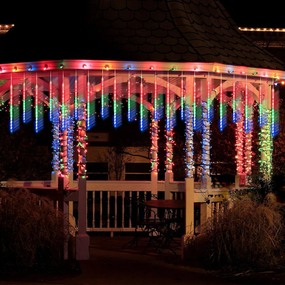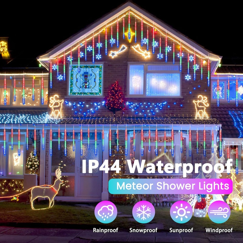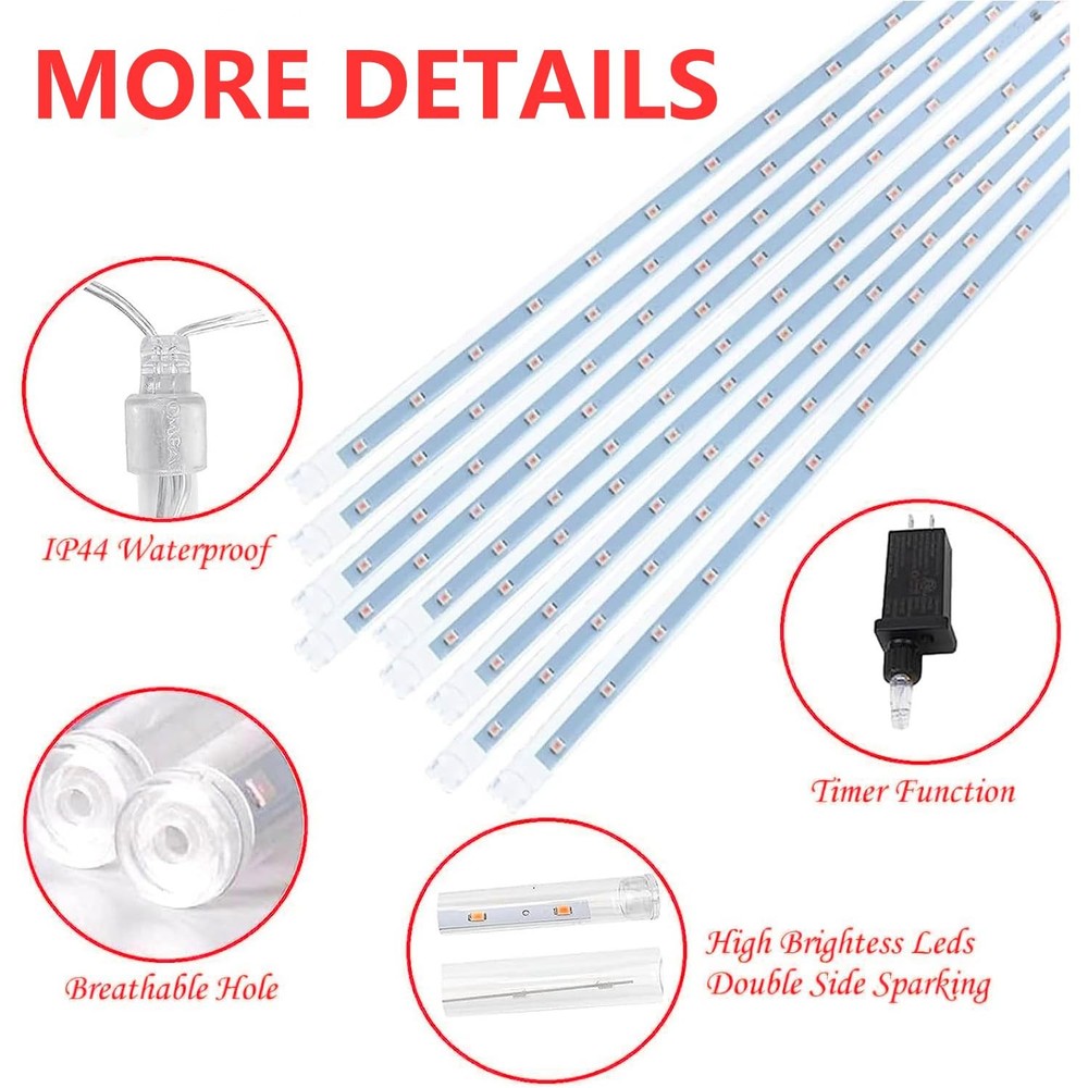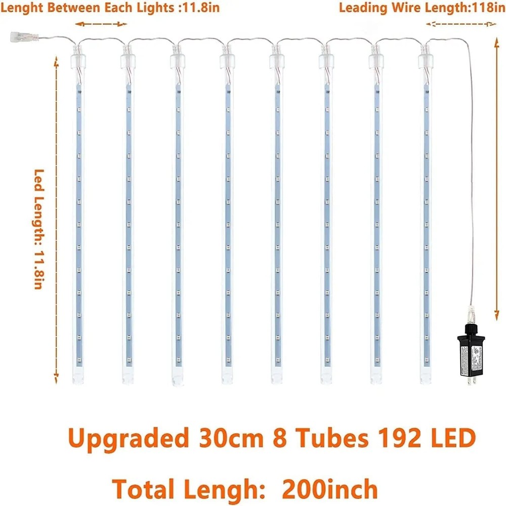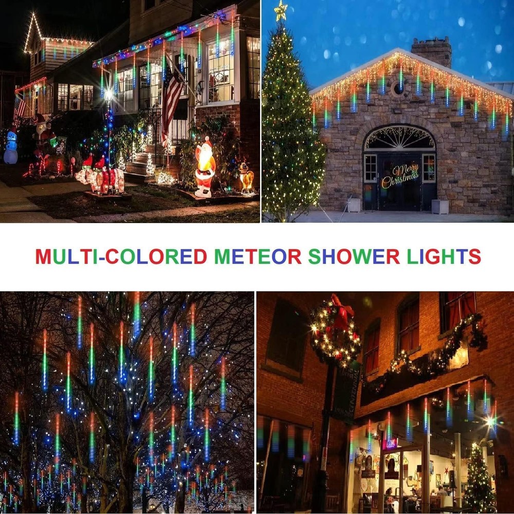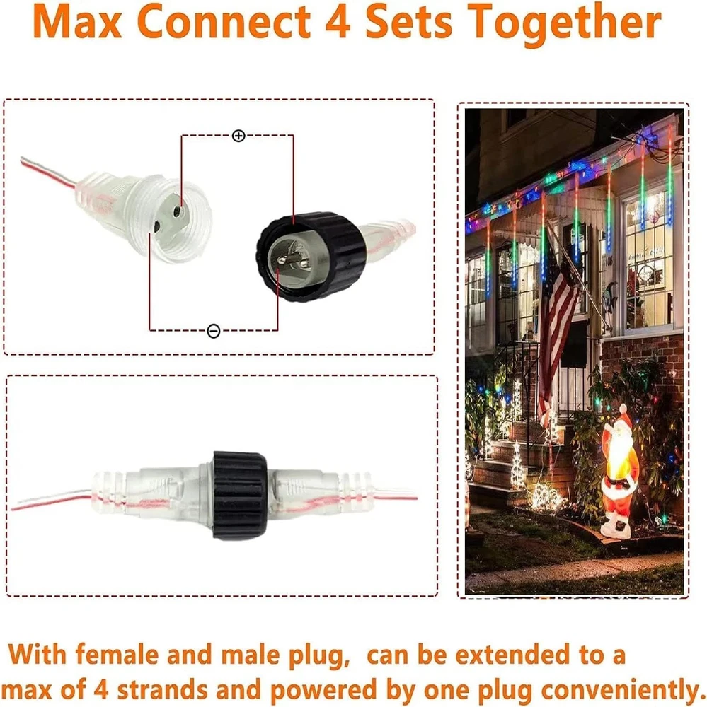 2-Pack Total 384LED Meteor Shower Lights Christmas Decorations String Lights 30cm 16 Tubes Outdoor Indoor Connectable for Xmas Tree Wedding Party Garden Decor (Multi-Colored) Multi-colored Meteor Shower Rain Lights: Each package contains 2 sets of connectable lights. Each set light has 8 tubes with 192 LEDs. Total 16 tubes with 394LEDs. The LEDs are double-sided inside the tubes which make it illuminates from any angle Connectable Christmas Lights with End-to-end Connector: The LED string lights can be connected by its male and female connectors up to 4 sets together. It is an ideal product for your holiday and xmas tree decorations indoor/outdoor IP44 Waterproof: the string light part has IP44 waterproof function and can be widely used indoor outdoor. But please always keep the UL adapter in dry place. Please also tighten the connectors and end cap for outdoor use Safe UL Adapter and Easy for use: Just decorate the place you prefer and plug the adapter into socket, the light will turn on. Unplug it to turn off the light. The safe UL adapter will free you from worrying about the overheat and safety issue Widely Used LED Falling Rain Lights: The decorative lights are perfect for Christmas tree, party, Valentine's Day, wedding, windowsill, roofline, festival, Halloween, Holiday, restaurant, hotel, commercial building, shopping center etc Outstanding Customer Service: If you have any question or problem about our product, please feel free to contact us and our customer service team will respond you in twenty-four hours