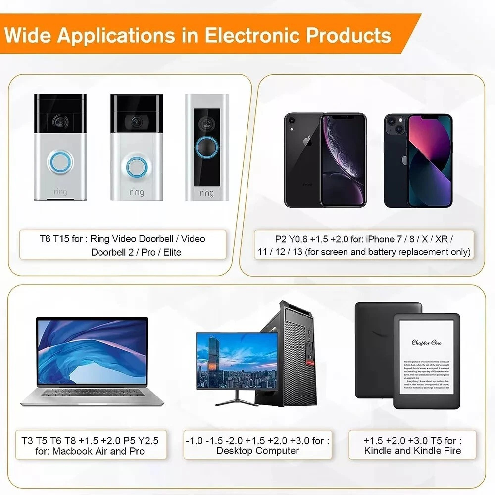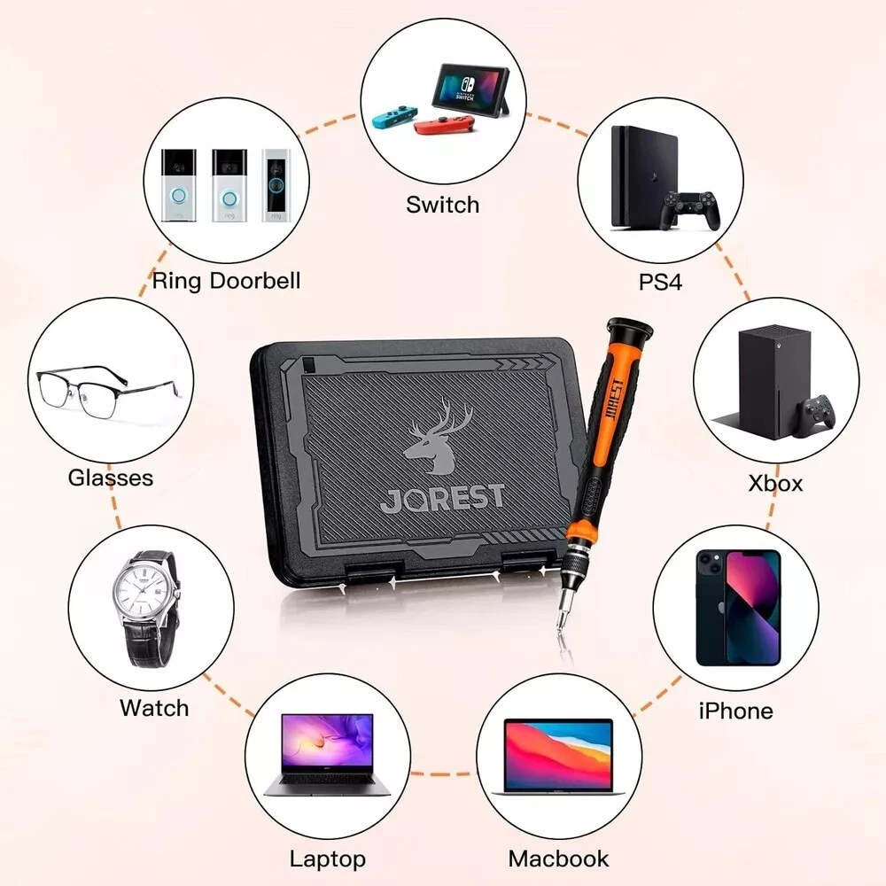 38-Piece Precision Screwdriver Set - Torx T5, T6, Y00 Mini Repair Tool Kit for Electronics 【Precision screwdriver set】 -- 38Pcs screwdriver set has 30 CRV screwdriver bits which are phillips PH000(+1.2) PH000(+1.5) PH00(+2.0) PH0(+3.0) PH1(+4.0), flathead -0.8 -1.2 -1.5 -2.5 -3.0, torx T1 T2 T3 T4 T5, torx security TR6 TR7 TR8 TR9 TR10 TR15 TR20, triwing Y000(Y0.6) Y00(Y1.5) Y0(Y2.5) Y1(Y3.0), pentalobe P2(0.8) P5(1.2) P6(1.5), MID 2.5, with a screwdriver handle, a double-ended spudger, a long spudger, a triangle spudger, Tweezers, a cleaning brush and a suction cup with SIM card thimble. 【Slip-resistant rotatable handle 】-- All our screwdriver bits are made of high quality CR-V chrome vanadium steel. CR-V screwdriver bits do not rust easily and are not prone to be broken. The screwdriver handle is made of TPR and PP materials, with a special non-slip design, offering a sense of comfortable. The top of the handle is rotatable design which makes it more convenient to remove the screws; the handle head and the screw head has magnetic adsorption which can quickly replace the screws. 【Portable gadgets】 -- The triangular spudger is more suitable for opening the screen of the mobile phone.The double-ended spudger is more suitable for opening the back cover of game devices. The long spudger can pry the internal parts of the device.The suction cup can open the screen, which is more convenient to repair the mobile phone.The SIM card thimble can be used to replace the SIM card of the mobile phone. The cleaning brush can clean the dust of the device.Tweezers can grip small parts.