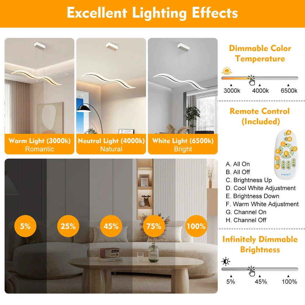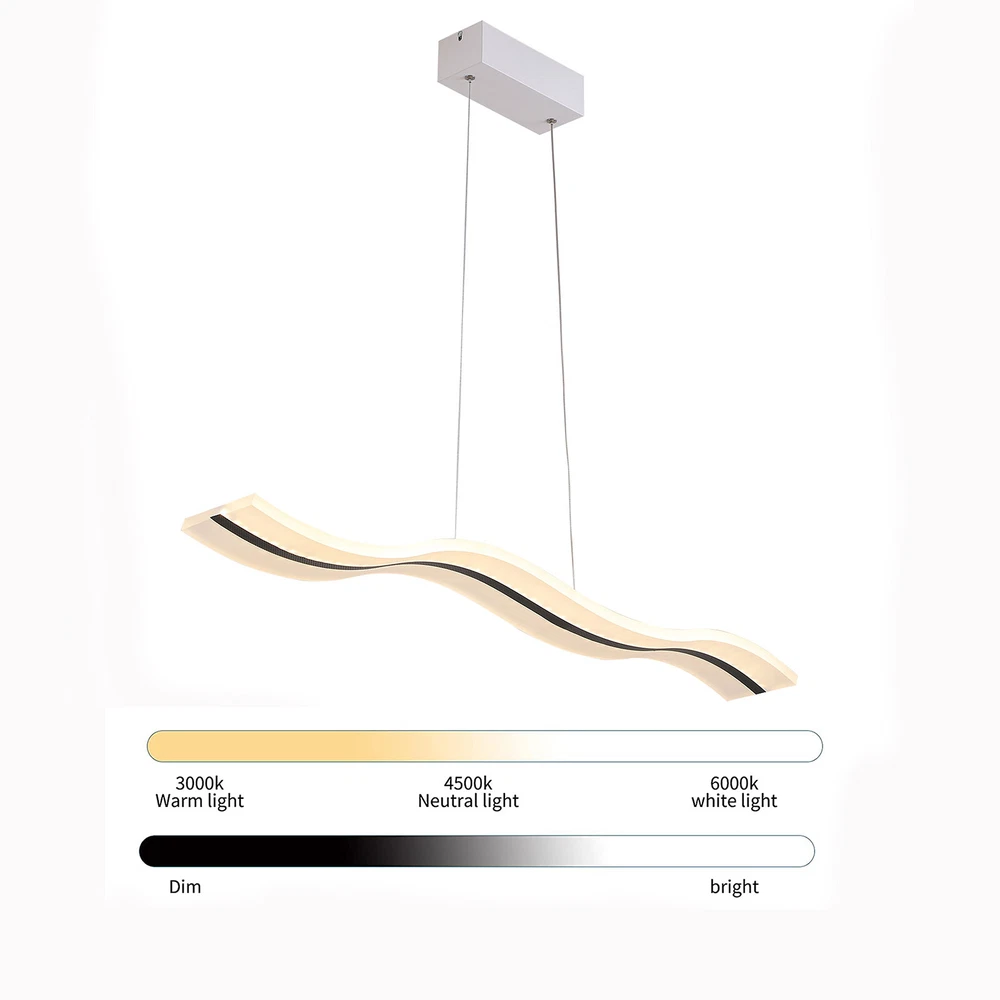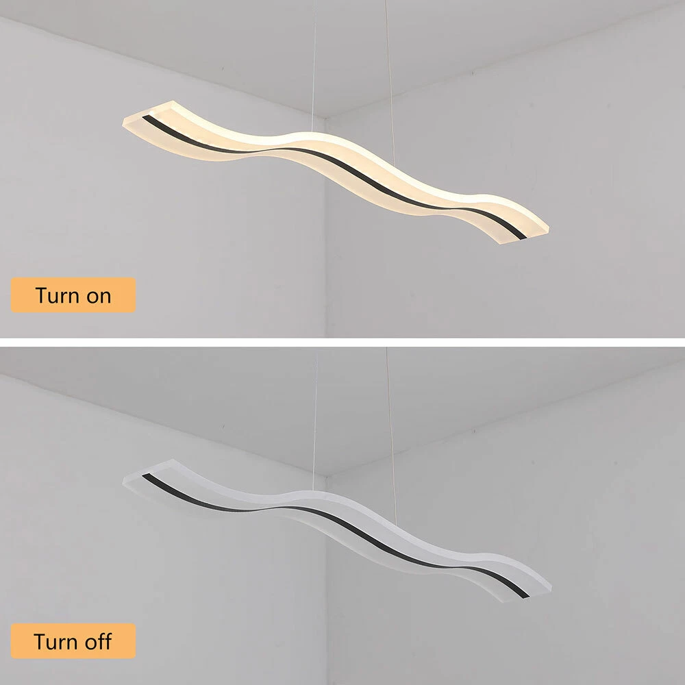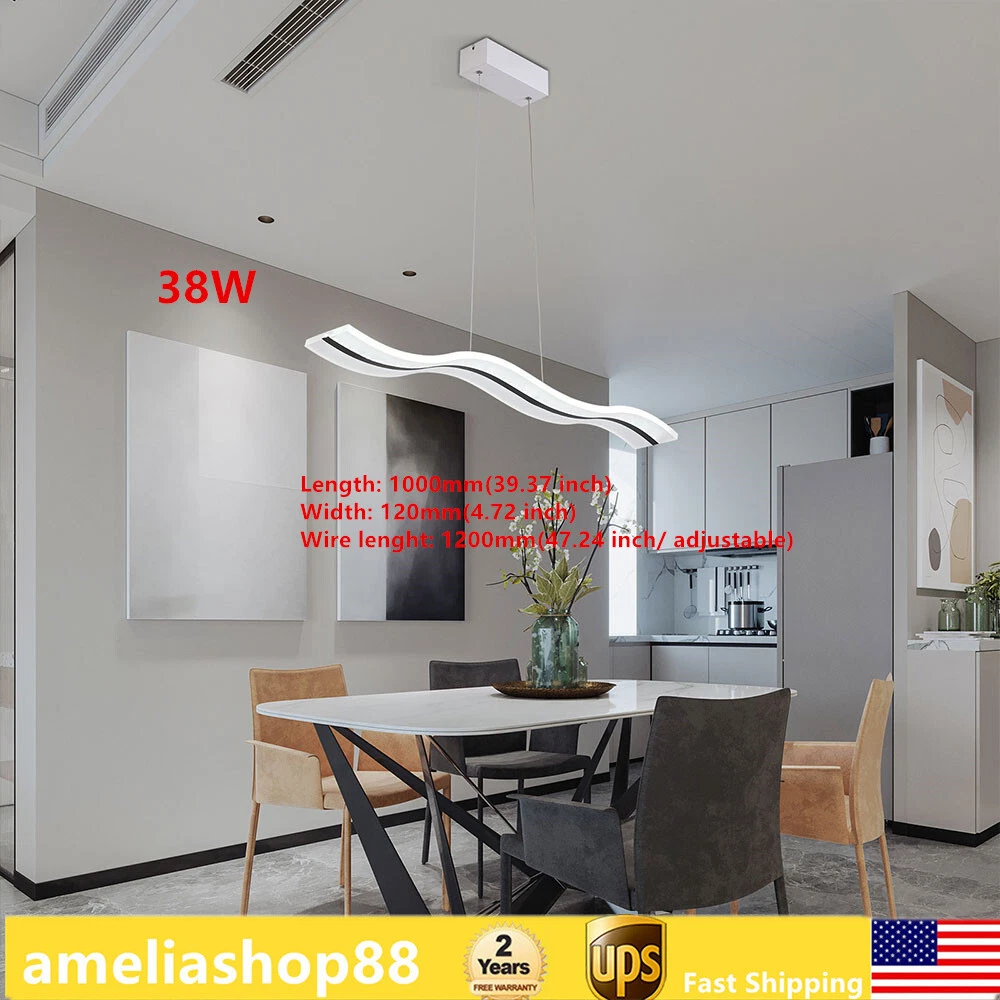Modern Acrylic LED Chandelier Linear Belt Wavy Drop Pendant Lamp Light Fixtures Specification: Material: Advanced Aluminum Casting and Acrylic Length: 1000mm(39.37 inch) Width: 120mm(4.72 inch) Wire lenght: 1200mm(47.24 inch/ adjustable) Dimmable: (come with remote control) Light source: LED Wattage: 38W Suitable Voltage: 100V-240V Base size: 26cm*5cm*4cm Installation Type: Pendant light Shape: Wave Area: 8-10㎡ Pattern: Stepless Dimming-With remote control (3000K-6500K) Size:100X12cm/39.37"X4.72"(appr.) klick-to-buy4u Modern Acrylic LED Chandelier Linear Belt Wavy Drop Pendant Lamp Light Fixtures Specification: Material: Advanced Aluminum Casting and Acrylic Length: 1000mm(39.37 inch) Width: 120mm(4.72 inch) Wire lenght: 1200mm(47.24 inch/ adjustable) Dimmable: (come with remote control) Light source: LED Wattage: 38W Suitable Voltage: 100V-240V Base size: 26cm*5cm*4cm Installation Type: Pendant light Shape: Wave Area: 8-10㎡ Pattern: Stepless Dimming-With remote control (3000K-6500K) Size:100X12cm/39.37"X4.72"(appr.) Description 1. Application : Perfectly suitable for Dining Room, Bedroom, Living Room , Kids Room, Hallway, Hotel,Restaurant,and Company Reception and so on .It is bright,safe and dimmable .High standard High-end ,luxury, it will make your room more elegant. 2. Superior Design : Modern luxurious Wave design ,Like the ocean waves, brings more brilliance to your life,highlights your taste.It is dimmable and has remote control .You can dim the pendant light freely , 3000K-6500K, Warm White , Neutral White , Cool White , you can choose the light temperature whatever you want , Easy to enhance the atmosphere of the room. 3. High Quality Material: Made of Advanced Aluminum Casting and Acrylic . Robust, Secure, Good vibration resistance and Perfect Finishing Color.The sling is made of sturdy steel wire, which is firm, weighed, good vibration resistance and won't break.Acrylic is light transmissive and does not change color. 4. Easy to installation: Suitable for US junction box standard.Just connect to the reserved wire directly and fully compatible to 100v-240v. No switch or cord on the light. 5. Energy Saving And Ultra Bright Chips : More durable and refraction effect is good. 36W Dimmable Payment Delivery details Terms of sales About us Contact us Payment We accept ebay payment 。 Fees such as import duties, taxes are not included in the item price or shipping costs. These charges are the buyer's responsibility. Delivery details Shipping: 2-9 working days to: USA Terms of sales We maintain high standards of excellence and strive for hundred percent customer satisfaction. Feedback is very important to us. We hope that you contact us immediately before you give neutral or negative feedback, so that we can address your concerns. It is impossible to address issues if we do not know about them! About us Your satis faction is our ultimate goal. We work hard to earn your trust and future business. Our certified technicians have tested each item before shipping. The unit comes with 1 year limited warranty on all manufacturing defects. a) If you receive a defective item, you may return it or ask for a discount. Please contact us within 14 days after you receive the package. b) What you returned must be intact and in its original packaging as re? u. Customer is responsible for shipping costs of the returned item. c) We will cover the cost of shipping back t with the shipping rate indicated in the registration page. We will send you a new unit or refund the full payment you paid. Thank you. Contact us Business Hour Business Hour: Monday To Friday: 8:30 AM to 5:00 PM (Beijing China time) Due to time zones, our reply to your questions may not be immediately. But within above working time, we will reply your email within 24 hours. If it's non-workdays, please kindly be patient and wait till Monday. Please contact us with ebay message. Please feel free to contact us if you have any questions. Monday To Friday: 8:30 AM to 5:00 PM (Beijing China time) Due to time zones, our reply to your questions may not be immediately. But within above working time, we will reply your email within 24 hours. If it's non-workdays, please kindly be patient and wait till Monday. Please contact us with ebay message. Please feel free to contact us if you have any questions. On Jan 10, 2025 at 00:17:23 PST, seller added the following information: