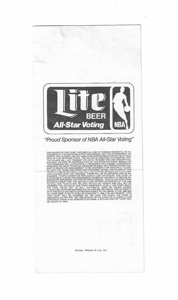 38th Annual NBA All Star Game Ticket Stub From February 7, 1988 Here is 1 38th Annual NBA All-Star Game Ticket Stub from February 7, 1988. The 38th Annual NBA All Star Game took place at The Chicago Stadium in Chicago, Illinois. Michael Joran was the MVP with a game high 40 points. The east won the game 138-133 The ticket is in fair condition and would make an excellent addition to your collection. Payment Payment is due within 24 hours of sale. Shipping Your item will be shipped within 24 hours of receipt of payment via US Priority Mail. Terms and Conditions All Sales are final. No Refunds