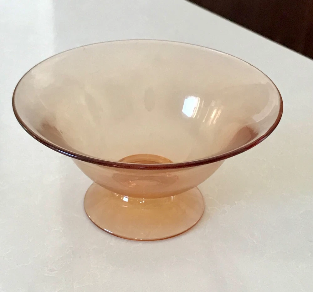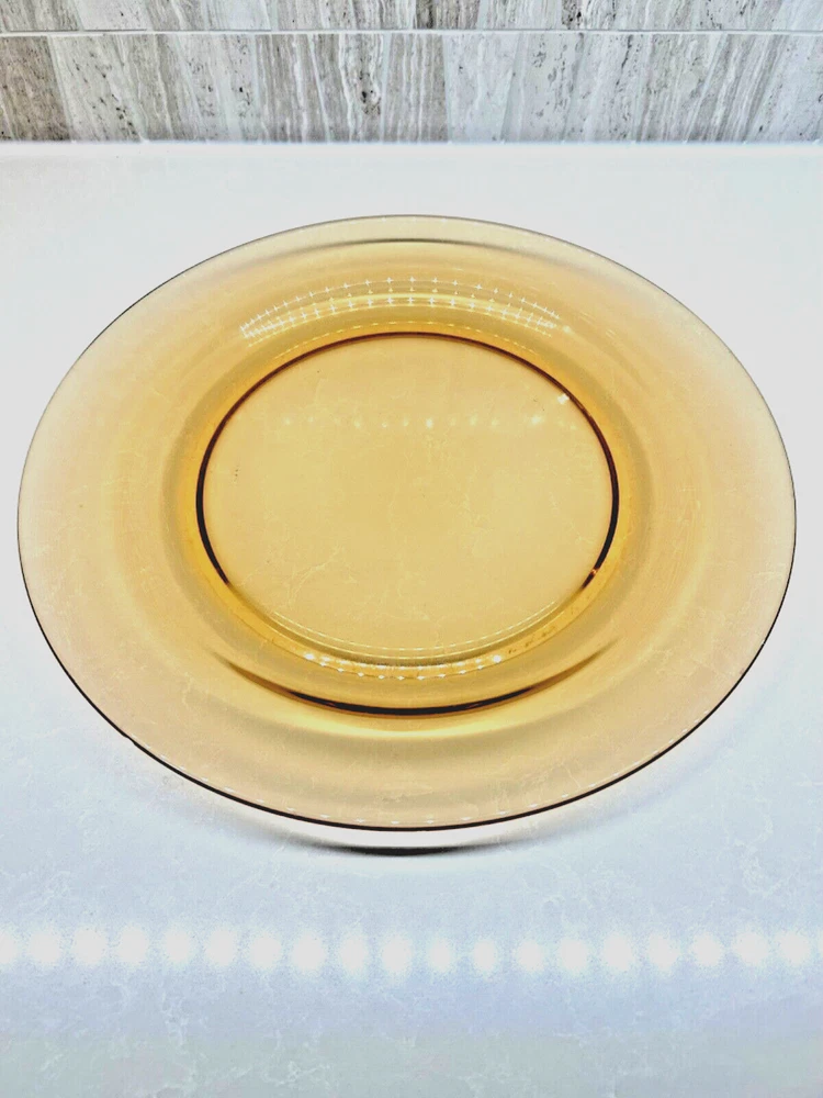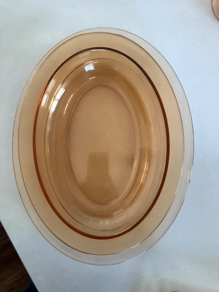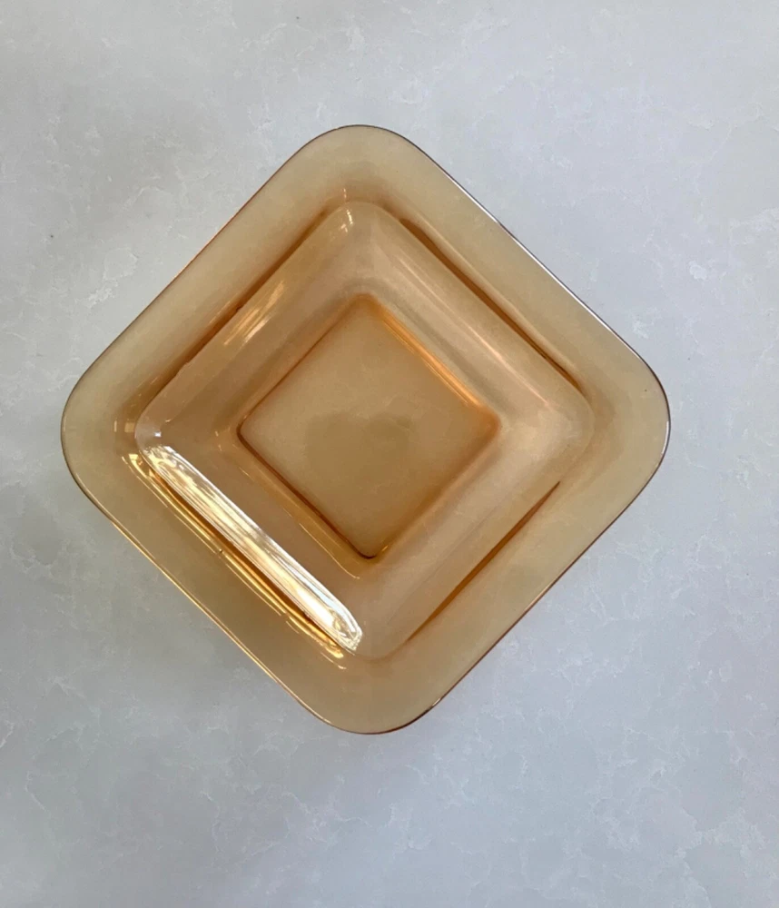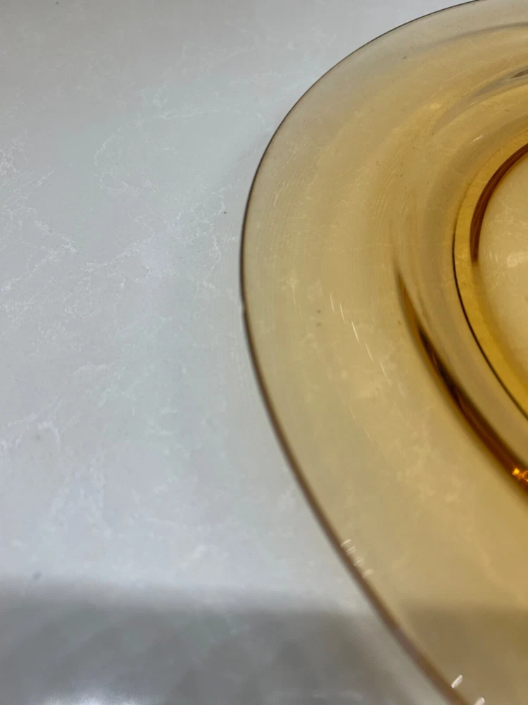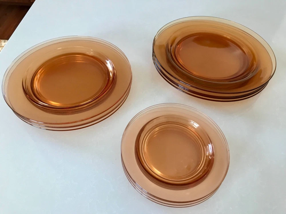 Beautiful 30 piece set of 1930s Depression Era amber glass dishwater. 4-6 place settings with several serving pieces -- extremely rare set! 4 pieces have barely noticeable chips; 3 serving pieces (oval casserole, 1 dinner plate and 1 dessert plate) have minute chips on the underside, so that one can feel them, but difficult to see. The square candy dish has 2 small chips on one inside edge. Please refer to photos. Set contains: 4 dinner plates - 9-1/2" diameter 4 salad plates - 8-1/2" diameter 4 roll plates - 6" diameter 4 dessert plates - 7-1/2" diameter 4 soup bowls - 6-1/2" diameter 6 dessert bowl plates or saucers - 6-1/4" diameter 6 dessert bowls - 5-1/2" diameter 1 oval serving plate - 12-1/4" x 9-1/4" 1 oval casserole - 10-1/4" 7-3/4" 1 medium serving plate - 8-1/2" 2 octagonal serving plates - 8" wide 1 footed nut bowl - 5-1/2" diameter x 3" tall 1 candy dish - 5-1/2" square Feel free to message with questions. Will ship via UPS Ground Saver unless alternate service selected.