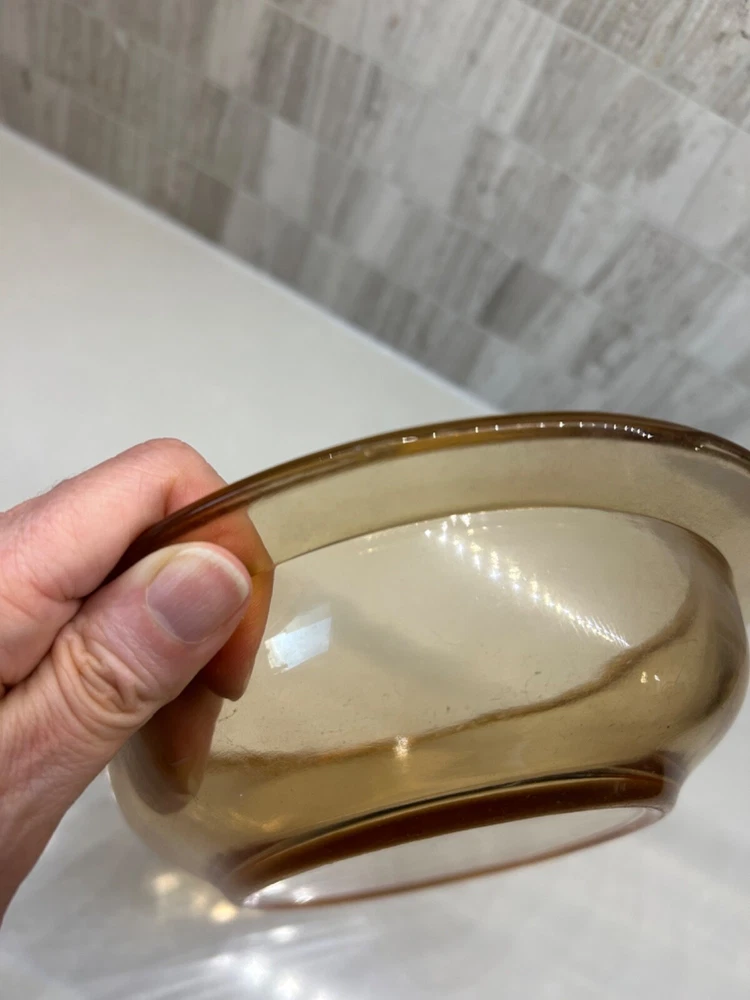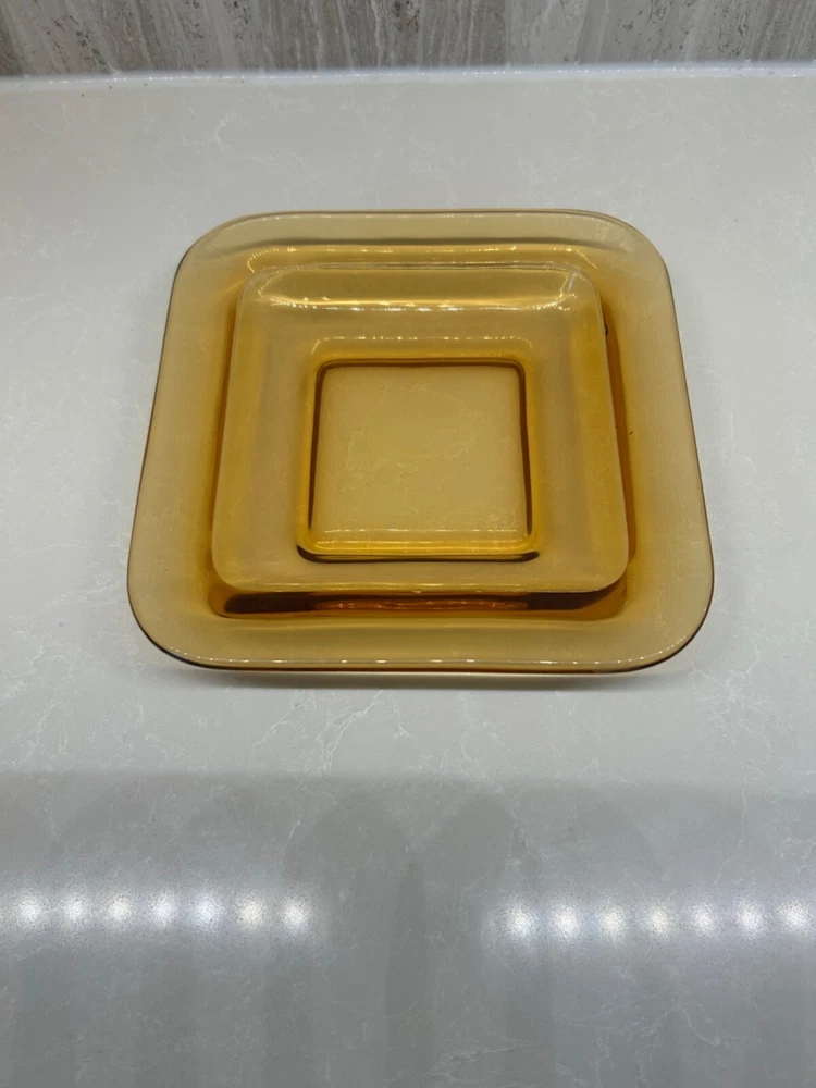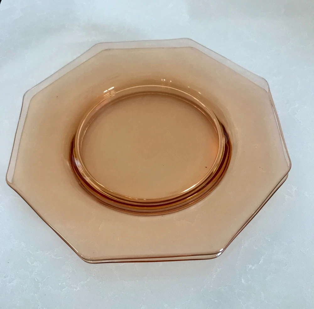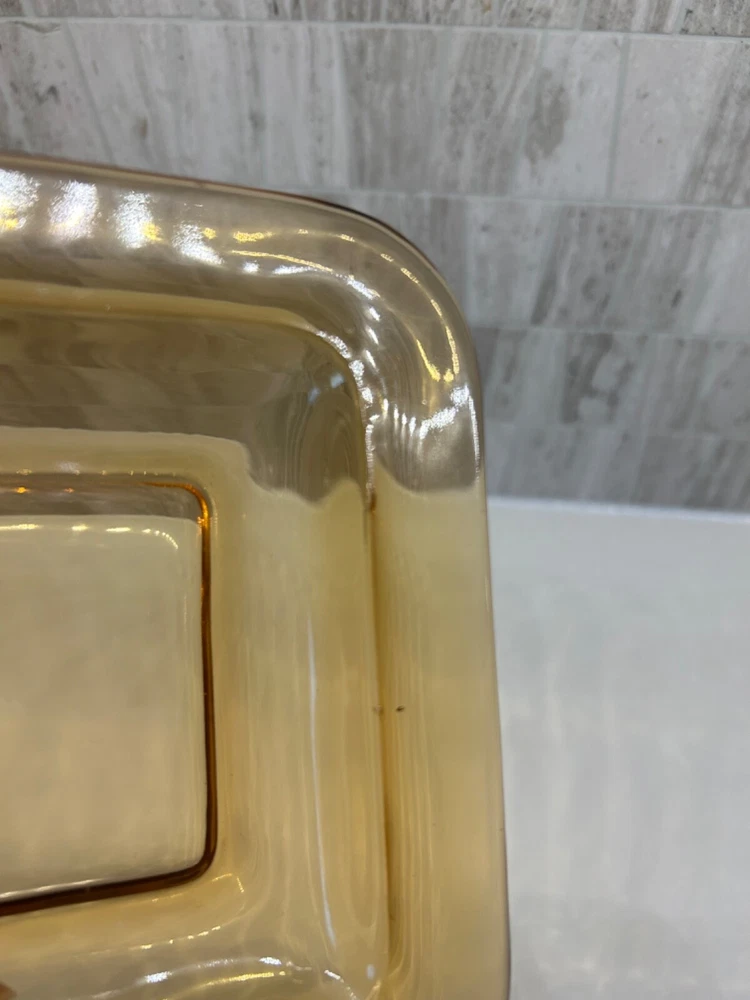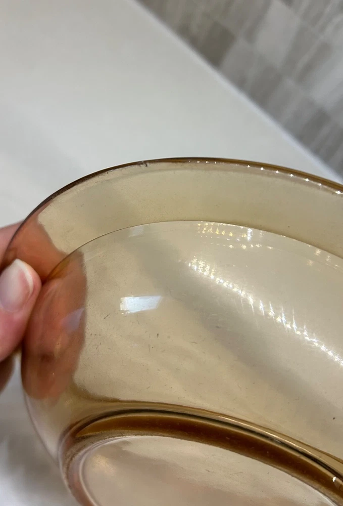 Beautiful 30 piece set of 1930s Depression Era amber glass dishwater. 4-6 place settings with several serving pieces -- extremely rare set! 4 pieces have barely noticeable chips; 3 serving pieces (oval casserole, 1 dinner plate and 1 dessert plate) have minute chips on the underside, so that one can feel them, but difficult to see. The square candy dish has 2 small chips on one inside edge. Please refer to photos. Set contains: 4 dinner plates - 9-1/2" diameter 4 salad plates - 8-1/2" diameter 4 roll plates - 6" diameter 4 dessert plates - 7-1/2" diameter 4 soup bowls - 6-1/2" diameter 6 dessert bowl plates or saucers - 6-1/4" diameter 6 dessert bowls - 5-1/2" diameter 1 oval serving plate - 12-1/4" x 9-1/4" 1 oval casserole - 10-1/4" 7-3/4" 1 medium serving plate - 8-1/2" 2 octagonal serving plates - 8" wide 1 footed nut bowl - 5-1/2" diameter x 3" tall 1 candy dish - 5-1/2" square Feel free to message with questions. Will ship via UPS Ground Saver unless alternate service selected.