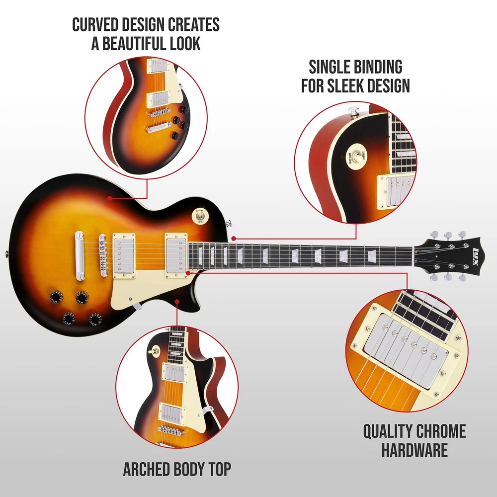 YOUR ROCK & ROLL JOURNEY STARTS HERE | Beginner’s Guitar Set Includes a 39” SB Series LP Inspired Guitar, [2] Picks & Detailed Learning Guide for Novice, Intermediate & Expert Players of All Ages | Learn to Play on a Professional-Quality Instrument that Looks, Sounds, Feels & Performs Like the Real Deal with All the Accessories You Need to Get Started [Amplifier & Amp Cable Not Included] STUNNING SOLID-BODY CONSTRUCTION | Expertly Designed Hardwood Guitar is Shaped & Styled for Maximum Playing Comfort, Peak Sound Performance, Lightweight Durability & Cool Vintage Appearance Including Smooth Mahogany Wood Body/Neck & Durable Mounted 3-Ply Pickguard | Available in a Variety of Vibrant Colors & Sunburst Patterns in Left-Handed & Right-Handed Orientations RICH, DYNAMIC, TRUE-TO-LIFE SOUND | With its Nostalgic Curved Design, Single White Binding, Arched Body Top & Quality Chrome Hardware, Our Old-School Style Instrument Strums Like a Dream, Offering the Perfect Blend of Comfort, Style & Playability | 3-Way Rhythm/Treble Pickup Switch Selector Delivers Dynamic Response with Gorgeous Tones Ranging from Warm & Mellow to Thick & Cutting SLEEK CONTROLS FOR VOLUME & TONE | Once You’ve Mastered Your Strumming, Melodies & Chord Progressions, Experiment with Different Volume Settings & Tone Intensities Via the Built-In Rotary Control Knobs | Our Fully-Loaded Guitar Also Features a Signature Headstock with Sealed Tuners to Prevent Dust Buildup, Set-In Neck for Added Strength, Integrated Strap Posts & [2] Heavy-Duty Humbuckers PLUG IN TO SUPERCHARGE YOUR PLAY | Go from Practice to Stage in No Time with a Convenient Aux Connection Output Jack with Your Favorite Amplifier | This Legendary 6-String LP is Primed for Solo Play, Jamming with the Band & Performing Live Indoors or Outside | Give the Gift of Great Music for Boys, Girls, Men & Women for Birthday, Christmas, Graduation, Holiday, Anniversary & More
