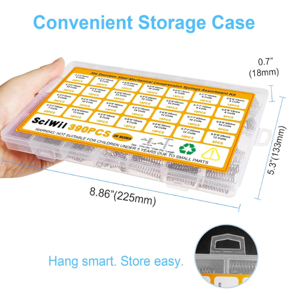 390PCS Compression Springs Assortment Kit 28 Different Sizes Mini Stainless S US Warehouse - FREE & FAST Shipping in US Product Description: 【390-PIECE COMPREHENSIVE SET】 Includes 28 different sizes of compression springs (wire diameter range from 0.3-0.8mm; Outer Diameter range from 2-8mm; Free Length range from 5-30mm), covering most common applications in DIY projects, automotive repairs, industrial machinery, and household fixes. No more searching for individual springs 【PREMIUM CONSTRUCTION】 Made of high-quality 304 stainless steel, these springs resist rust, corrosion, and wear, ensuring long-lasting performance even in humid or high-stress environments. The stainless steel spring may exhibit slight magnetism due to manufacturing processes like cutting and forming. This is a normal characteristic and will not impact its performance 【EASY STORAGE & QUICK ACCESS】 Springs come in a reusable compartmentalized case with labeled sections, keeping your workspace tidy and saving time on projects 【WIDELY USED】 Ideal for garage organizers, robotics, valves, printers, agricultural equipment, and more. A must-have for mechanics, engineers, hobbyists, 3D printer and homeowners Feedback: 1.Any question for your order, please contact us in time, we will reply to you within 24 hours and give you a satisfactory answer. 2.If you are satisfied with our products and services, hope to take up your a little precious time to leave feedback reviews for our products.Thanks! 3.Your satisfaction is our effort. Welcome to order again! Have a great day! Our Policy: 100% Satisfaction Guarantee 20% of restocking fee will be charged for return item