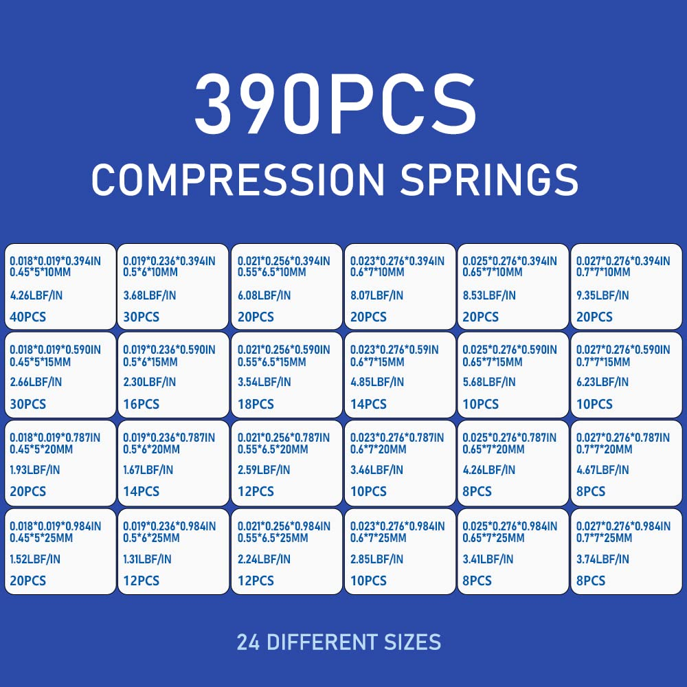 Store New Arrivals Add to Favorite View Feedback Contact Compression Springs Assortment Kit, 390 Pcs 24 Different Sizes Stainless Steel Springs, Spring Assortment for Shop and Home Repairs Description Item model number Compression Springs Assortment Kit Package Dimensions 7.4 x 5.12 x 0.75 inches; 6.74 ounces Manufacturer SENMULIN Anti-Rust Material: stainless steel 304 wire, will not rust in humid environment, has strong anti-oxidation, anti-acid, anti-corrosion ability. Easy To Storage and Use: All compression springs are neatly packaged in plastic storage boxes, and size labels can be used to identify spring size. Versatile: 24 sizes of springs to choose from for home repairs. We hope this spring combination kit is suitable for most repair items such as doors, curtains, cars, bicycles, pianos, scissors, electrical equipment, repair tools, umbrellas, antique tape recorders, repair toys, pliers, etc. Reliable Quality: professional design, rigorous calculation, precision manufacturing, and effective testing. Size: [A×B×C] A is the wire diameter, B is the outer diameter, C is the free length, the first category is 0.018*0.0197*0.394/0.590/0.787/0.984IN, the second category is 0.0197*0.0236*0.394/0.590/0.787/0.984IN, the third type is 0.0217*0.256*0.394/0.590/0.787/0.984IN, the fourth type is 0.0236*0.276*0.394/0.590/0.787/0.984IN, the fifth type is 0.0236*0.276*0.394/0.590/0.787/0.984IN 0.276*0.394/0.590/0.787/0.984IN, six types are 0.0276*0.276*0.394/0.590/0.787/0.984IN Product Description ABOUT US We offer the best prices around on high quality products. Our E-store includes media such as books, movies, music and games while offering electronics, toys, sporting apparel, clothing, tools, general home, garden items and more. SHIPPING We are always working hard to ensure your package arrives as soon as possible. Please understand that some factors like weather, high postal traffic, and the performance of shipping companies are outside of our control. We offer free shipping to the lower 48 states and ship within 2 business days of payment, usually sooner. We do not accept P.O. Boxes. Please provide a physical address. RETURNS We offer a 30-Day Return Policy on items which you are not completely satisfied with. You have the option for a full-refund or an exchange of the item. No returns are available on items shipped outside of the USA. PAYMENT We accept PayPal. CONTACT US This page content is yet to come Please ad us to your favorite seller and visit again later Thank You CUSTOMER SATISFACTION We try our very best to make sure every customer is completely satisfied. If there's a problem, message us! We're happy to help.