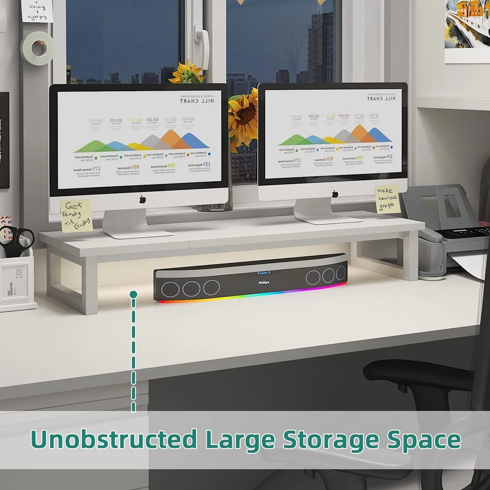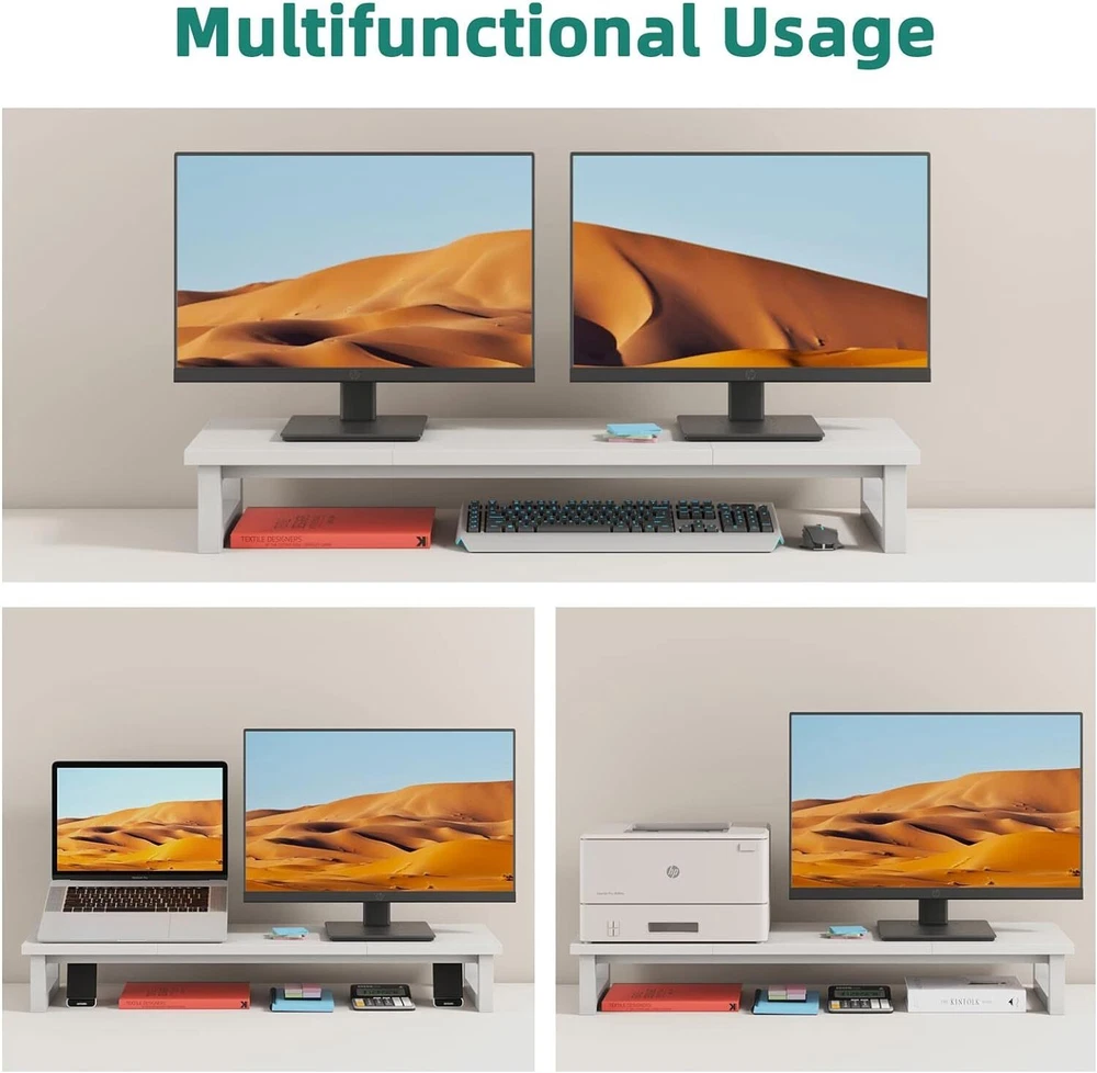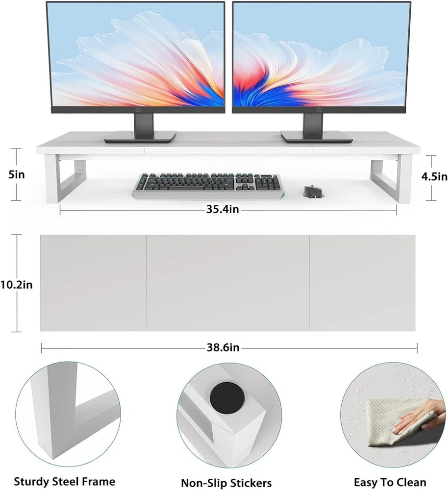 Product Description Dual Monitor Stand Riser, 39Inch Large Monitor Stands For 2 Monitors, Computer Monitor Stand, Wooden Desktop Oraganizer Shelf For Office Desk Computer,Laptop,Tv 【Large Monitor Stand】The Dimensions Of The Desktop Riser Is 38.6"L X10.2 "W X 5"H. Computer Monitor Stands For 2 Monitors/Laptop/Tv. This Is An Ideal Choice When You Need Multiple Computers To Work Together 【Steel Leg Monitor Stand】Extremely Sturdy And Stable,This Monitor Stand'S Max Weight Capacity Can Up To 100 Pounds. Heavy-Duty Steel Footing, You Don'T Have To Worry About Collapsing Or Shaking During Use. Each Leg Has Non-Slip Pads To Protect Desk Away From Scratching 【Multi-Purpose Stand】Monitor Stand Riser Provides A Nice Workspace, It Can Be Used As A Computer Monitor Stand, Monitor Riser Stand, Printer Stand, Laptop Stand, Tv Riser Stand Etc. Desktop Organzier Shelf Offer Extra Space To Store Your Keyboard Or Other Accessories Under Your Monitor 【Ergonomic Height】Improving Your Posture By Elevating Your Monitor To The Needed Ergonomic Viewing Height, Monitor Riser Can Effectively Relieve Your Neck Pain 【Easy To Install】10 Mins Quick And Easy To Assemble. The Package Has Instruction And Tool Inside. If You Have Any Question, You Can Feel Free To Contact Us About Us We are a reputable seller with many years of experience selling on eBay. Our goal is to provide high-quality products and excellent customer service. Shipping Items will be shipped within 1-3 business days when we received payment. (Orders are not processed on weekends & holidays) Tracking information will be sent once item is shipped. Delivery time depends on destination and other factors Item is shipped to ebay address. Leaving correct address can minimize delay. For international shipping and shipping to Guam, Hawaii and Alaska, Please contact us before placing the order. International buyers please note: Import duties, taxes and charges are not included in the item price or shipping charges. These charges are buyer’s responsibility. We will try our best to reduce the risk of the custom duties. Local pick-up is unavailable at the moment. Contact Us We reply any email messages within 1 business / working days(off-duty at weekend). If you do not get a response from us, then please check your junk or spam mailbox. Our Business hours: Mon-Fri 9:00-18:00, UTC/GMT +8 hours. Please contact us either by clicking "contact seller" in the "purchase history" section or simply click "ask a question" at the bottom of this page. If you are unsatisfied with our item or service, please contact us before leaving any feedback. We are committed to resolve all issues in a friendly and satisfactory manner.