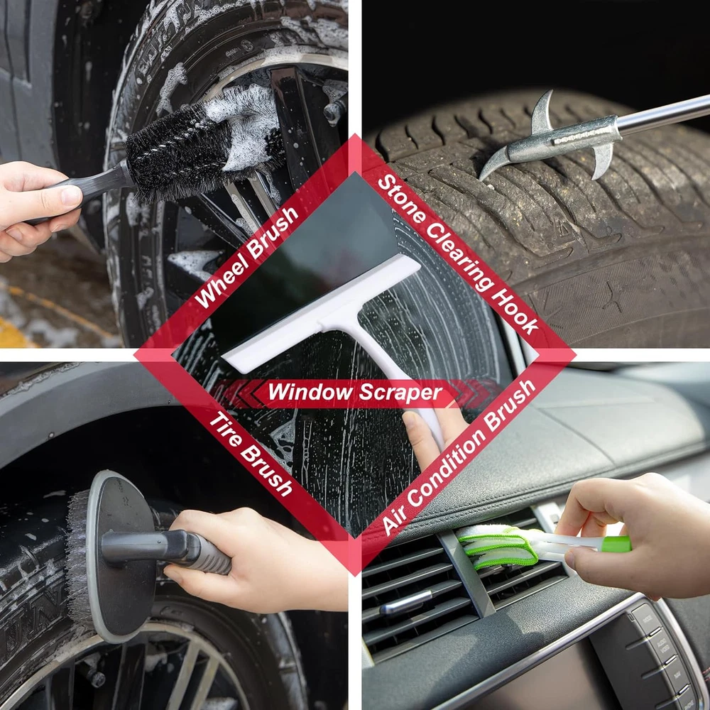 Store New Arrivals Add to Favorite View Feedback Contact 39Pcs Car Wash Cleaning Kit with Foam Gun Sprayer Detailing Brushes Collapsible Bucket Windshield Cleaning Tool Tire Brush Towels Complete Interior Exterior Detailing Set for Car Description Item model number GPAA003-XC-39P-Red Brand GPUSFAK Country of Origin China Manufacturer Part Number GPAA003-XC-39P-Red Item Weight 4.77 pounds Manufacturer GPUSFAK Package Dimensions 13.86 x 10.71 x 6.1 inches Size 39Pcs 39Pcs Car Wash Kit: 1 low-pressure foam gun with twist nozzles and quick coupling, 1 collapsible bucket, 1 windshield cleaning tool and 100 ml spray bottle, 1 stone clearing hook, 4 car hooks, 1 wash sponge, 2 wax applicator pads, 1 hub brush, 1 window water scraper, 1 air conditioner brush, 5 detailing brushes, 3 wire brushes, 1 tire brush, 1 large wash mitt, 2 towels, 1 duster, 1 storage bag Complete Car Cleaning Kit: The 2-in-1 functional foam gun can be flexibly adjusted to spray foam or water mode for quick car washing. The 180° rotating car windshield tool helps to easily clean the interior car glass as well as its edge area. Stone clearing hook helps to clean rocks off your tires and extend the life of your tires. Car wash sponge and wax pads is great for keeping your car clean and new. 4 headrest hooks help you organize your interior clutter Premium Cleaning Tools: Car cleaning towels are made of soft and durable materials. Please wash them before use. Large waterproof car wash gloves protect your hands from injury. The window water scraper helps to clean the car windows quickly. Brushes of different sizes and materials help you clean the nooks and crannies of your car with ease Scope of Application: Our automotive cleaning kits can be used for interior and exterior cleaning and waxing of cars, trucks, motorcycles, RVs and more. They can also be used to clean your home or office area for all your cleaning needs High Quality Car Wash Kit: Our car cleaning kit helps you clean your car quickly and efficiently. It is perfect for everyone who drives a car. You can give it to your friends and family on Thanksgiving, Christmas and other holidays Product Description GPUSFAK 39Pcs Car Wash Cleaning Tools Kit Set Products Include: 39PCS CAR WASH KIT: 1 low-pressure foam gun with twist nozzles and quick coupling, 1 collapsible bucket, 1 windshield cleaning tool and 100ml spray bottle, 1 stone clearing hook, 4 car hooks, 1 wash sponge, 2 wax applicator pads, 1 hub brush, 1 window water scraper, 1 air conditioner brush, 5 detailing brushes, 3 wire brushes, 1 tire brush, 1 large wash mitt, 2 towels, 1 duster, 1 storage bag. · The most comprehensive car wash kit dedicated to making your cleaning easy. · Space-saving, lightweight and quite easy to carry with. · The 2-in-1 functional foam gun can be flexibly adjusted to spray foam or water mode, and the regulator on the handle helps you easily fix the water pressure for an efficient car wash. Insert the siphon Assemble the spray gun switch handle with the spray gun Foam rod inserted into mixing head Screw the bottle onto the mixing head Safety latch Adjustable Foam Ratio Dial 0-5 Water pipe quick connector Joint installation process for connecting 1/2" hose ABOUT US We offer the best prices around on high quality products. Our E-store includes media such as books, movies, music and games while offering electronics, toys, sporting apparel, clothing, tools, general home, garden items and more. SHIPPING We are always working hard to ensure your package arrives as soon as possible. Please understand that some factors like weather, high postal traffic, and the performance of shipping companies are outside of our control. We offer free shipping to the lower 48 states and ship within 2 business days of payment, usually sooner. We do not accept P.O. Boxes. Please provide a physical address. RETURNS We offer a 30-Day Return Policy on items which you are not completely satisfied with. You have the option for a full-refund or an exchange of the item. No returns are available on items shipped outside of the USA. PAYMENT We accept PayPal. CONTACT US This page content is yet to come Please ad us to your favorite seller and visit again later Thank You CUSTOMER SATISFACTION We try our very best to make sure every customer is completely satisfied. If there's a problem, message us! We're happy to help.